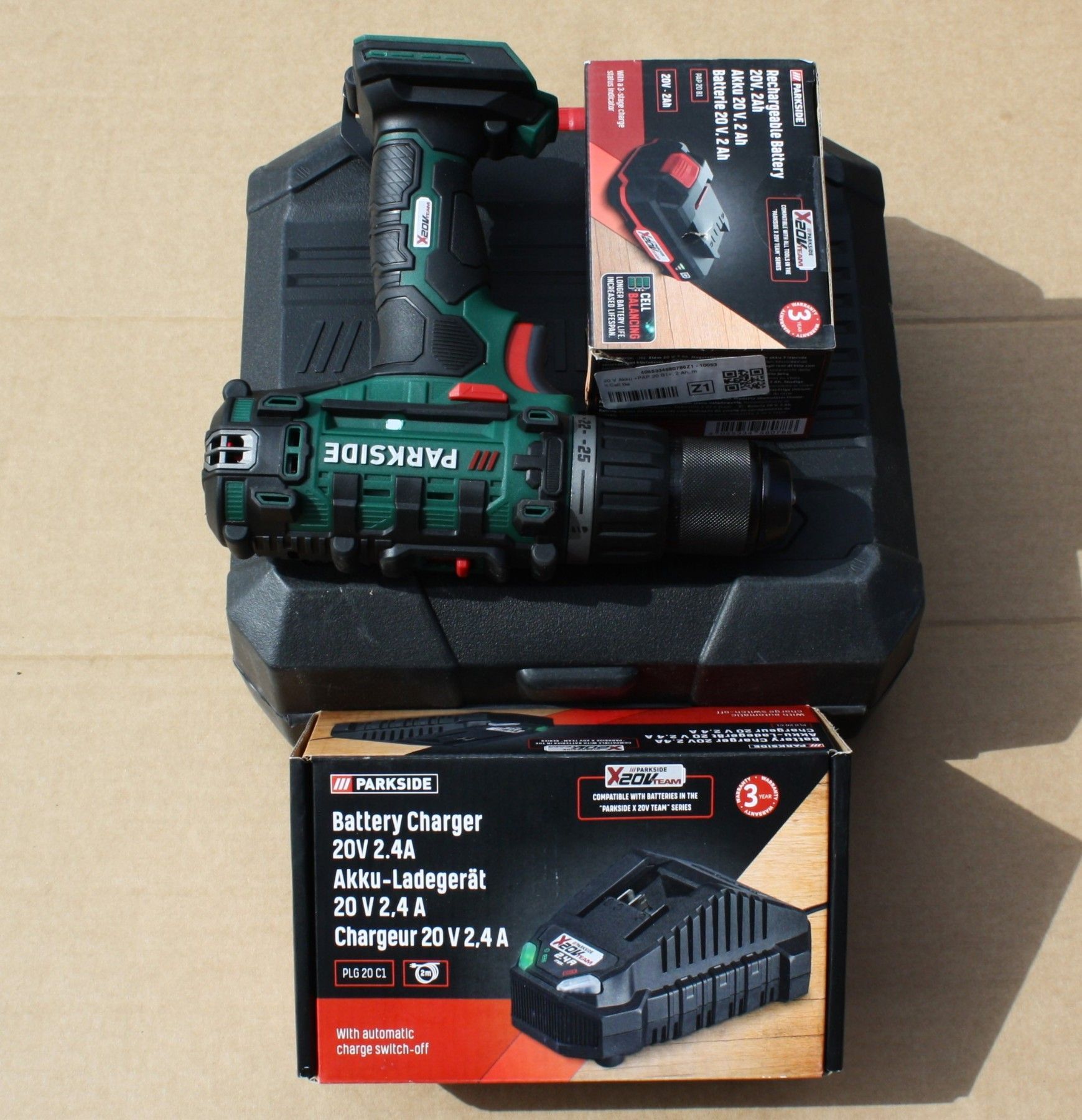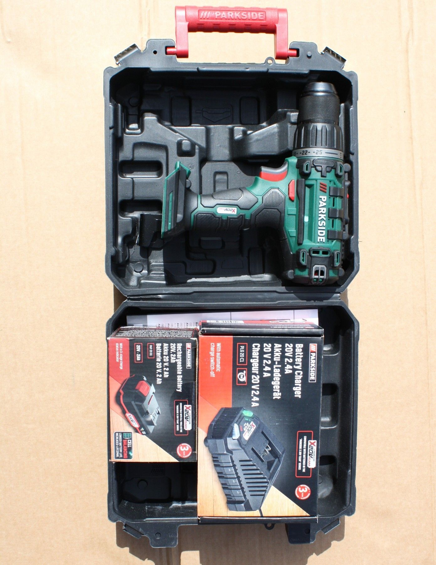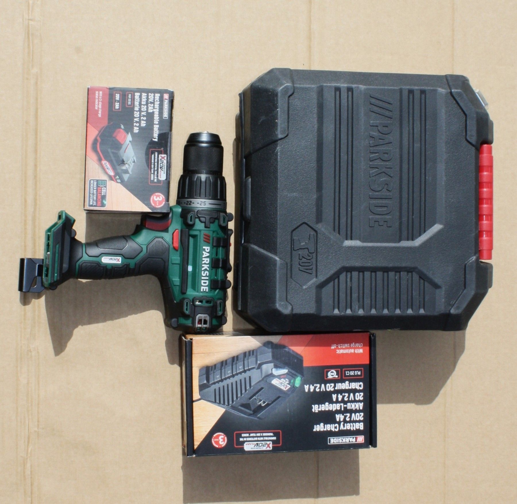 Ausstellungsstück mit voller Funktion geringe Gebrauchsspuren Parkside 20V Akku-Bohrschrauber 2 Gänge 45 Nm 1500 rpm Lieferumfang wie abgebildet Bohrschrauber, Koffer (leicht beschädigt) Buch, 2Ah Akku, Ladegerät Hinweise zur Batterieentsorgung Im Zusammenhang mit dem Vertrieb von Batterien oder mit