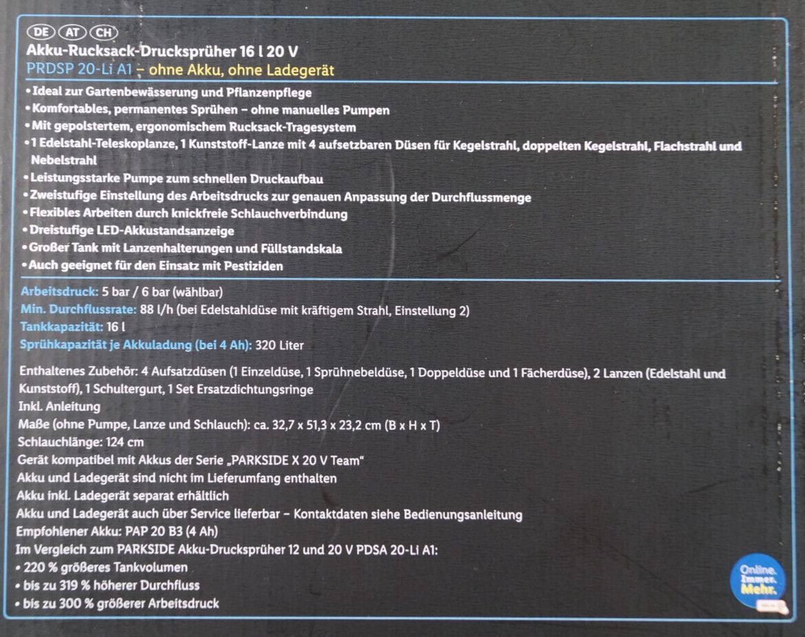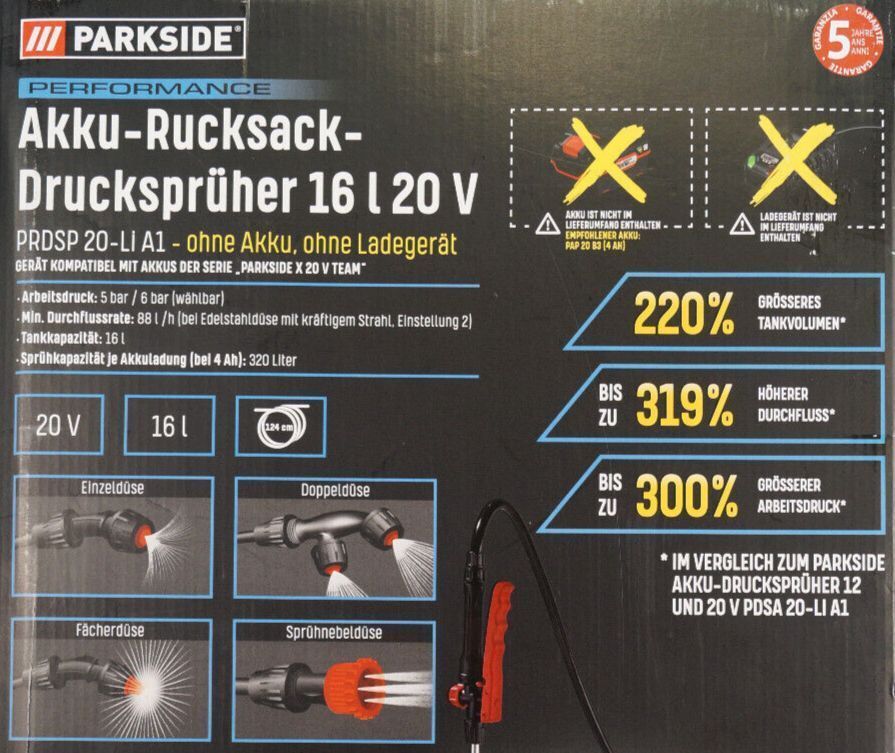 Parkside Parkside Akku Rucksack Druckspréher 16L Réckenspritze Pflanzenspréher Spritze