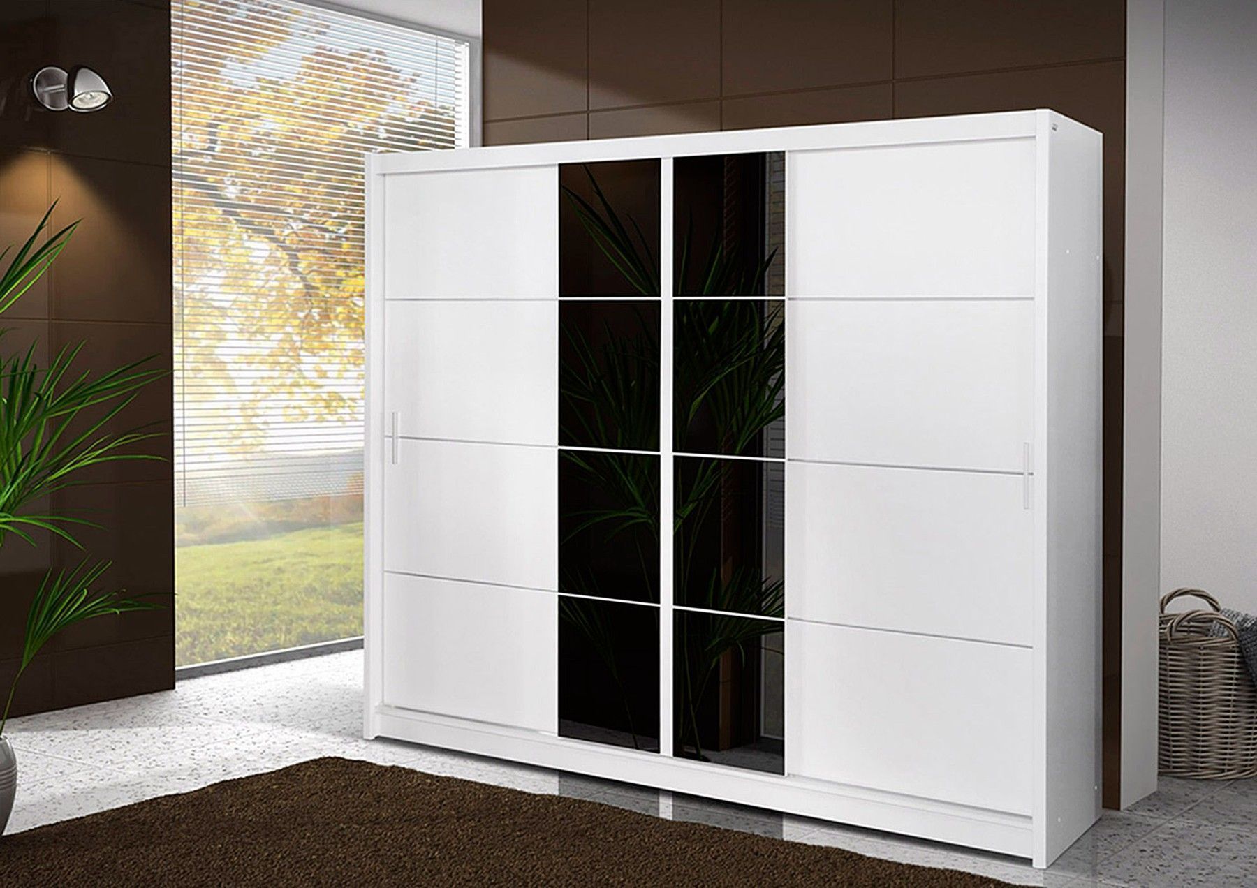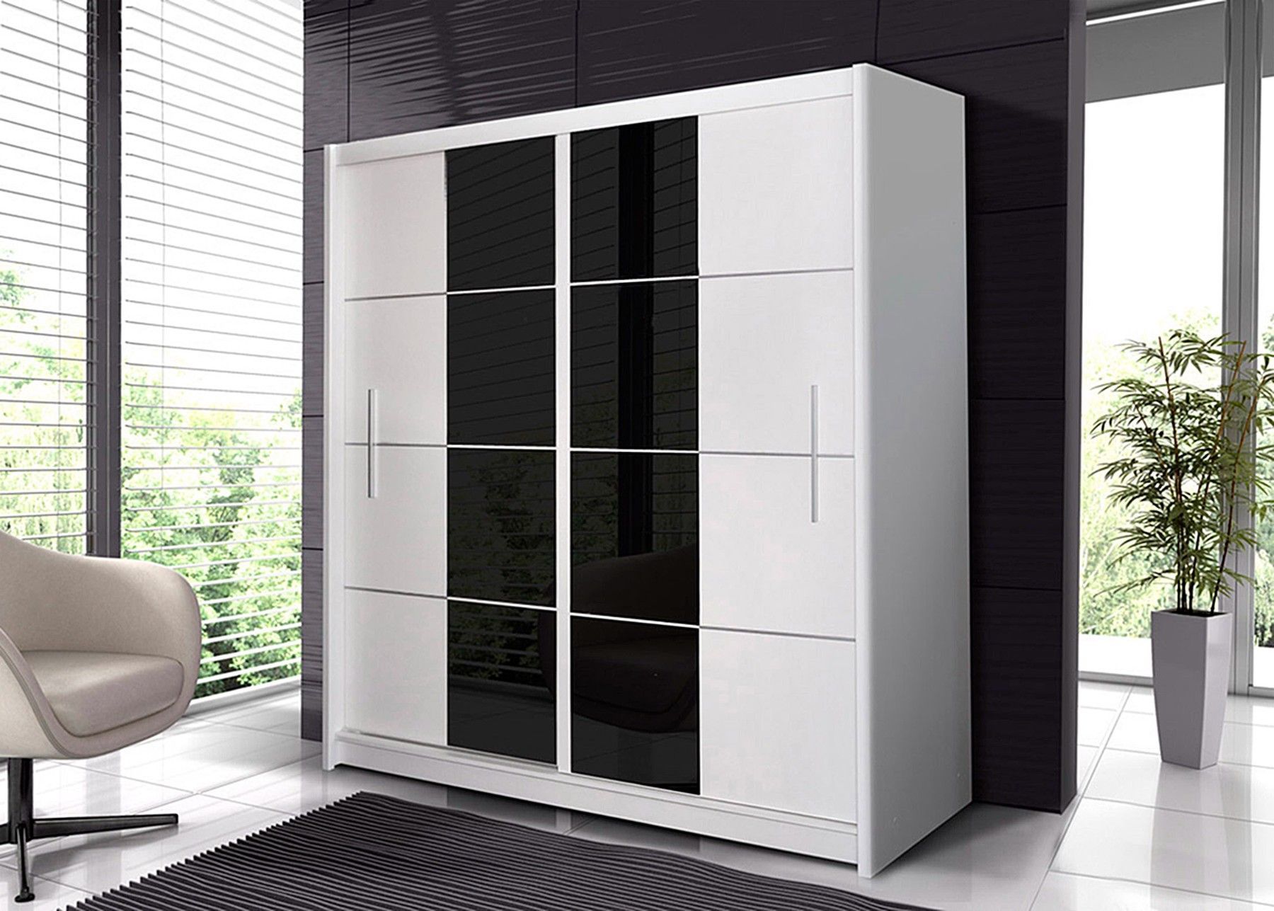 017666076782 Schrank - Parto SPEZIFIKATION Ma ße: Breite: 203 cm 250 cm Höhe: 215 cm Tiefe: 61 cm Farb e: Weiß mit Schwarzen Glas Produktbeschreibung Der Kleiderschrank ist aus laminierter Platte. Der Schrank hat zwei Schiebefronten und ein schwarzes Glasdekor in der Mitte und
