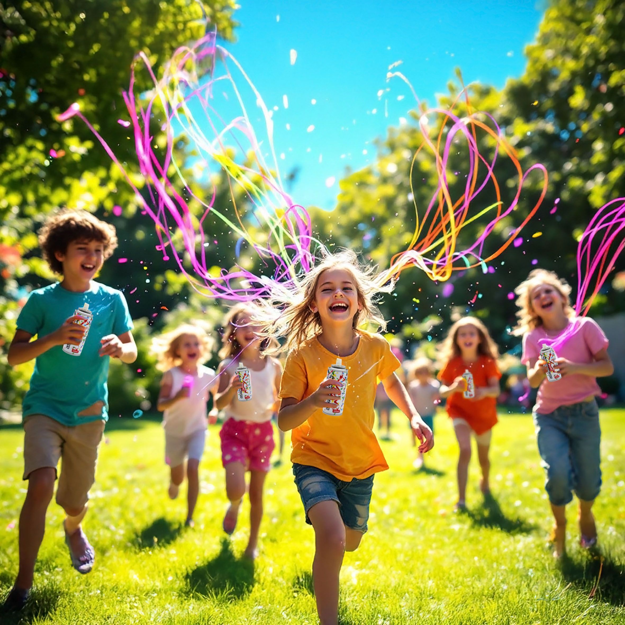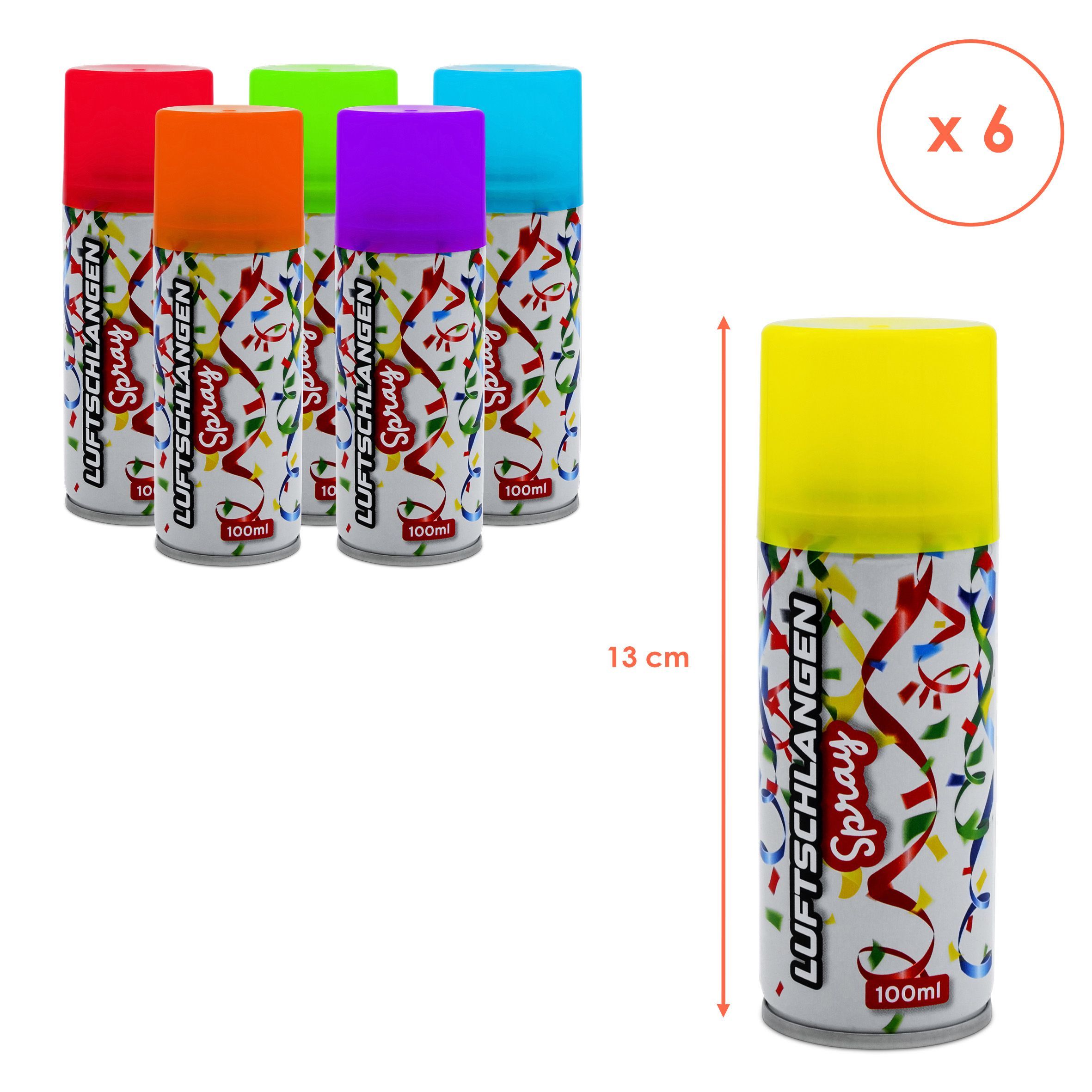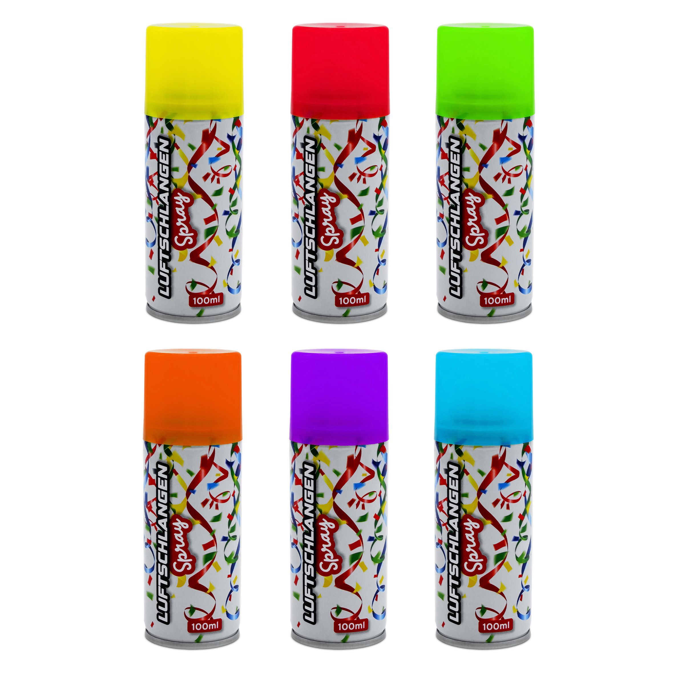 6er Pack fluoreszierende Luftschlangen zum Sprühen je 100 ml in gelb, orange, rot, grün, blau und lila