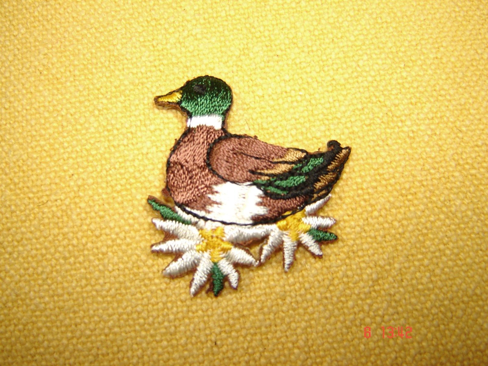 . Bügelbild Patch schönes Stickbild Wildente mit 2 Edelweiß zum Aufbügeln 3,8 cm breit und 4 cm hoch ausgezeichnete Qualität aus deutscher Herstellung - Bitte Sehen Sie sich hier alle meine meine anderen Artikel an . . Hut Hüte Huete Hat hats Hutreparatur hutwerkstaetten Hut-Geske GmbH Susa Geske, H