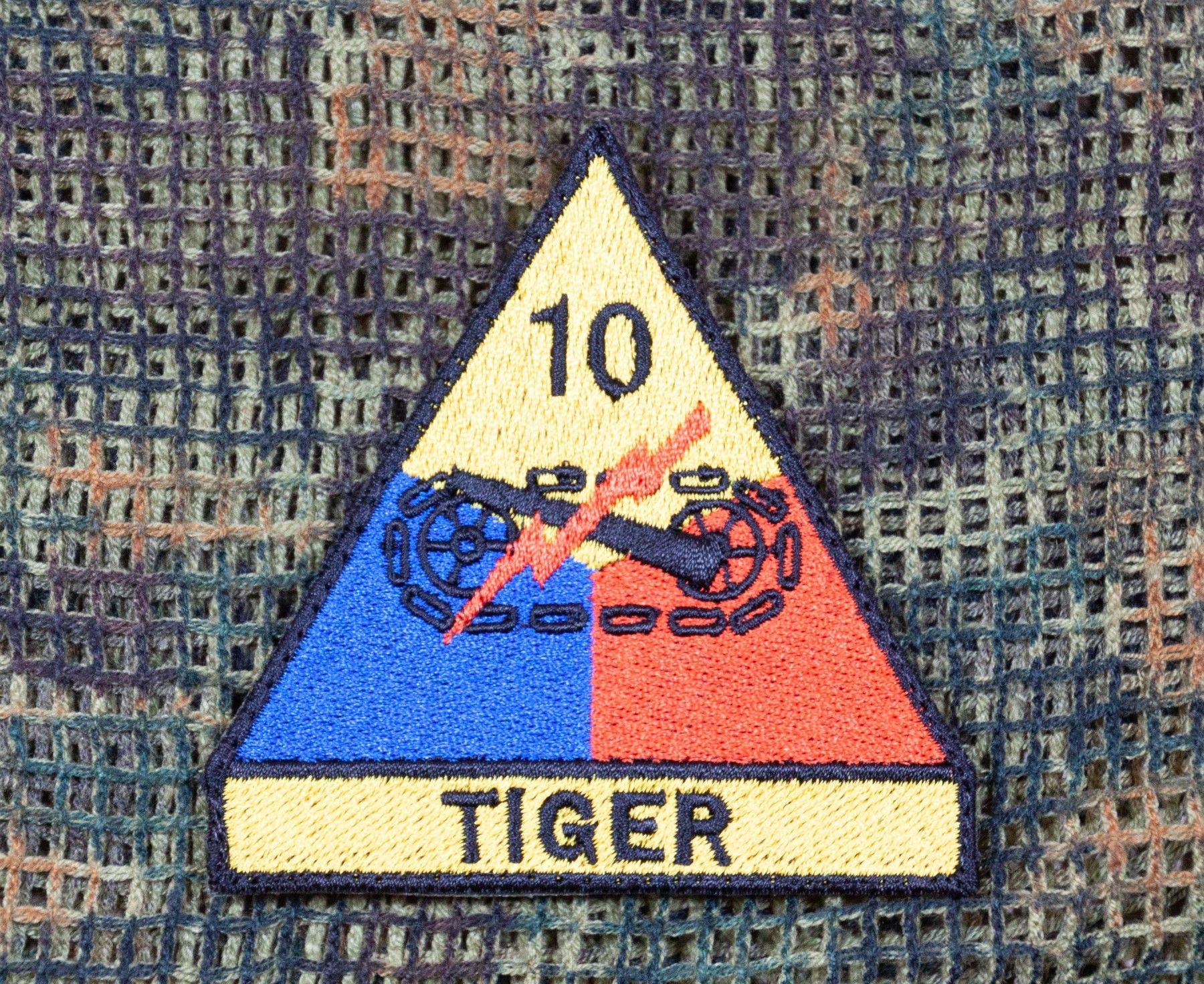 Dieser gestickte Patch mit dem Abzeichen der 10th Armored Division (Tiger) gibt es zum Aufnähen ohne Klett oder auch mit Klettrückseite. Die Maße betragen: Breite: 8 cm, Höhe: 8 cm.