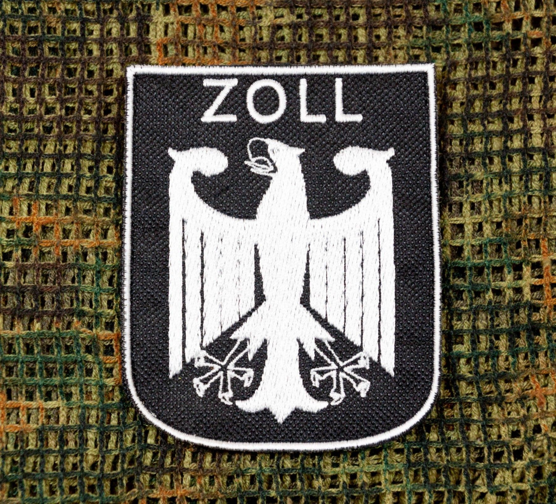 Patch: ZOLL mit Bundesadler und Klettrückseite in Weiß auf Schwarzem Hintergrund. Der Patch hat die Maße: Breite: 7cm, Höhe: 8,5 cm