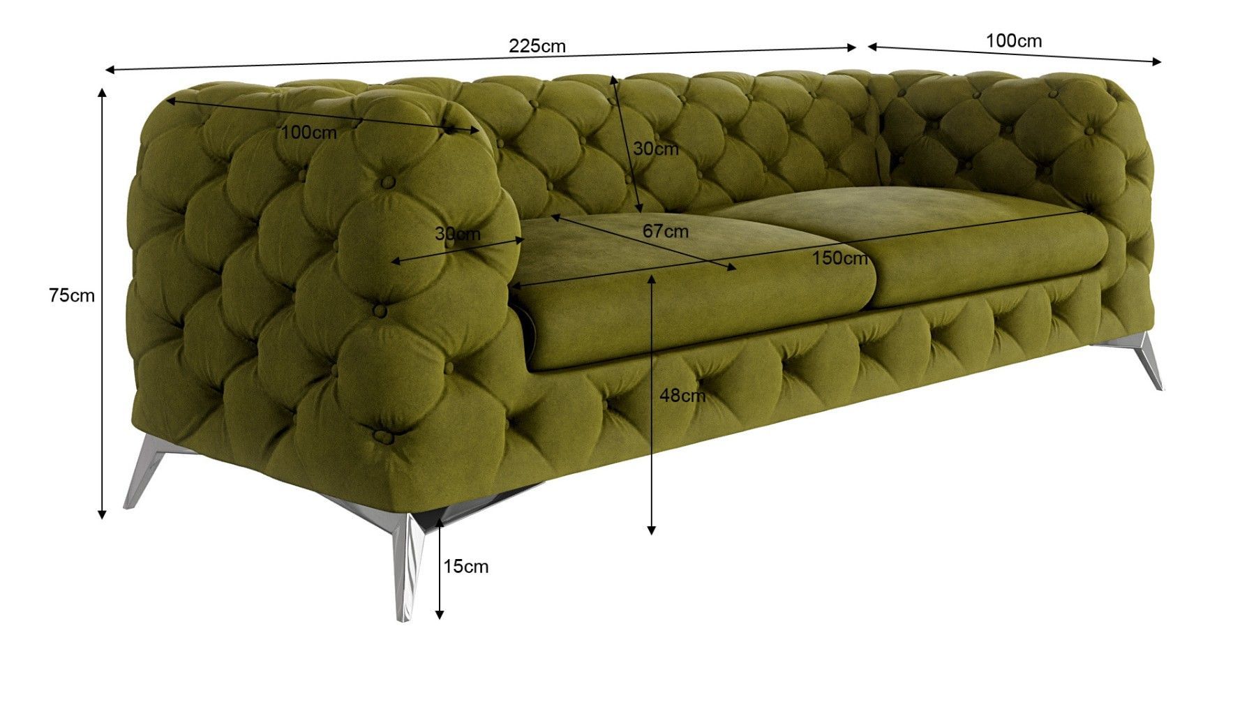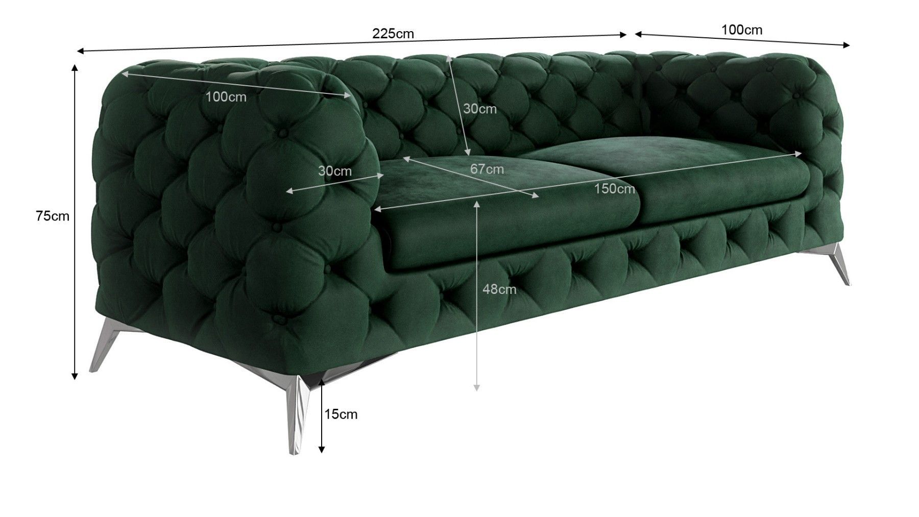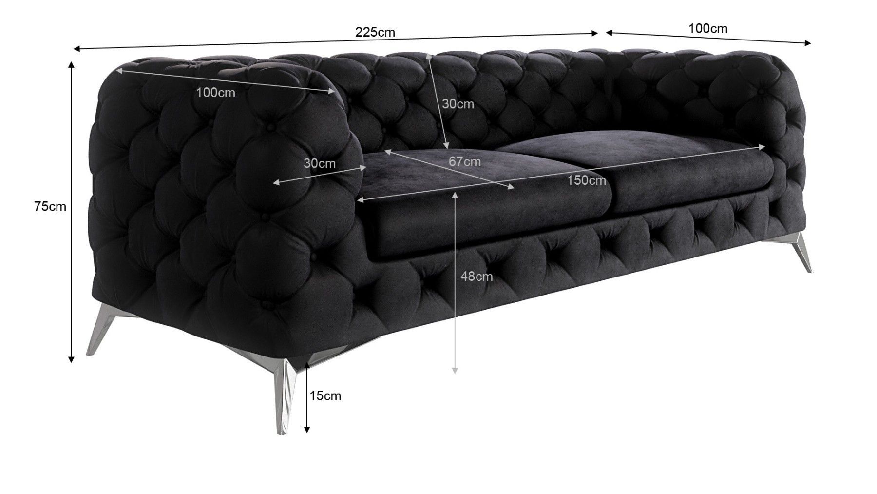 B 225 cm x T 100 cm x H 75 cm