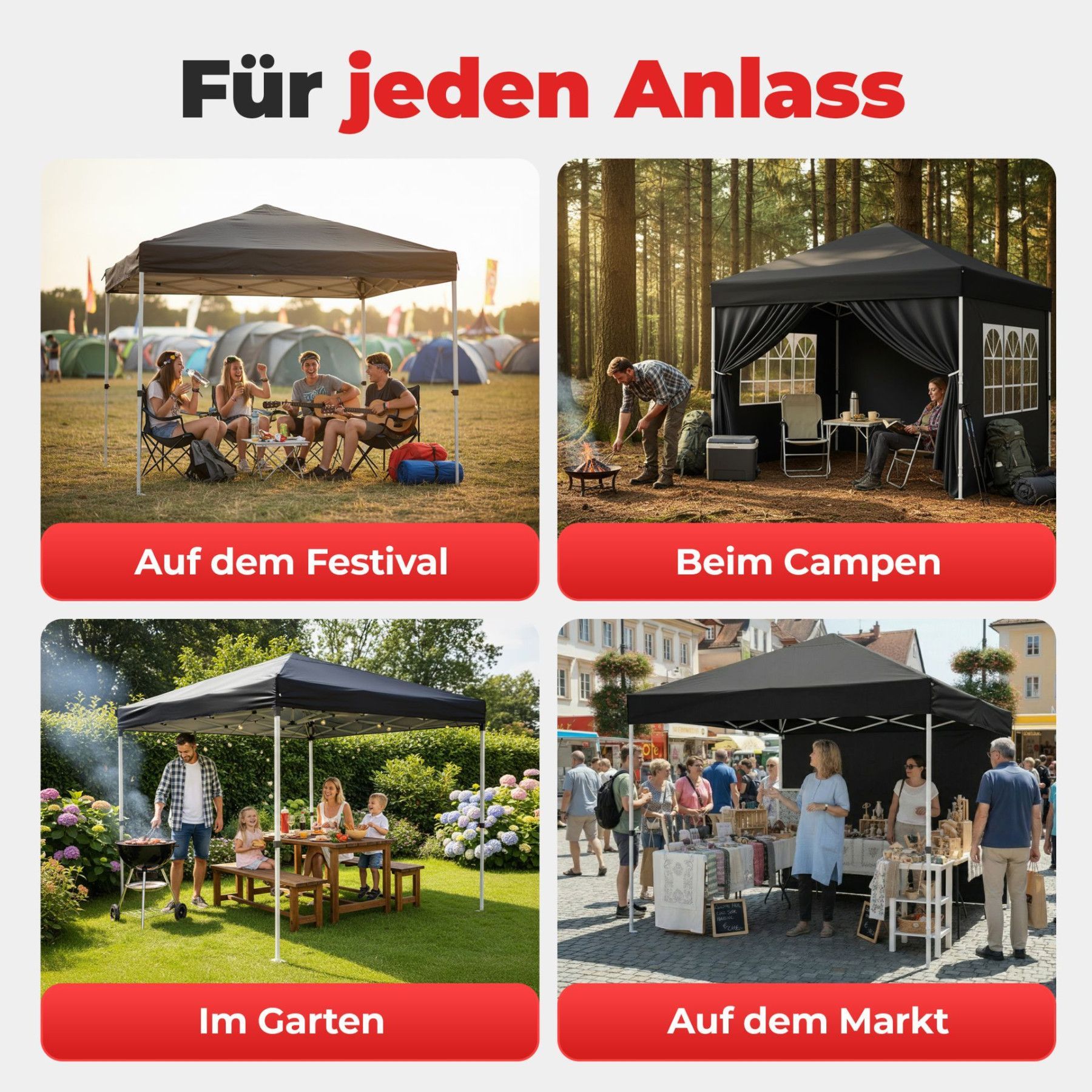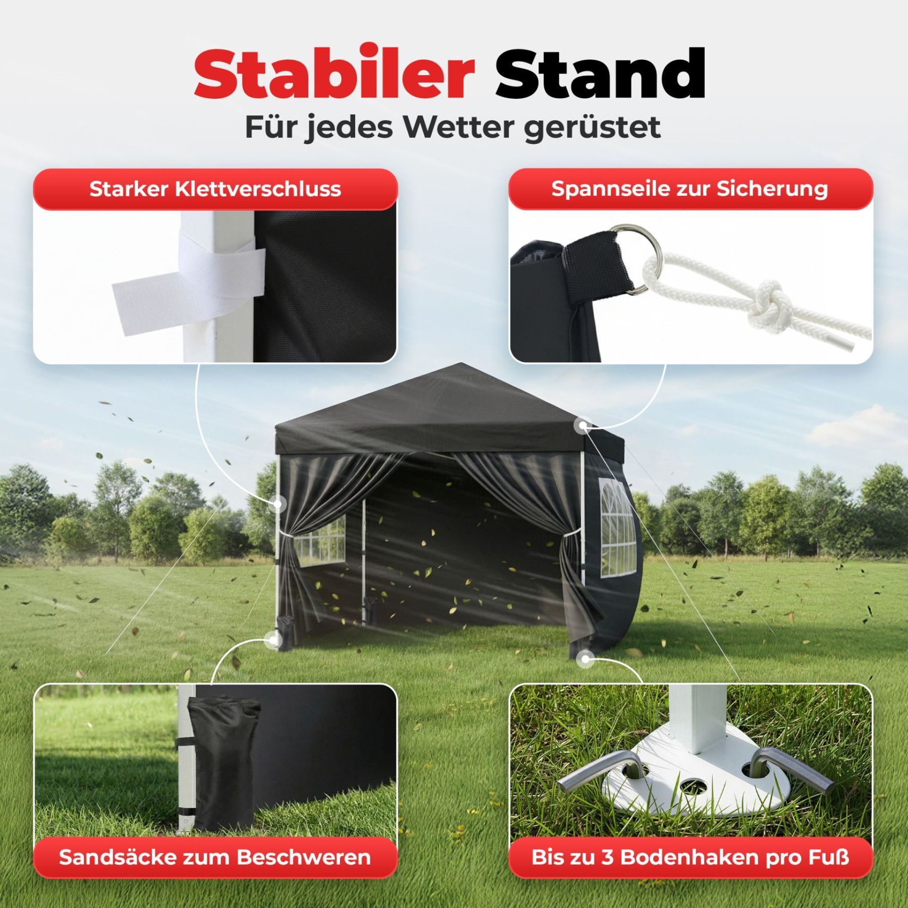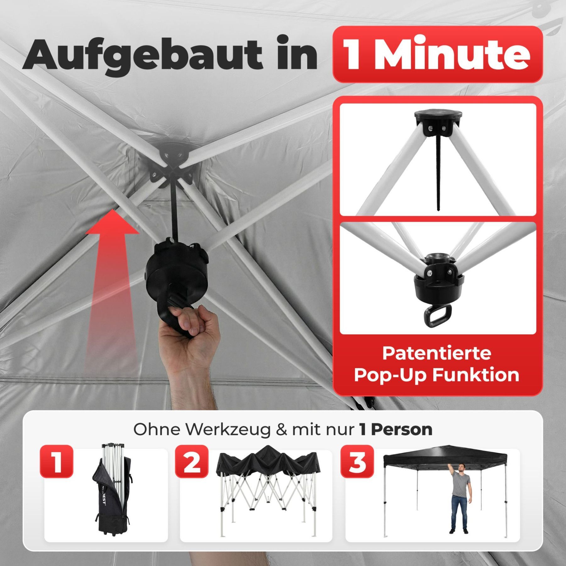 Faltpavillon Schwarz Der Faltpavillon in elegantem Schwarz ist die perfekte Lösung für stilvolle Events, Gartenpartys oder den professionellen Einsatz auf Märkten. Dank der cleveren Pop-Up-Technik lässt sich das 3x3 Meter Zelt von nur einer Person in unter einer Minute werkzeuglos aufbauen. Das umfa
