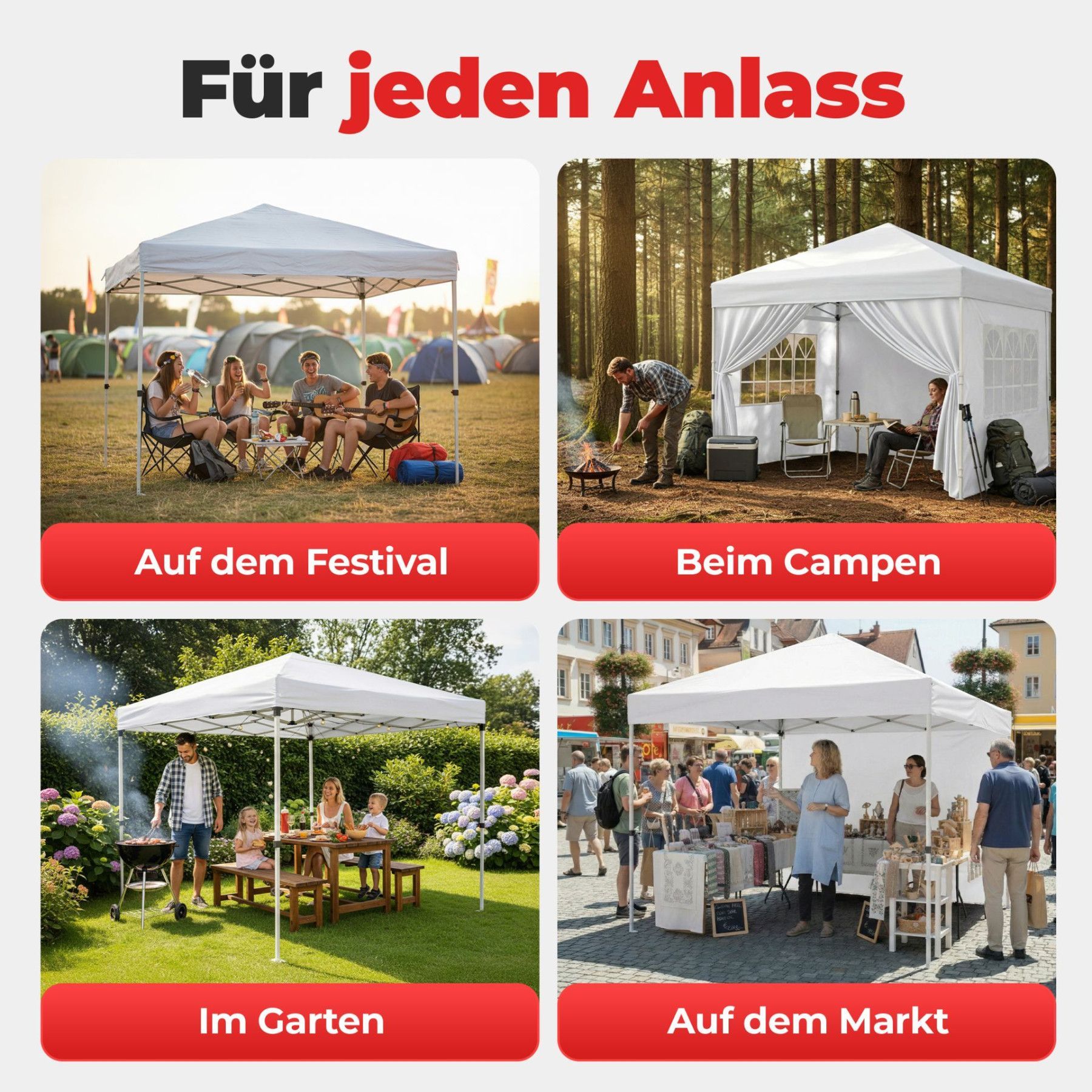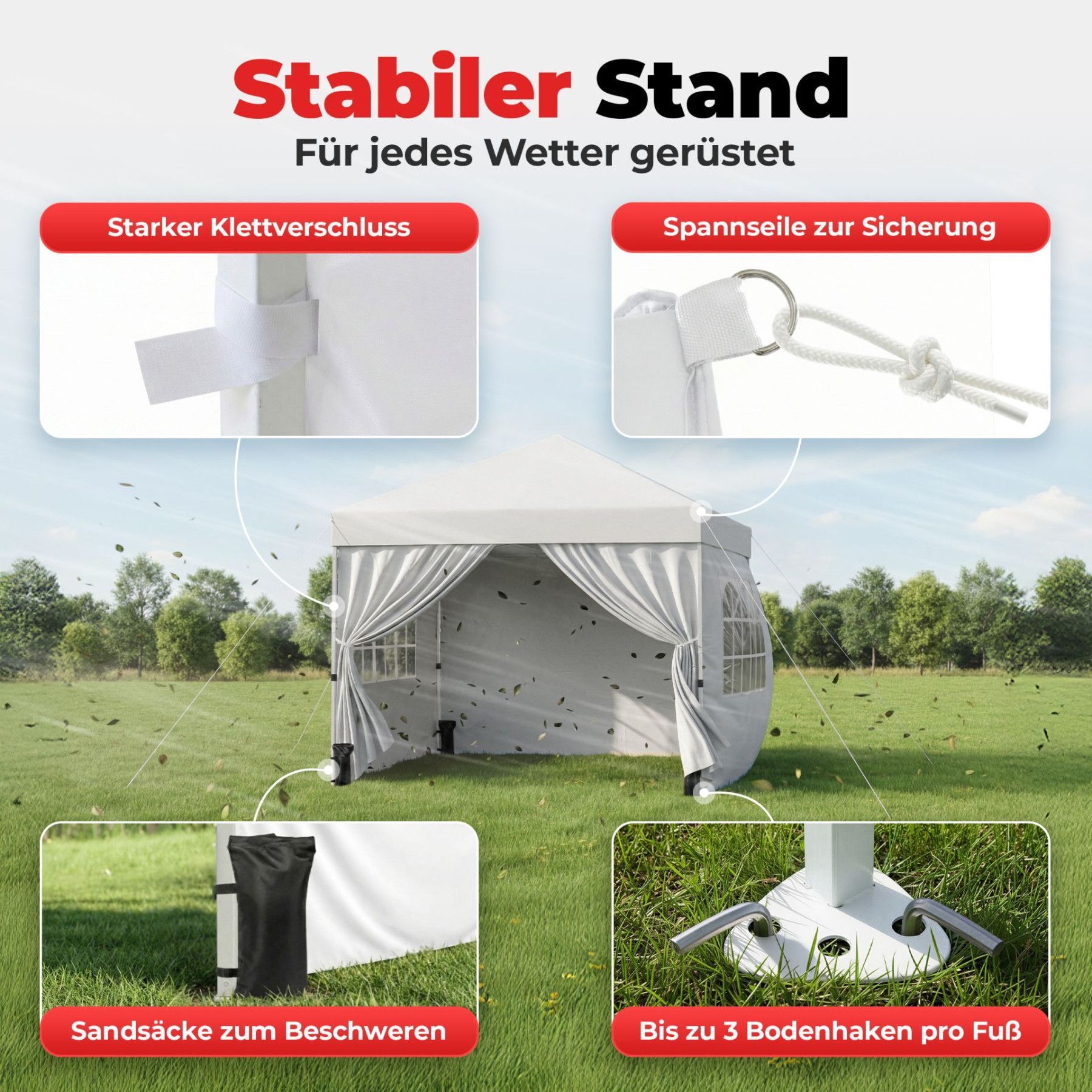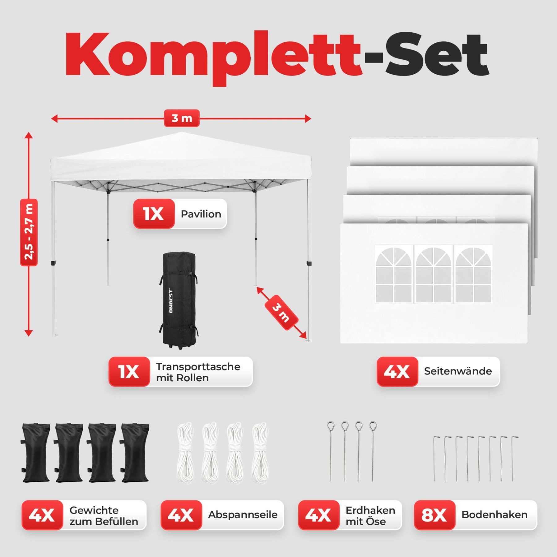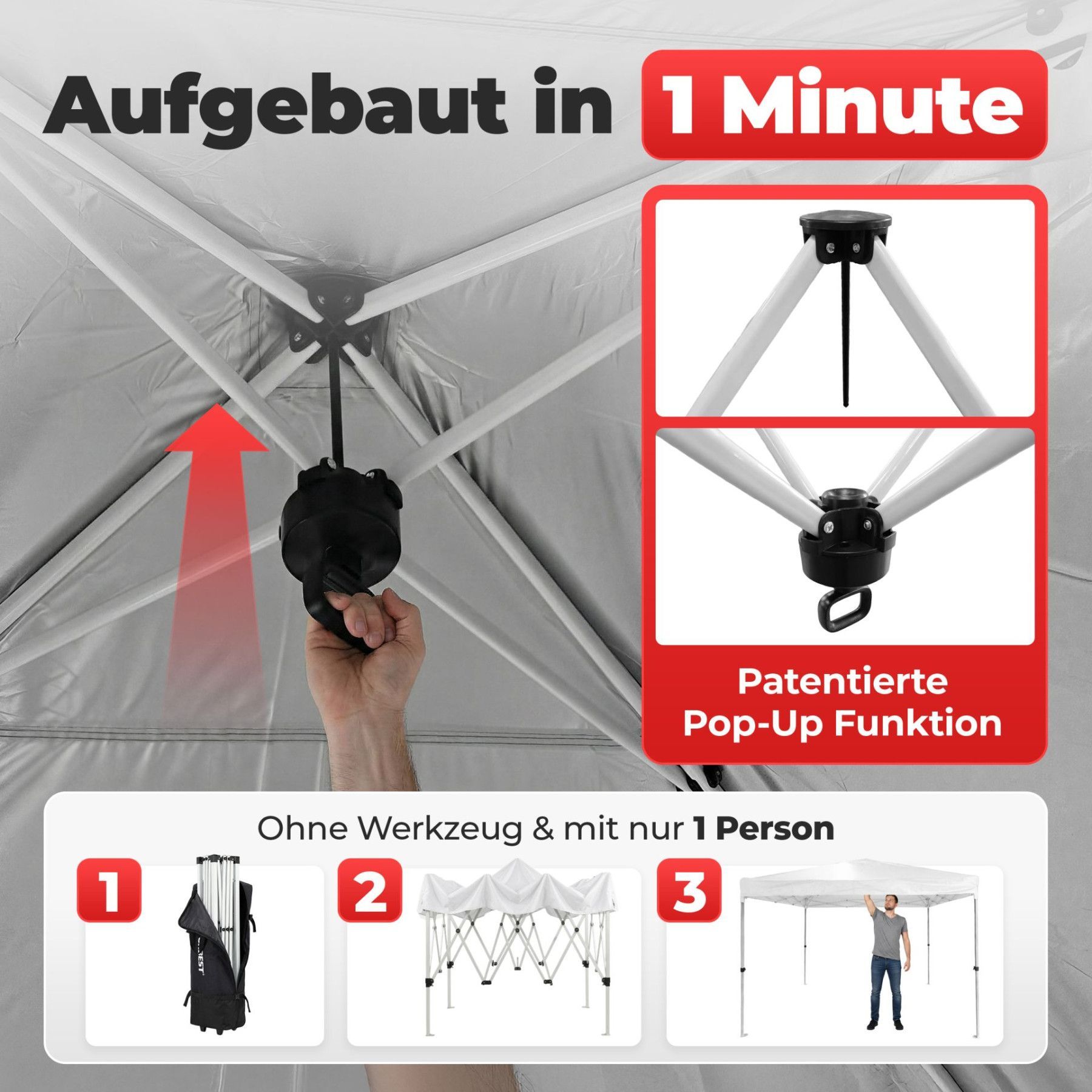 Faltpavillion Weiß Der Faltpavillion ist die perfekte Lösung für spontane Feste, den Garten oder Campingausflüge. Dank der genialen Pop-Up-Technik lässt sich das 3x3 Meter Zelt von nur einer Person in unter einer Minute werkzeuglos aufbauen. Das umfangreiche Komplett-Set inklusive Seitenteilen und B