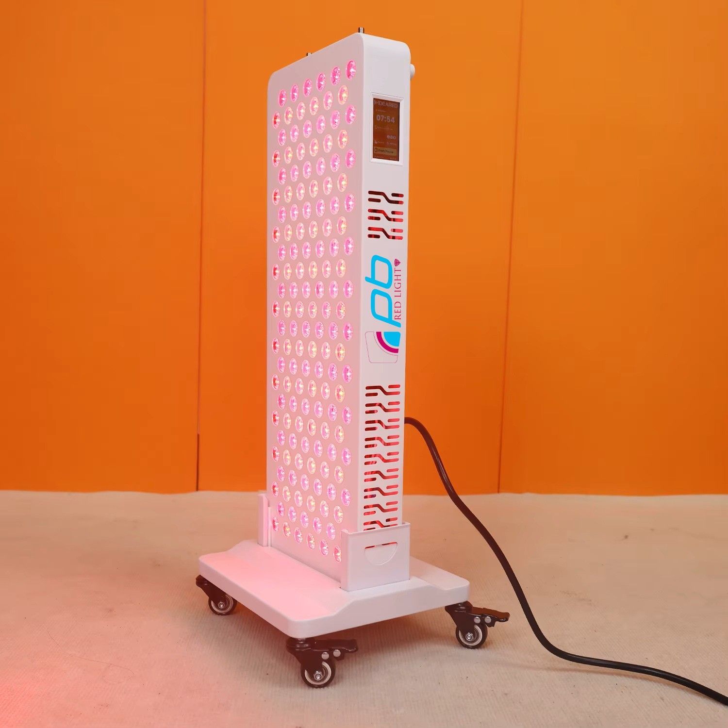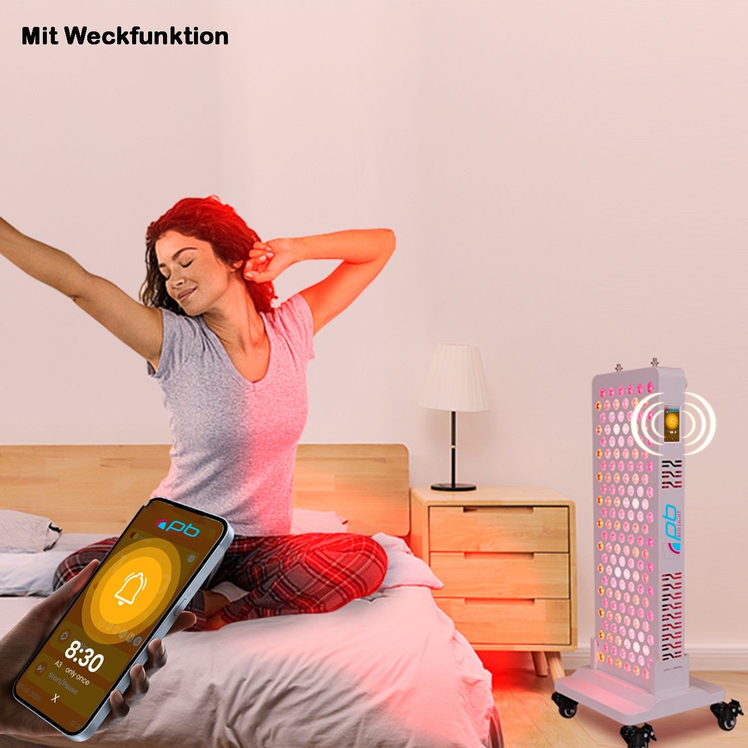 pb Red Light2 Panel 3 Jahre Garantie, modernes Rotlichtgerät mit 9 speziell abgestimmten Wellenlängen (480, 590, 630, 660, 670, 810, 830, 850, 1060 nm), die in Kombination eine besonders tiefe Gewebedurchdringung ermöglichen können – bei 0,0 schädlichen EMFs. bietet es vielseitige Möglichkeiten zur Anwendung im Alltag. Klinisch erprobte Wellenlängen, höchste Strahlkraft und innovative Steuerungsmöglichkeiten. Touchscreen, App-Steuerung & Fernbedienung. Weckfunktion inklusive Ständer mit Rollen