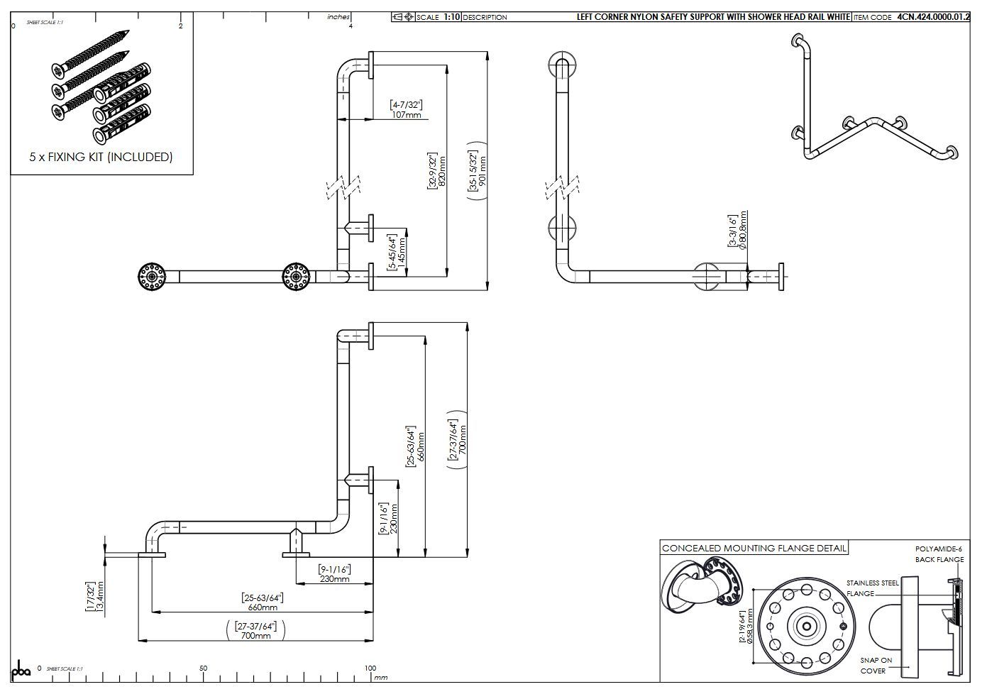 pba 01 Duschhandlauf links 660x660mm, aus Nylon, mit Brausehalterstange 820mm