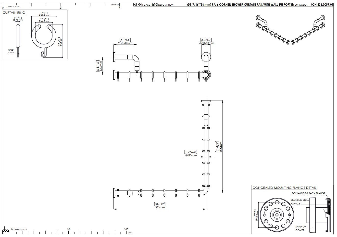 pba 01 Duschstange, L-Form mit Wand- Stützen aus Nylon, 800x800mm