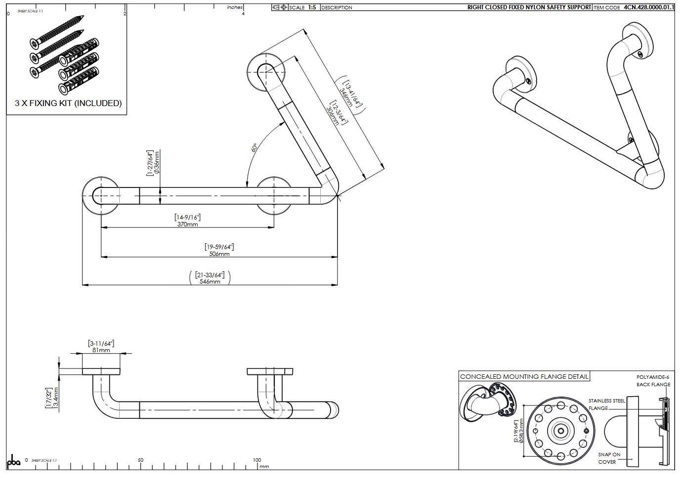 pba 01 Winkelgriff fest R, geschlossen, rechts, aus Nylon, 500x300mm