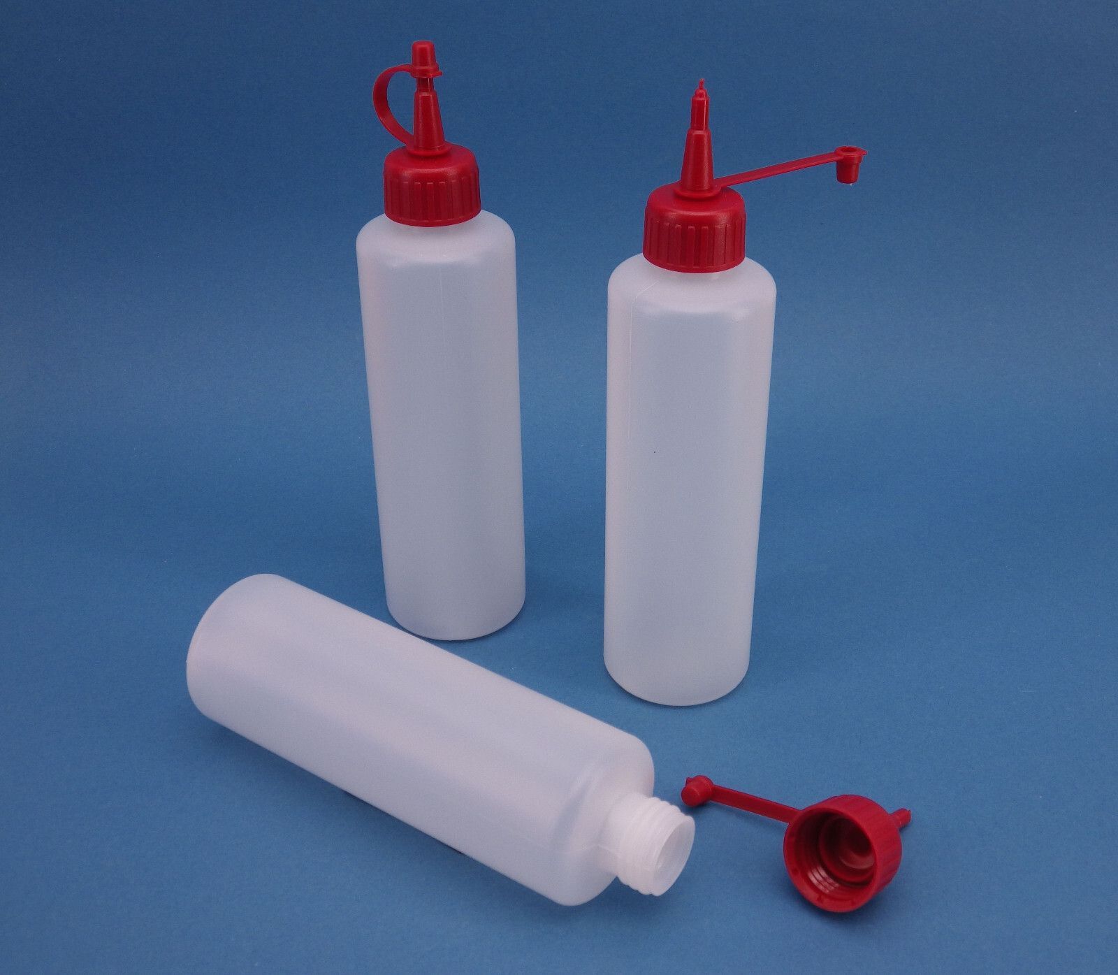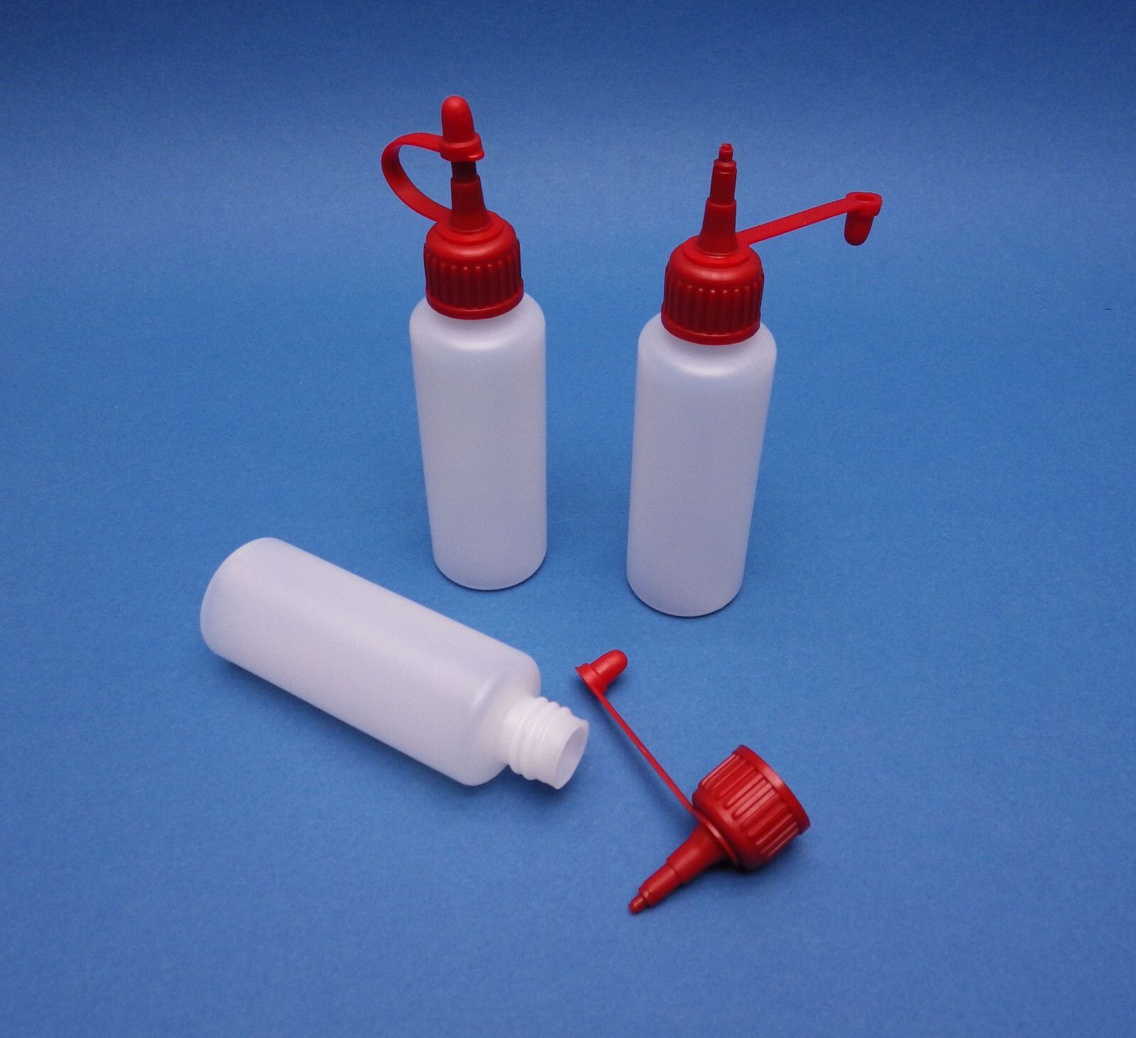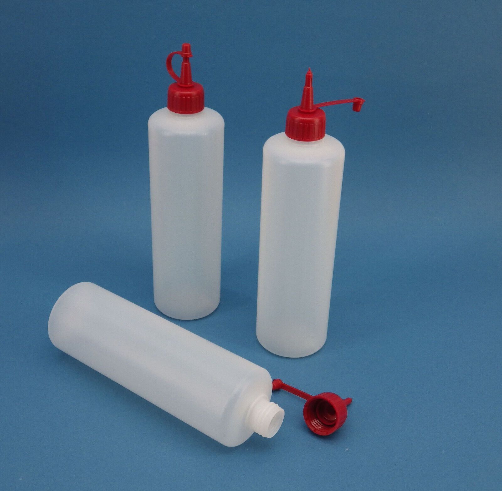 Kunststoff Flaschen, 50ml, 100ml, 250ml und 500ml mit Tülle Dosierverschluß, 12 Stück im Set. Neuware direkt vom Hersteller ! Made in Germany! Die Flaschen sind aus PE gefertig, milchig durchsichtig, so daß der Inhalt sichtbar ist. Der aufgeschraubte Verschluß ist als Tülle ausgeführt, mit einer Öff