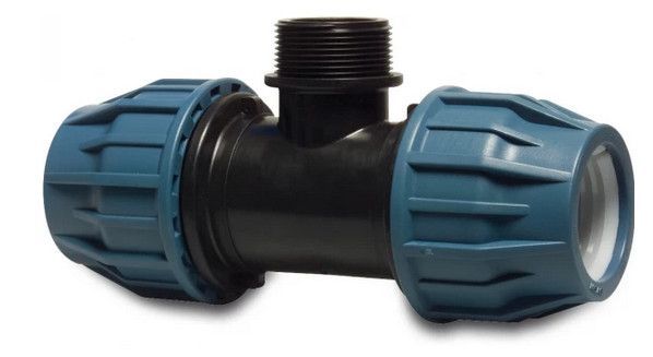 PE T-Stück 90° AussengewindeDVGW Trinkwasser, Brauchwasser, Garten DA = Durchmesser 25-63 mm Kommunen,- Industrie- und Handwerkerqualität DIN DVGW zugelassen bis DA 110 mm ( höchste Prüfstelle ) Werkstoff: Verschraubungskörper, Konusmutter und Druckring: PP-B Typ 2, Dichtring: EPDM Einsetzbar in