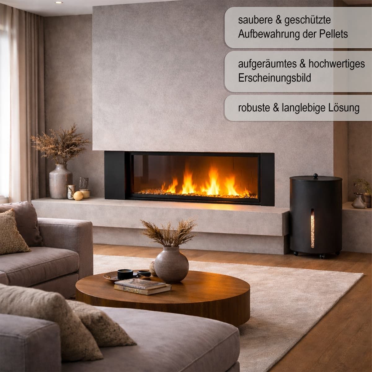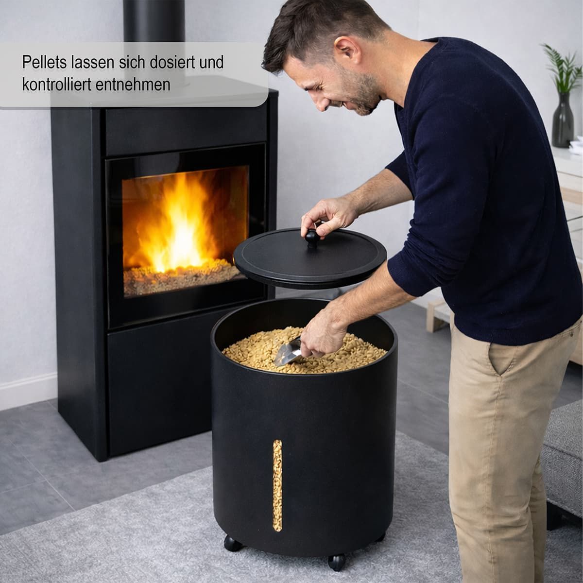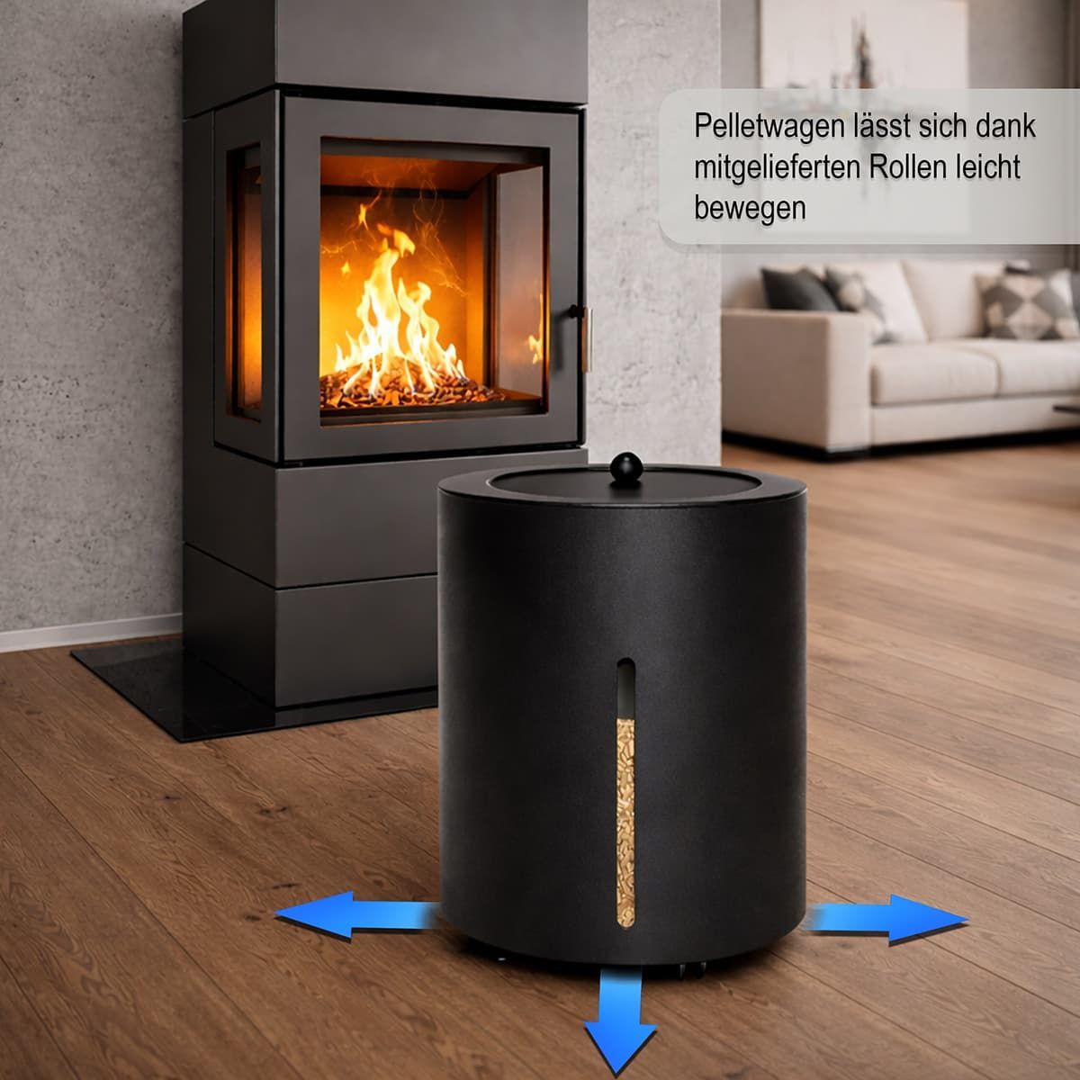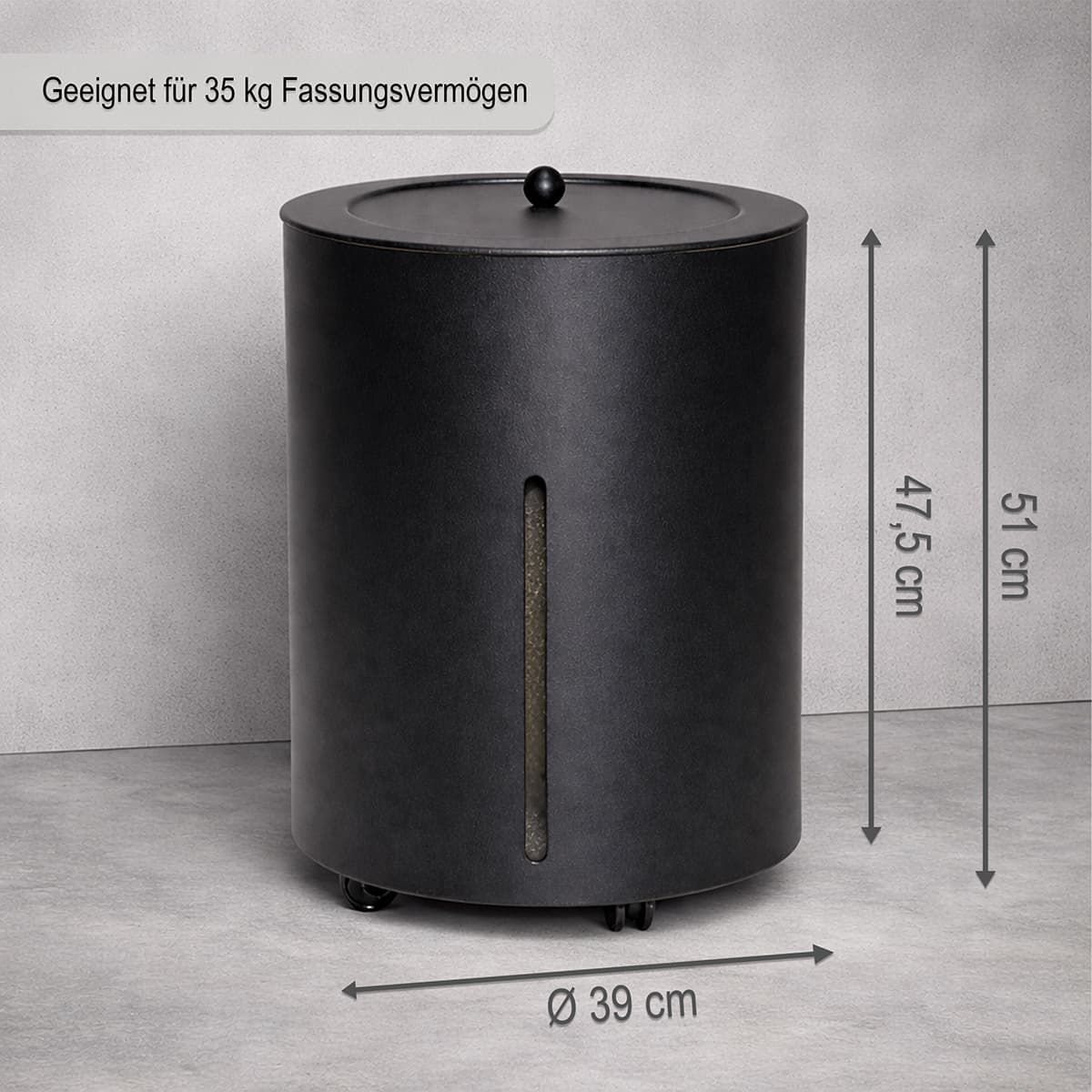 Pelletbox Metall mit Sichtfenster – mobiler Pelletbehälter mit Rollen - Ø 39cm