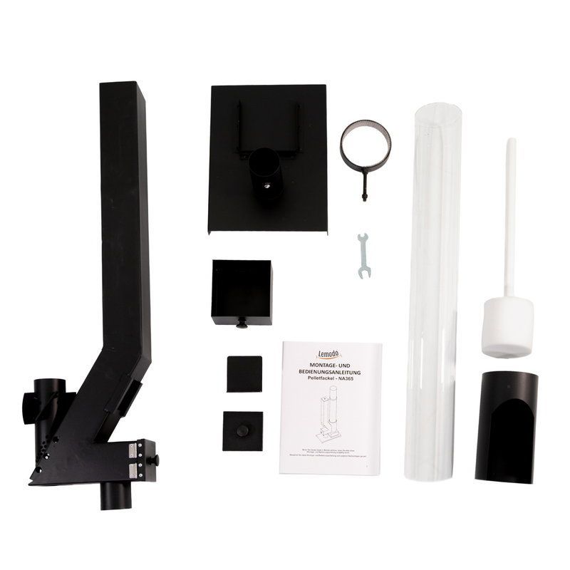 Sicherheitsabstand: mind. 1,20 m seitlich und nach oben einhalten. Betrieb nur mit Holzpellets (Empfehlung: ENplus A1). Nur im Außenbereich verwenden. Glasröhre wird heiß! Nicht während der Benutzung anfassen. Lassen Sie die Pelletfackel nie unbeaufsichtigt.