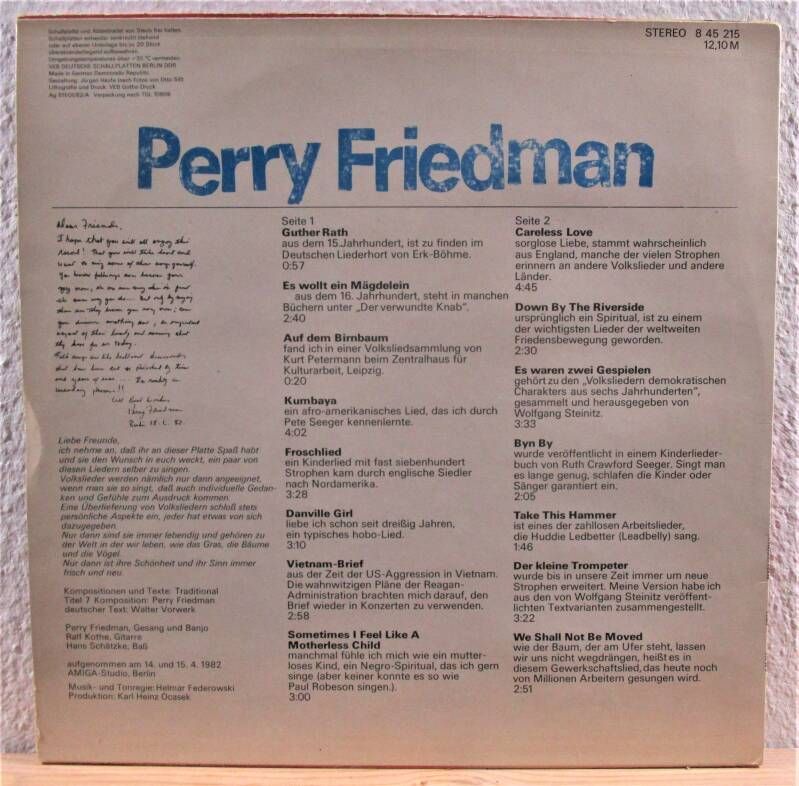 Perry Friedman - Perry Friedman Amiga 8 45 215 1982 Vinyl: VG+ - ++ Cover: VG+ A1 Gunther Rath 0:57 A2 Es wollt ein Mägdelein 2:40 A3 Auf dem Birnbaum 0:20 A4 Kumbaya 4:02 A5 Froschlied 3:28 A6 Danville Girl 3:10 A7 Vietnam-Brief 2:58 A8 Sometimes I Feel Like A Motherless Child 3:00 B1 Careless Love