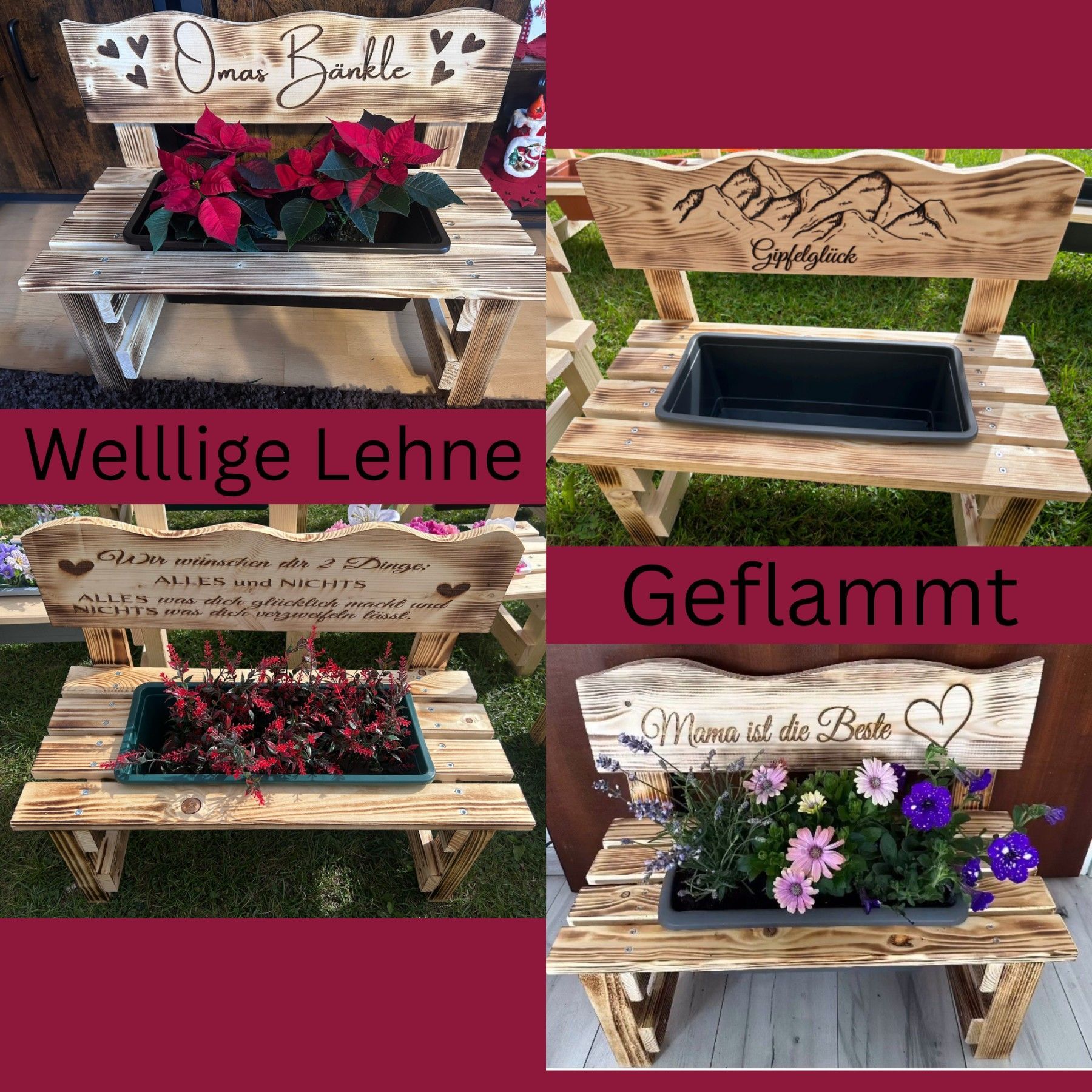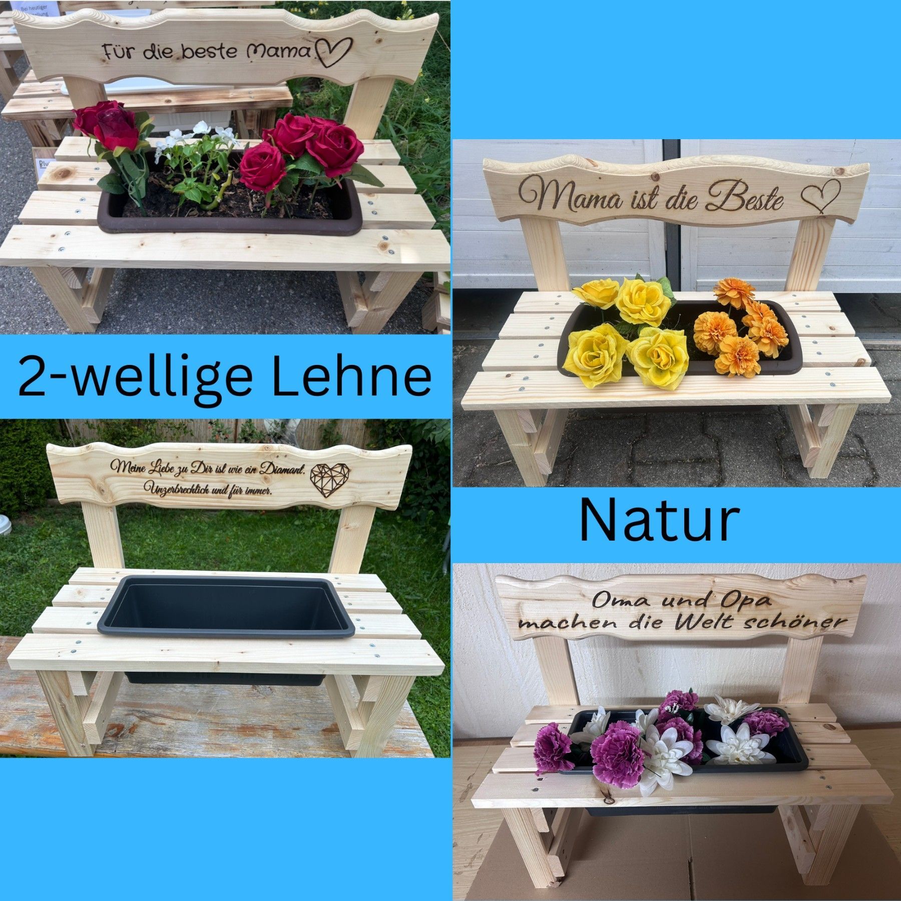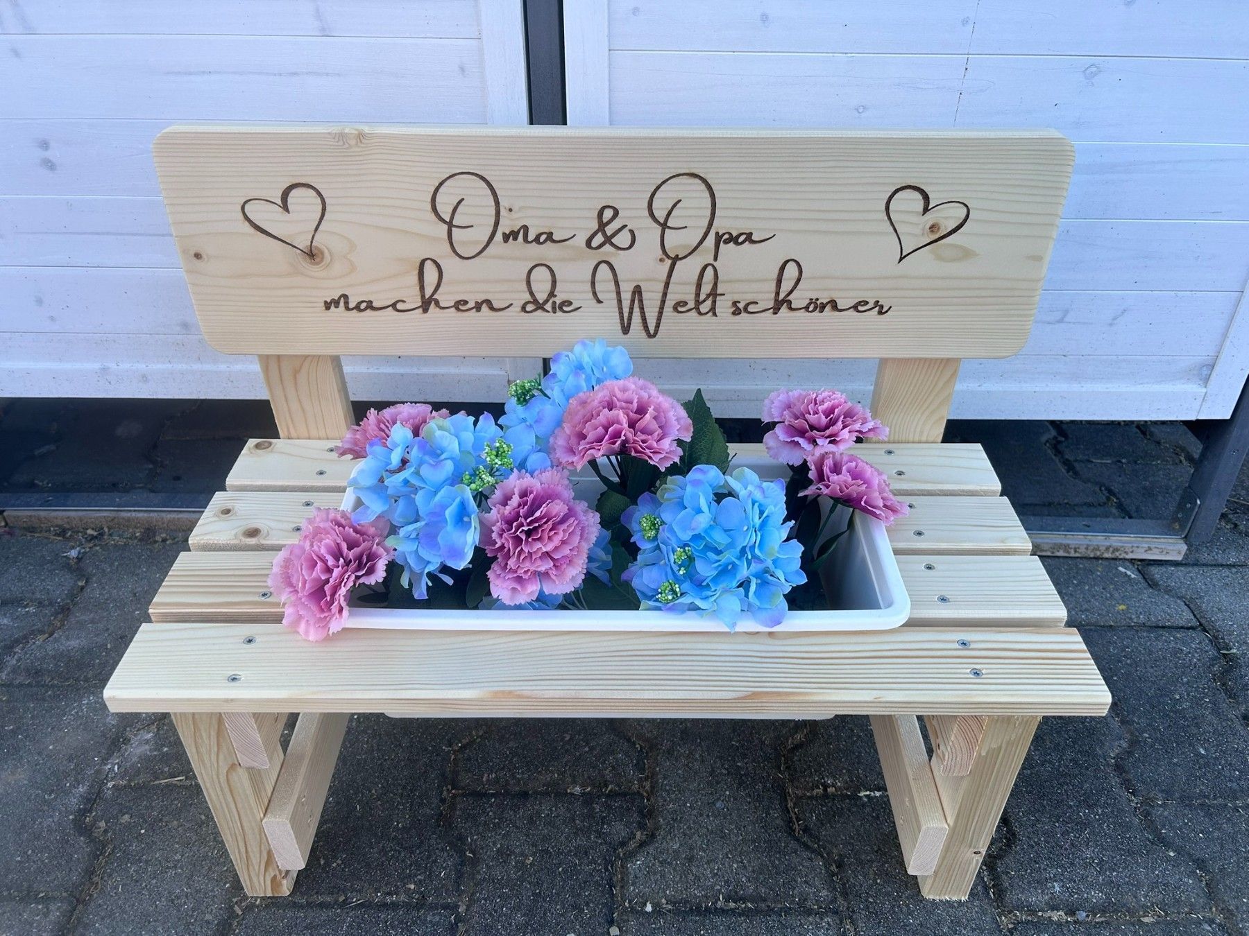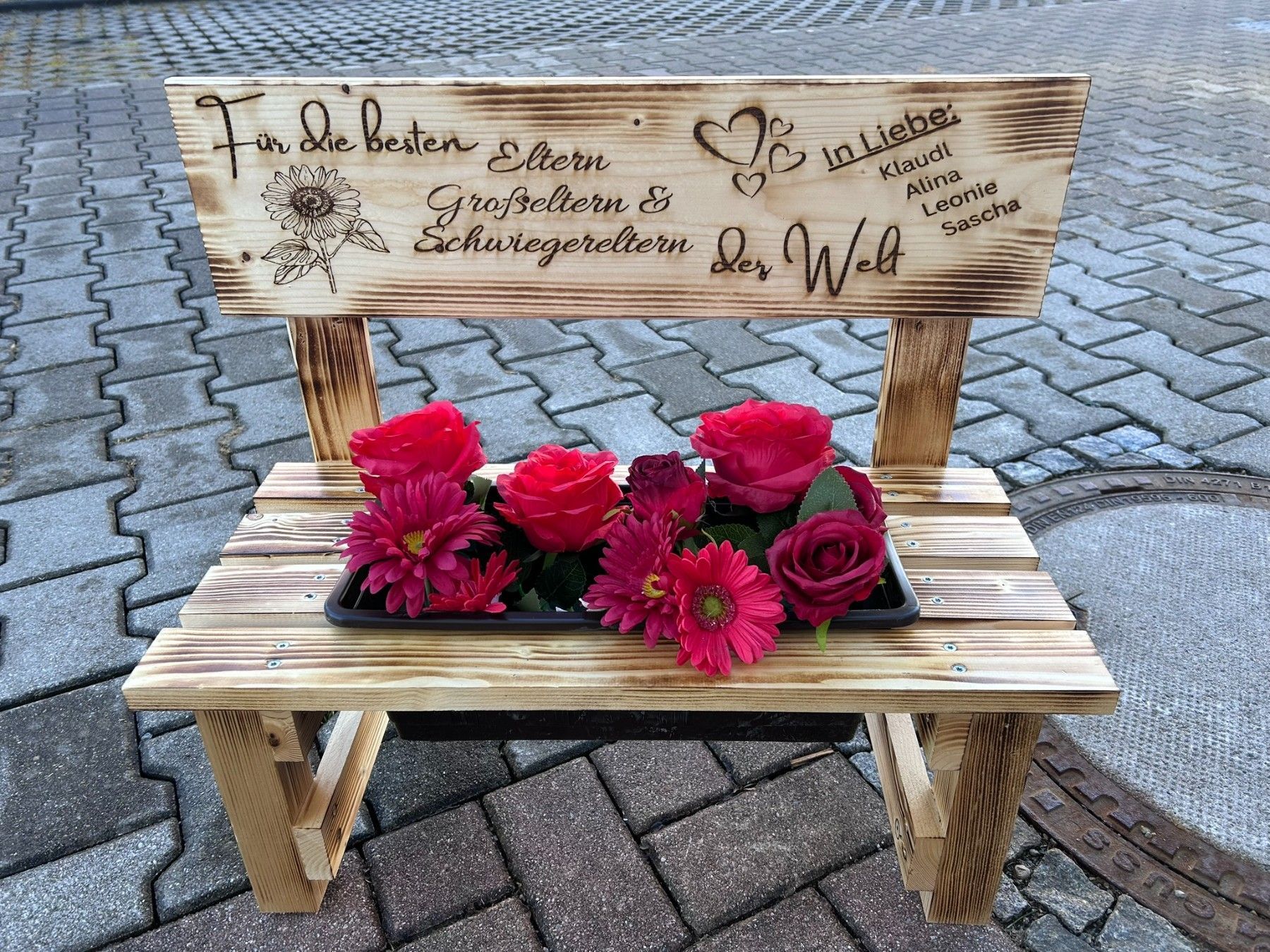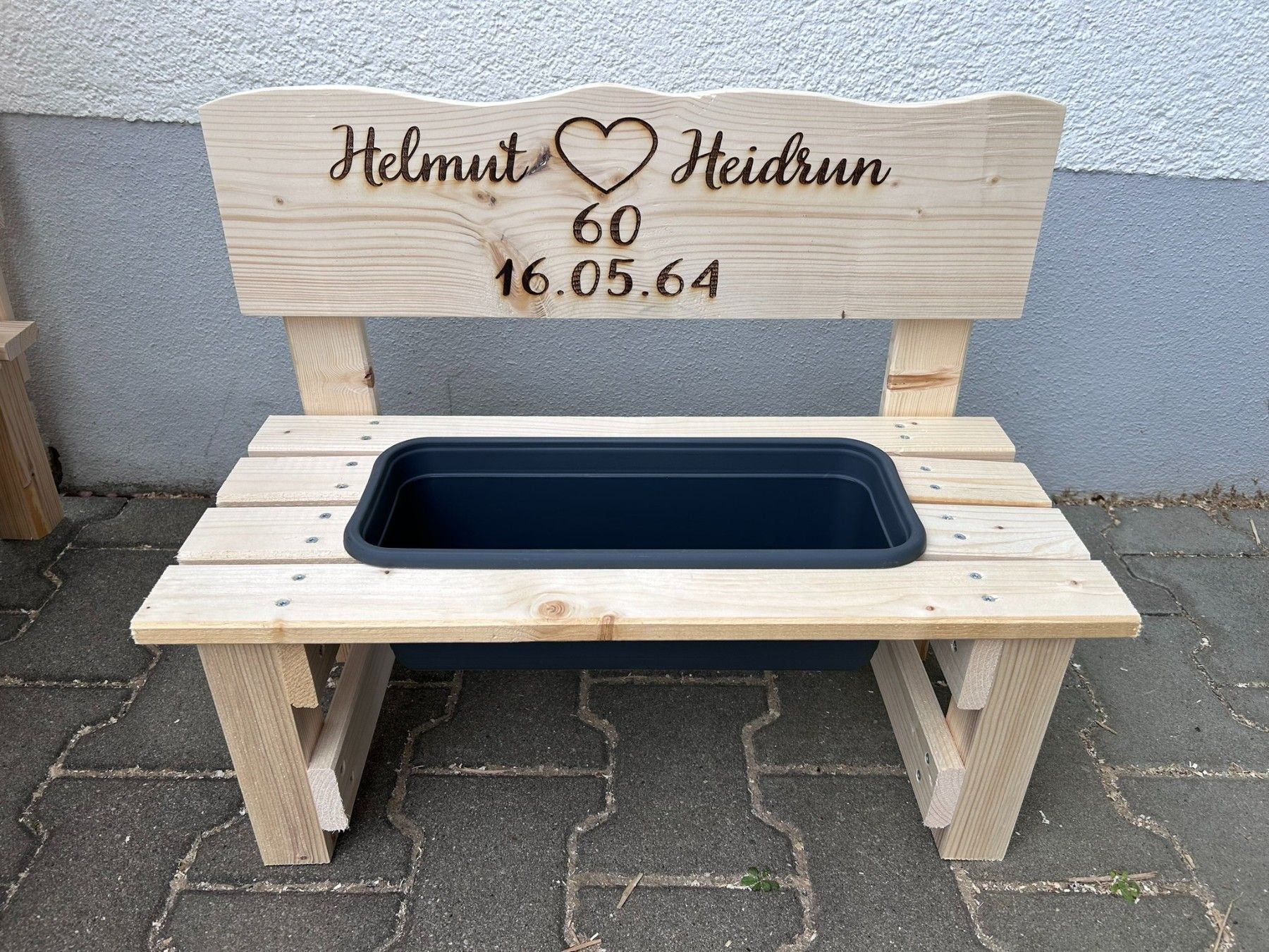 Personalisierte Blumenbank aus Holz mit Gravur | Handgemacht & wetterfest
