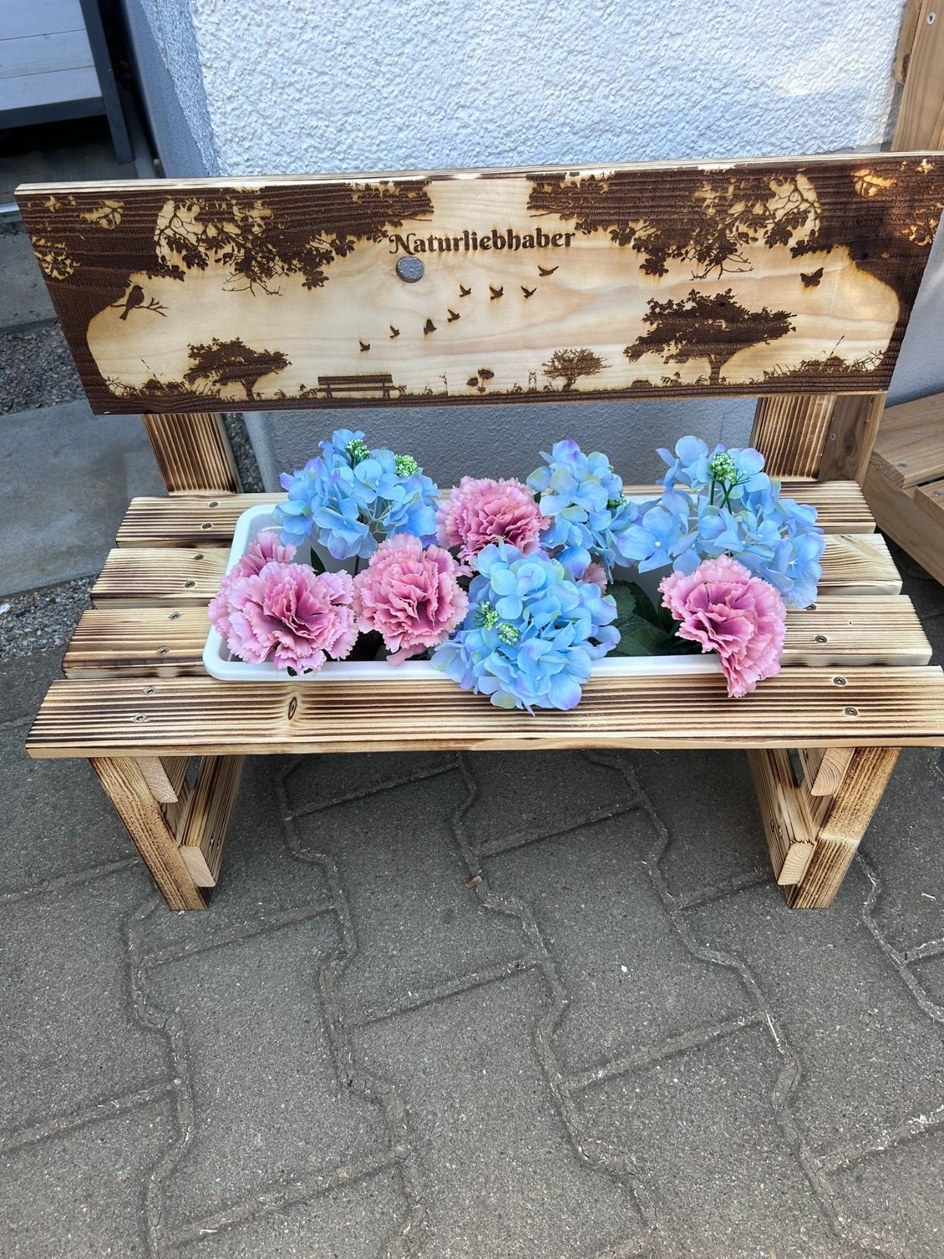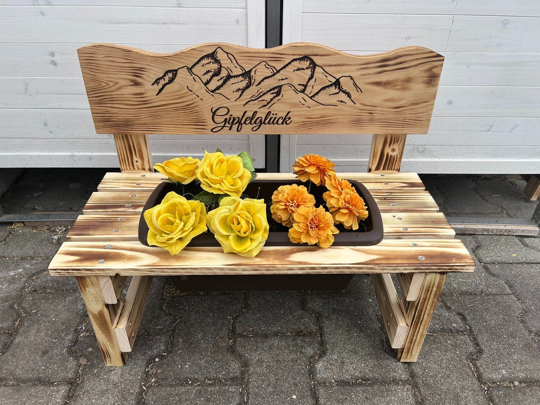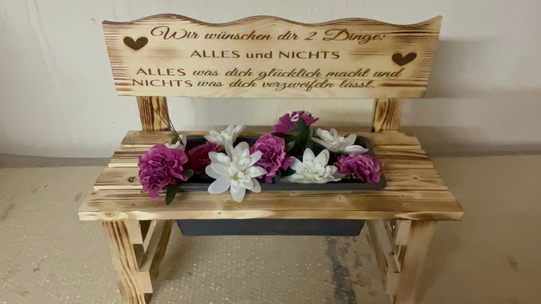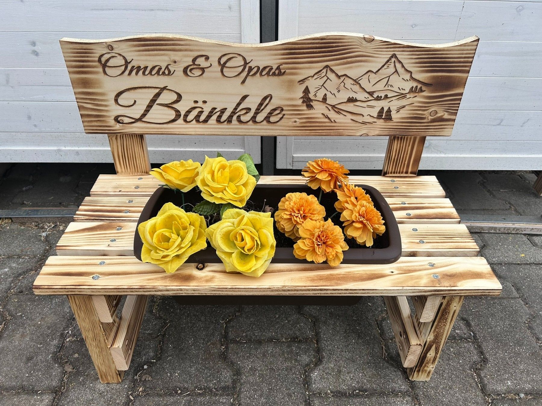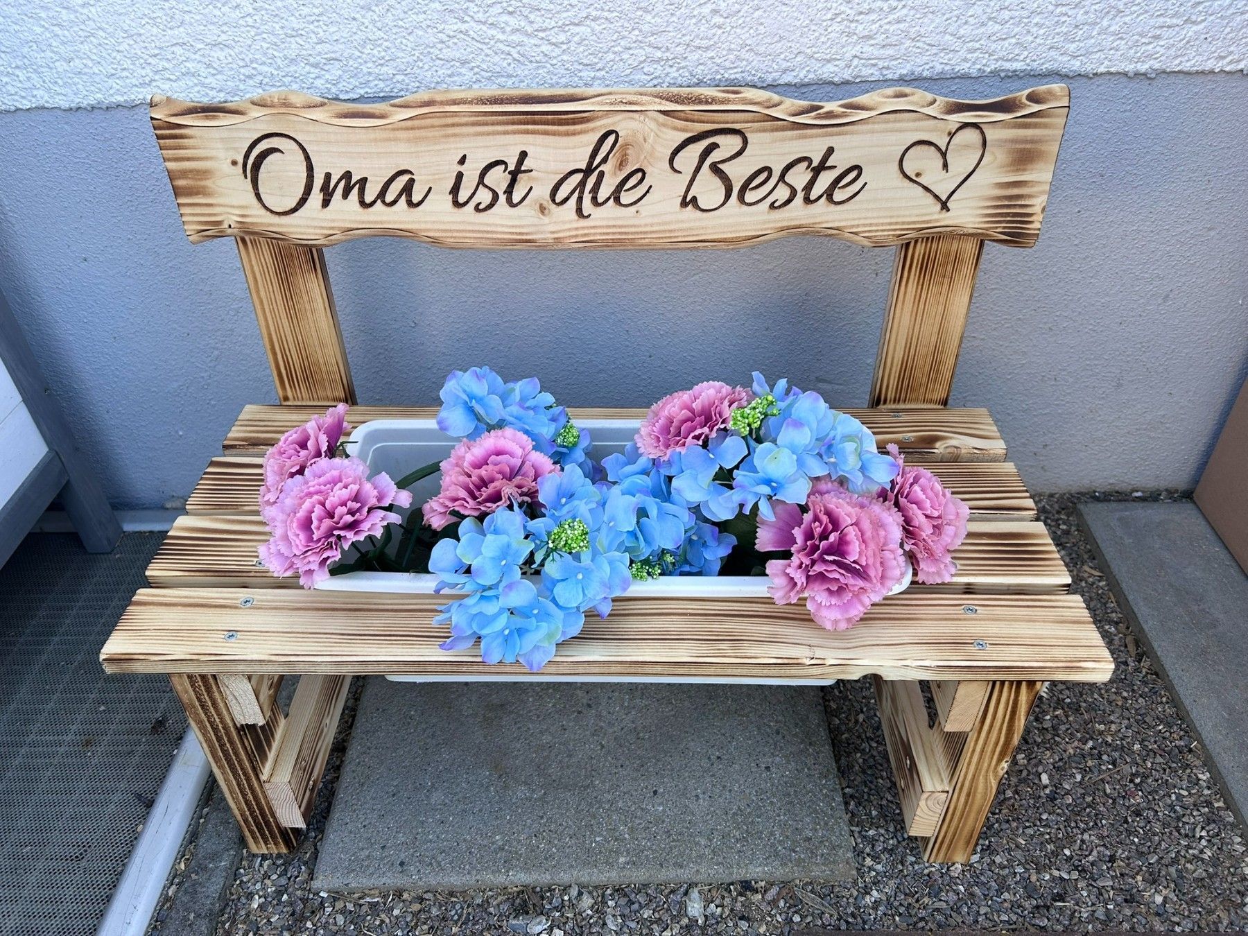 Personalisierte Blumenbank aus Holz mit Gravur | Handgemacht & wetterfest