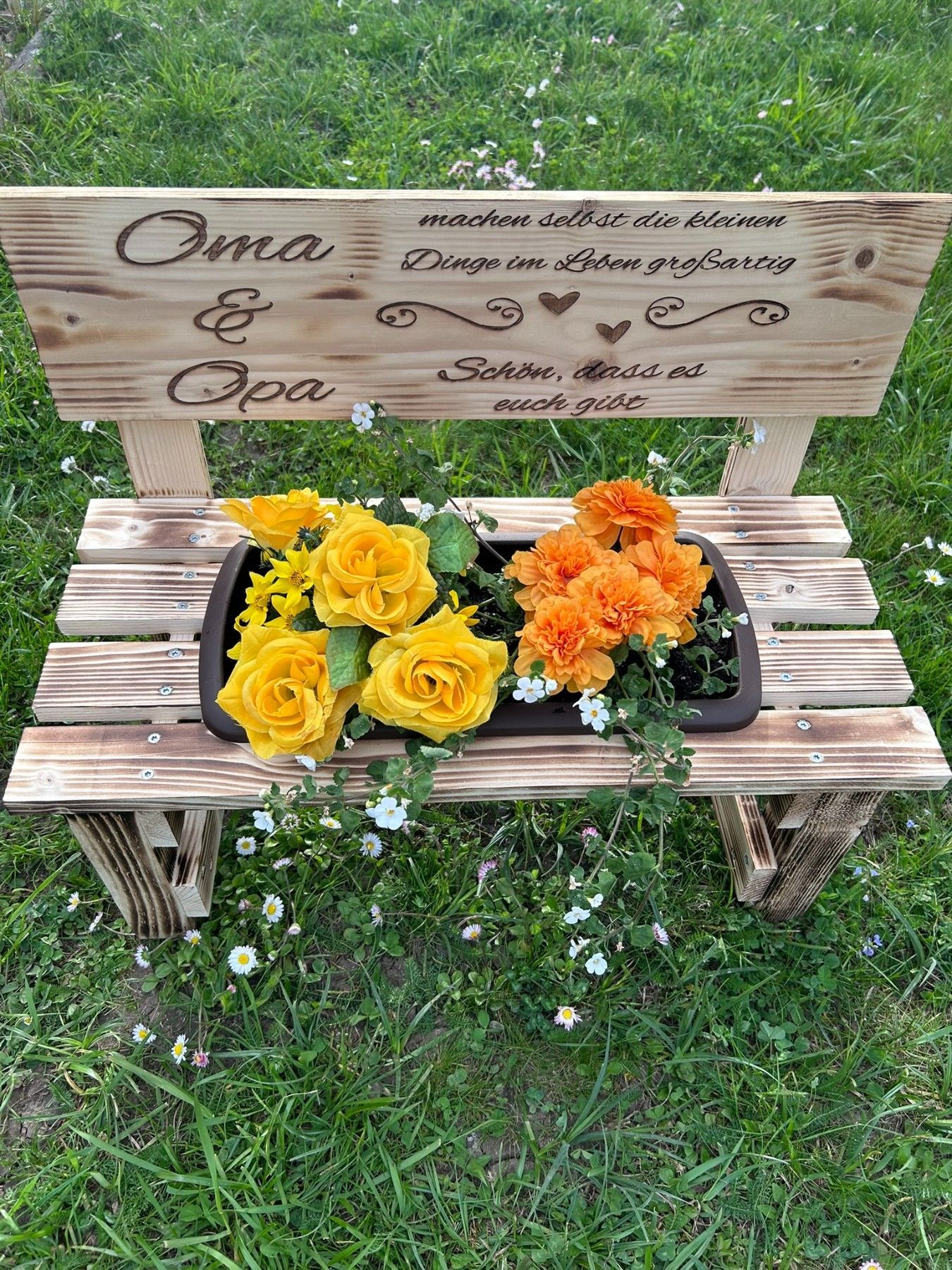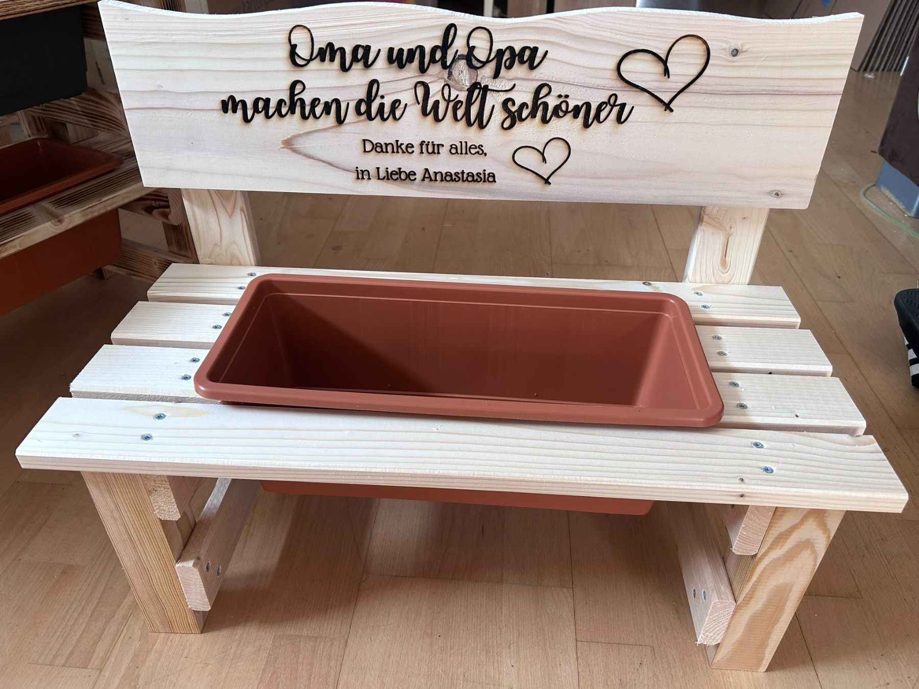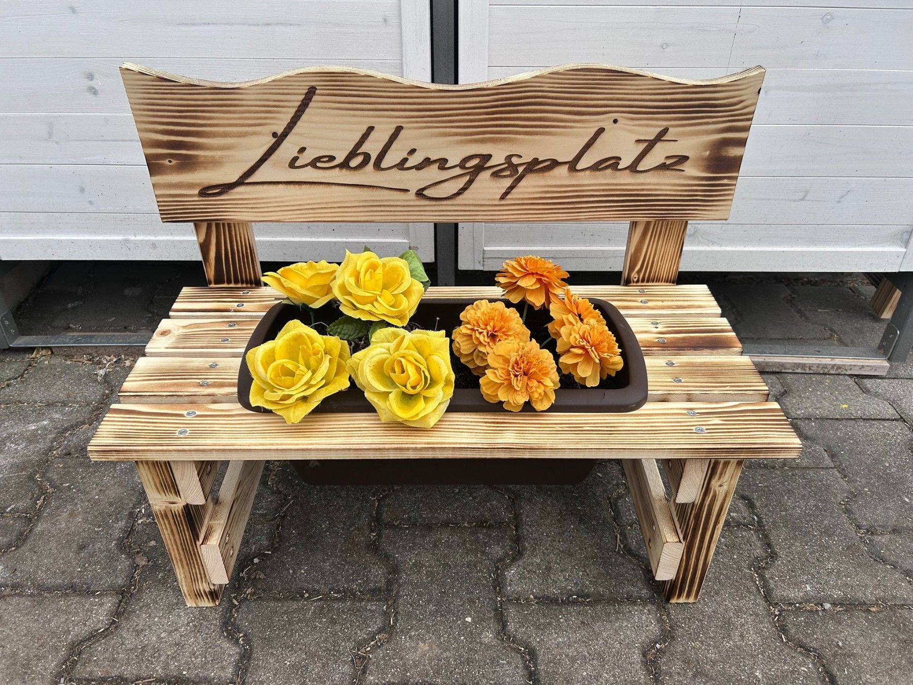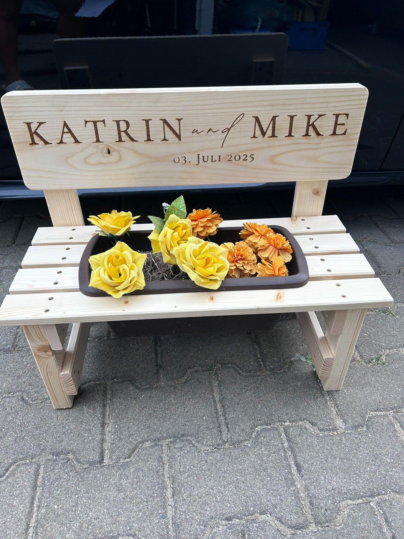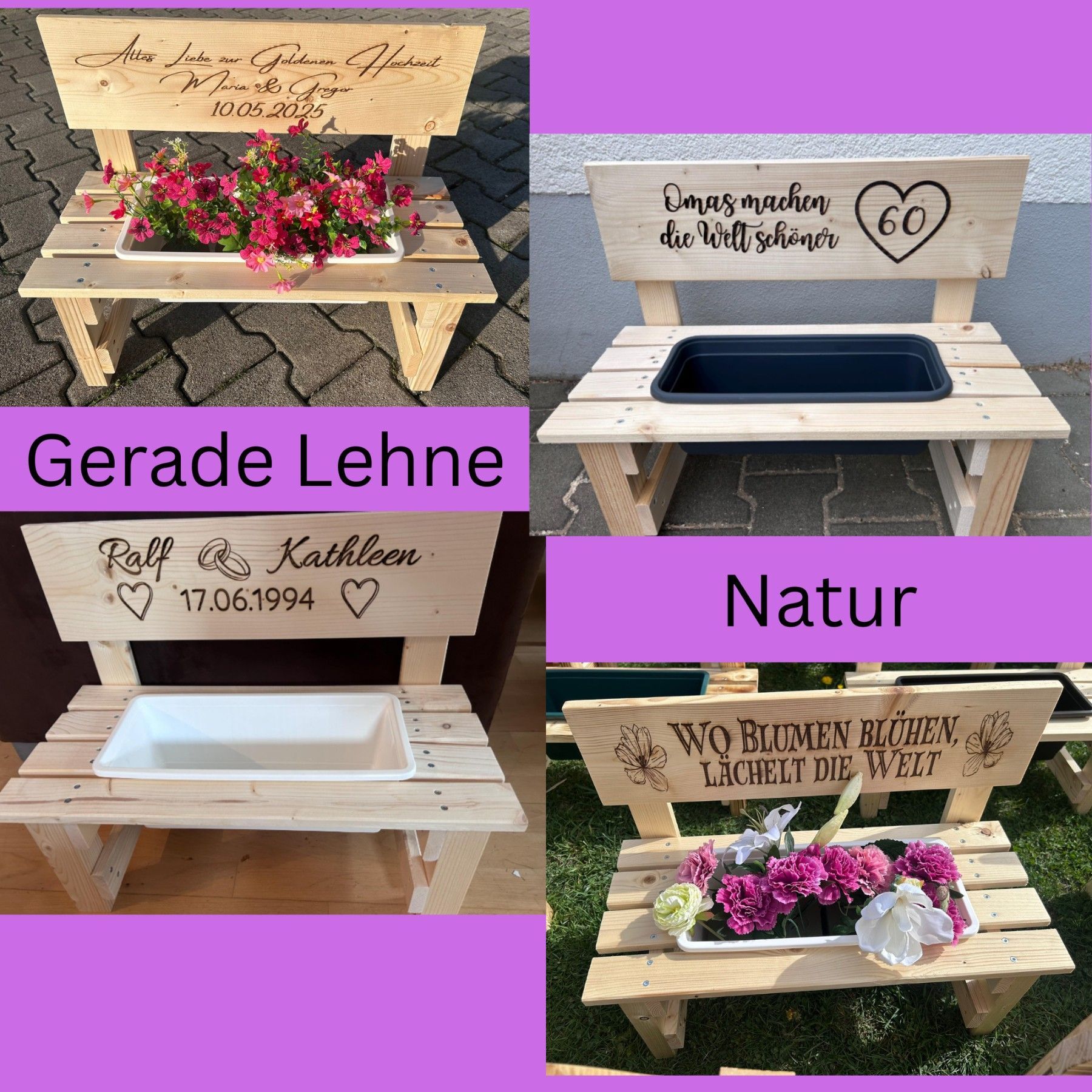 Personalisierte Blumenbank aus Holz mit Gravur | Handgemacht & wetterfest