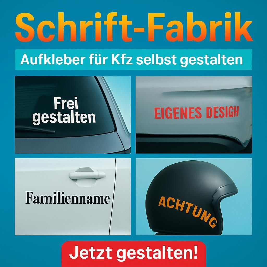 Individuelle Auswahl aus unzähligen Varianten im online Konfigurator - WUNSCHTEXT - MOTIV - AUFKLEBER HIER SELBST GESTALTEN Unzählige Auswahl an Varianten mit Vorschaufunktion! Wir sind Ihre Quelle für günstige Aufkleber und Beschriftungen nach Wunsch und Maß! Dieses Angebot gilt nur in Verbindung m