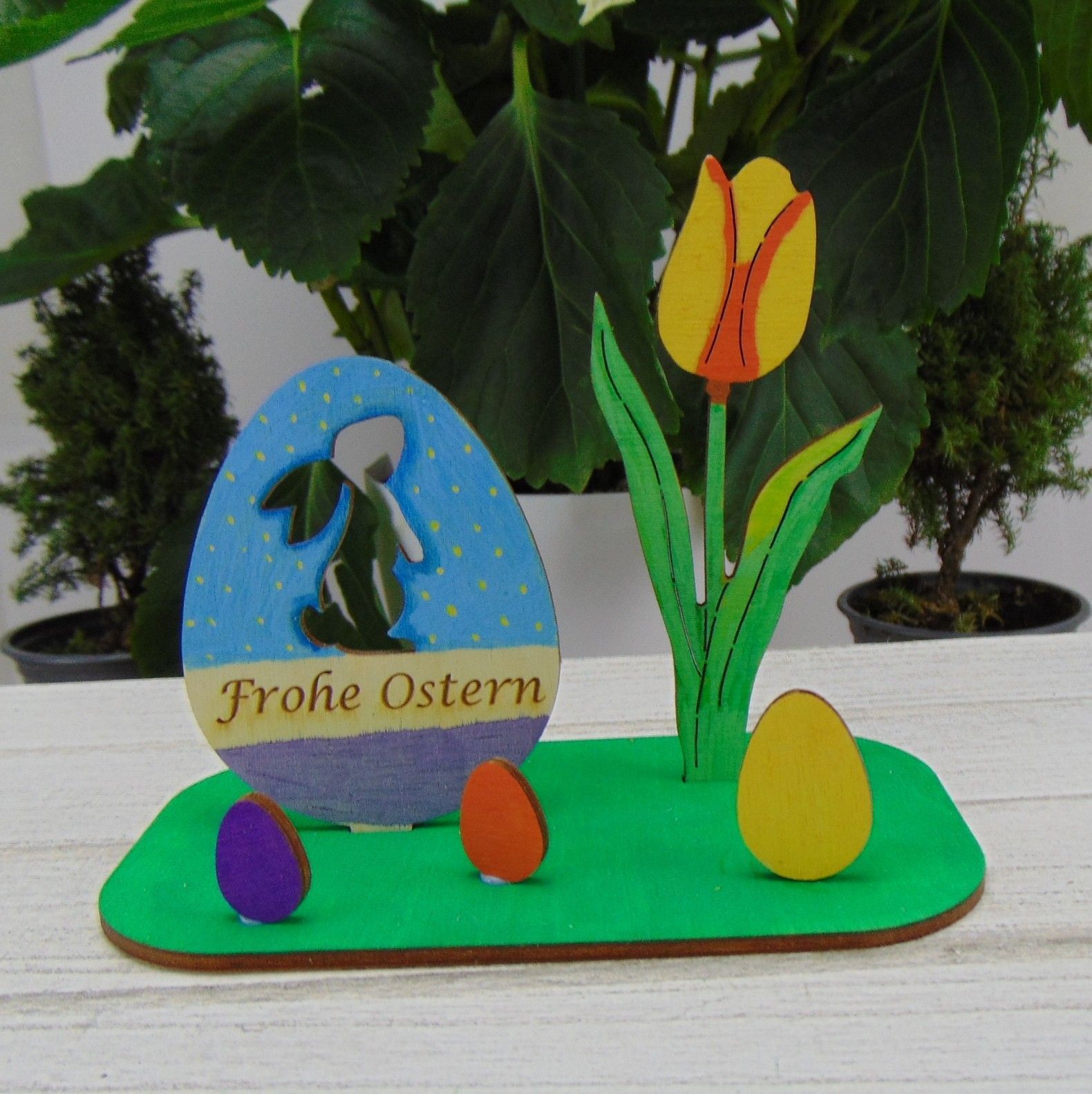 Ostereier aus Holz mit der Aufschrift " Wunschname " Die Tischdeko Ostern liefern wir mit einer Unterplatte in der Größe 128 x 55 mm zum Hinstellen, einem Osterei mit ausgeschnittenen Osterhasen und einer Tulpe plus 3 Eier Personalisiert Sie erhalten insgesamt 6 Teile, die zusammengesteckt und für eine Langlebigkeit geklebt werden können. Unser kreatives Geschenkeset besteht aus 3 mm Naturholz, naturbelassen und kann mit Acrylfarben oder Poscastiften bemalt werden.