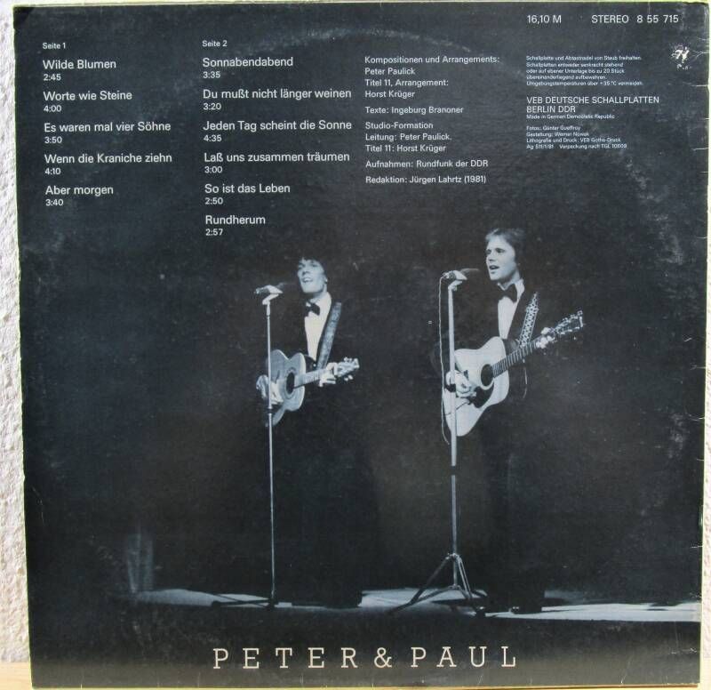 Peter & Paul Amiga 8 55 715 1981 Vinyl: VG Cover: VG A1 Wilde Blumen2:45 A2 Worte wie Steine 4:00 A3 Es waren mal vier Söhne 3:50 A4 Wenn die Kraniche ziehen 4:10 A5 Aber Morgen 3:40 B1 Sonnabendabend 3:35 B2 Du musst nicht länger weinen 3:20 B3 Jeden Tag scheint die Sonne 4:35 B4 Lass uns zusammen