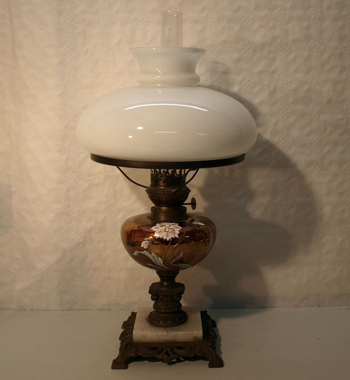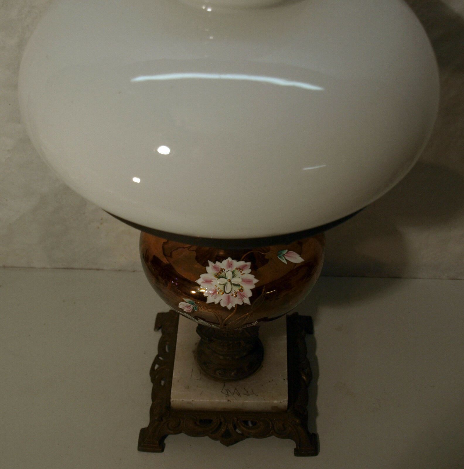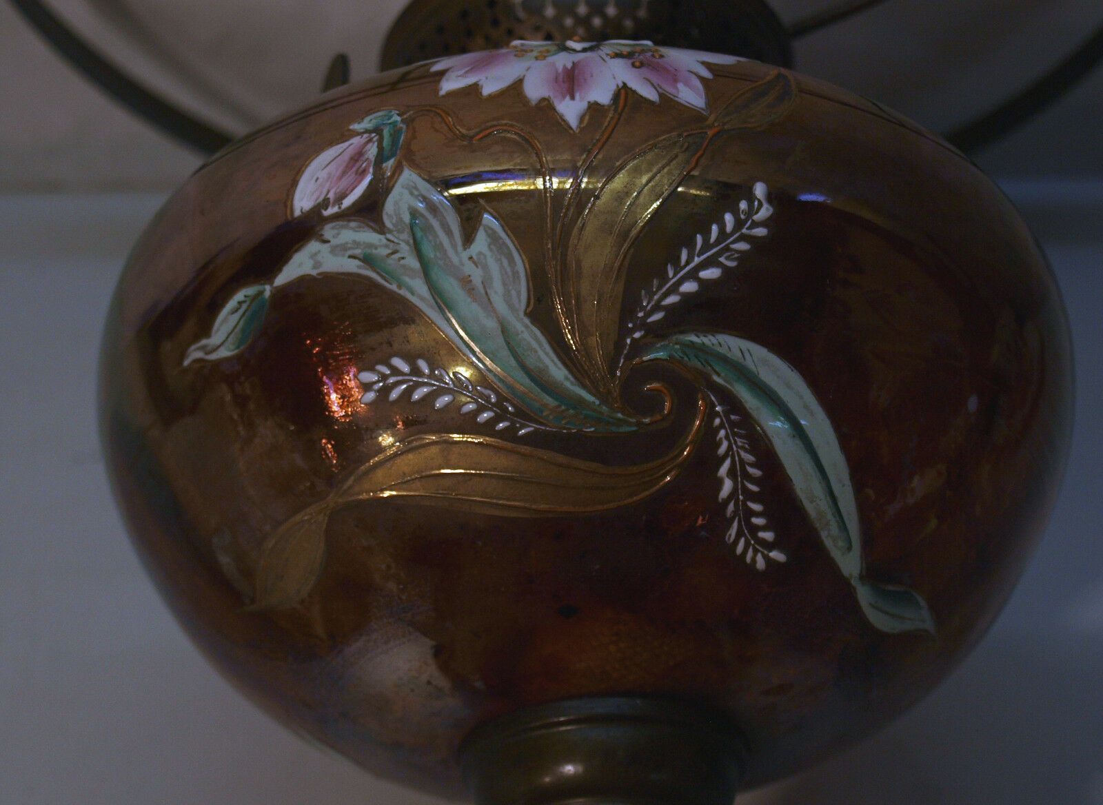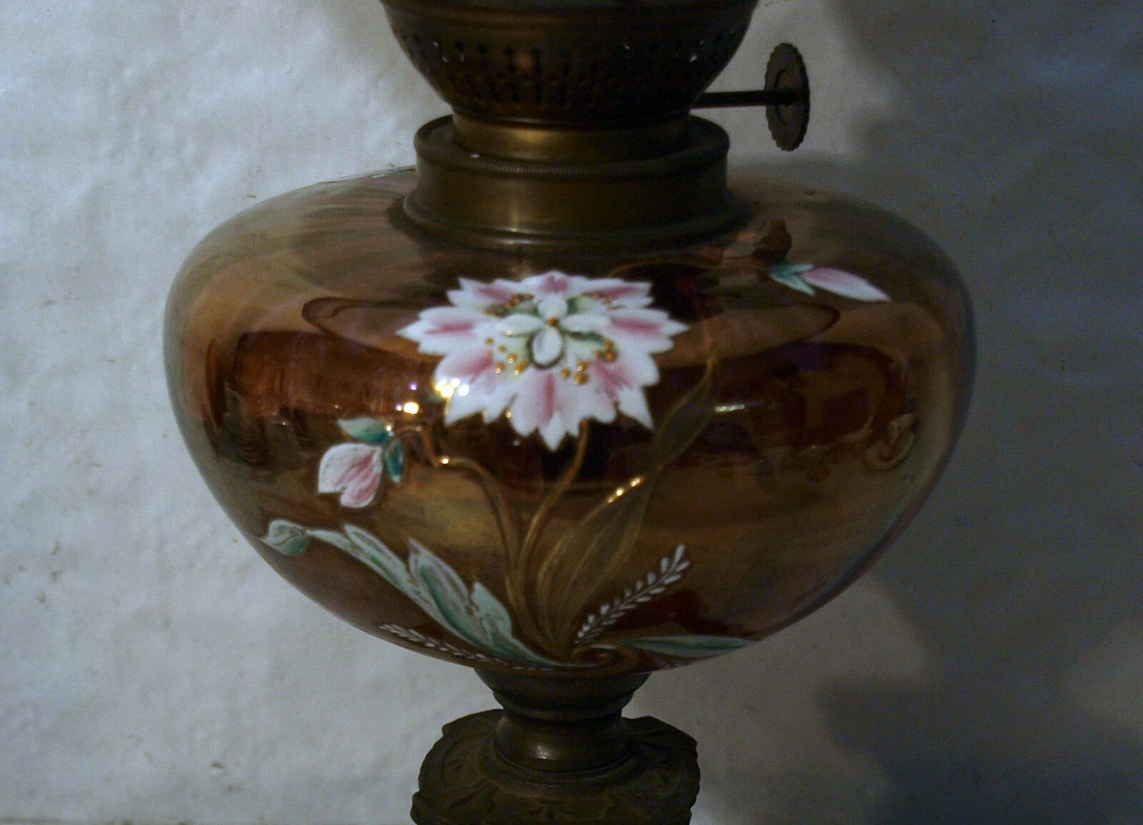 Petroleum-Tischlampe um 1900 (Jugendstil). Material: Glaskorpus handbemalt. Gute Erhaltung. Maße: H 53 cm. Antikes am Deich - Inh: Oliver Kipp-Trense
