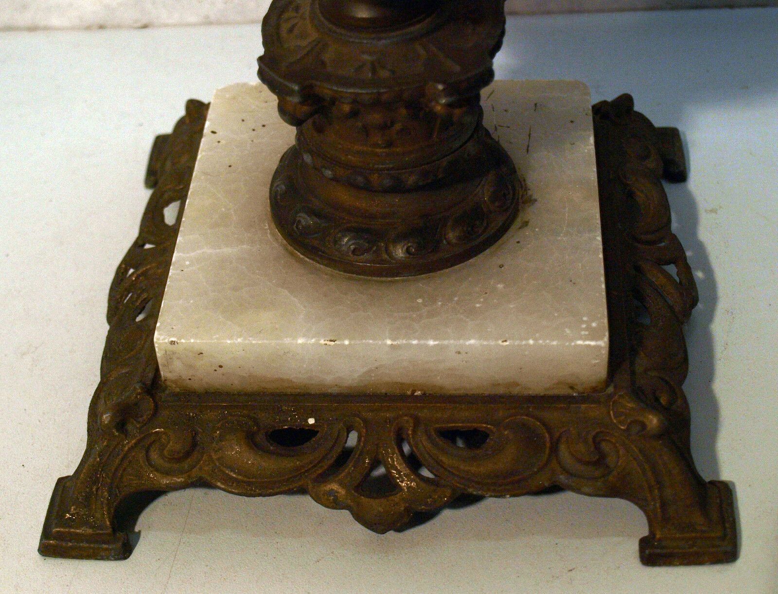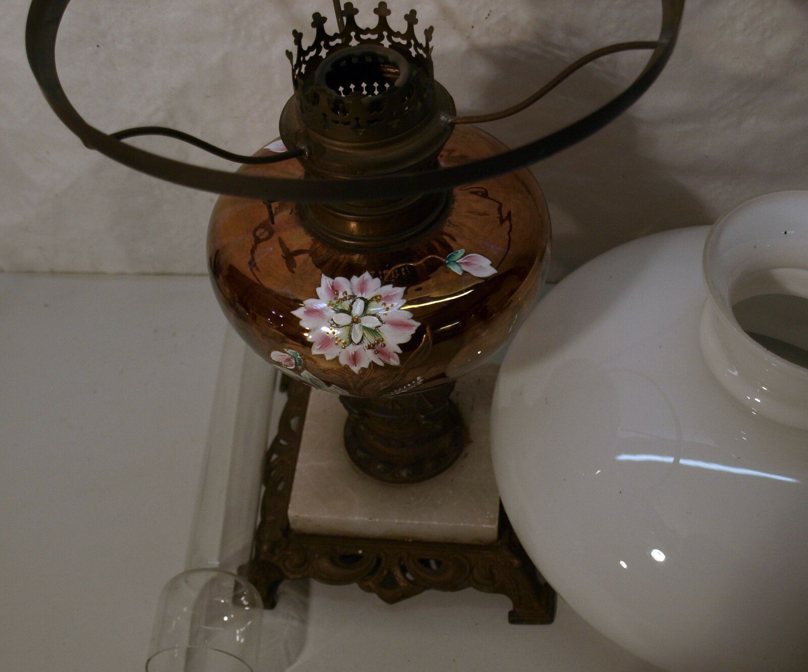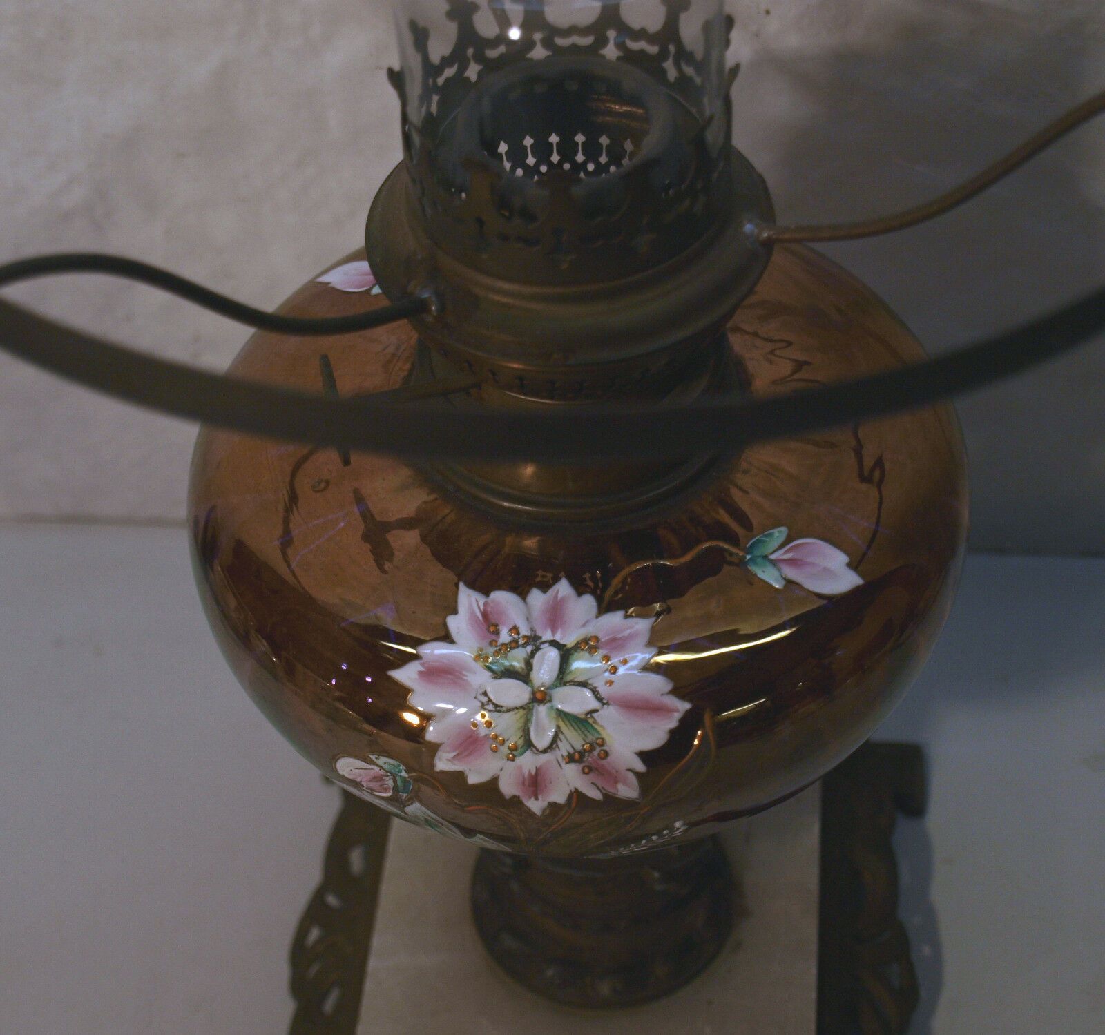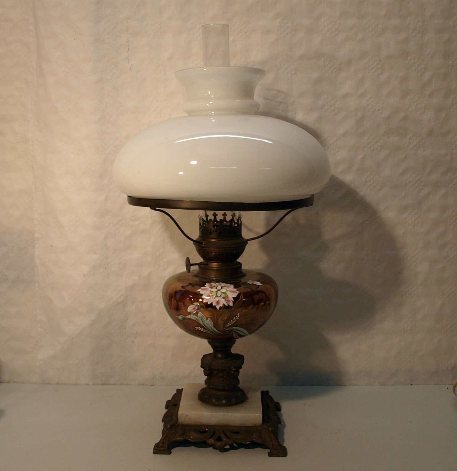 Petroleum-Tischlampe um 1900 (Jugendstil). Material: Glaskorpus handbemalt. Gute Erhaltung. Maße: H 53 cm. Antikes am Deich - Inh: Oliver Kipp-Trense