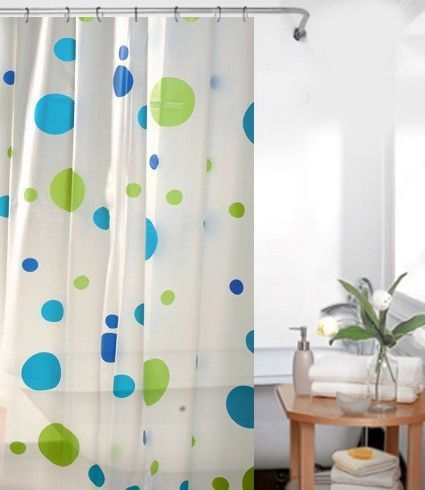 Duschvorhang mit blauen und grünen Punkten wie abgebildet Inkl. weiße Qualitätsringe mit Klickverschluss 120 cm breit 200 cm hoch Merkmale umweltfreundliches recyclefähiges und chloridfreies Material PEVA inkl. weiße Qualitätsringe mit Klickverschluss wasserdicht & abweisend beschichtet eingearbeite