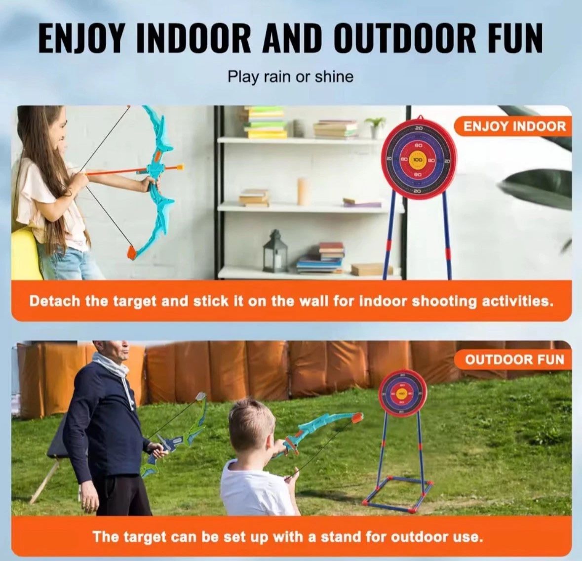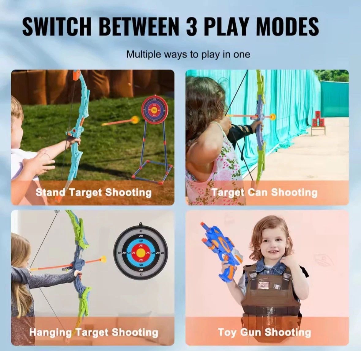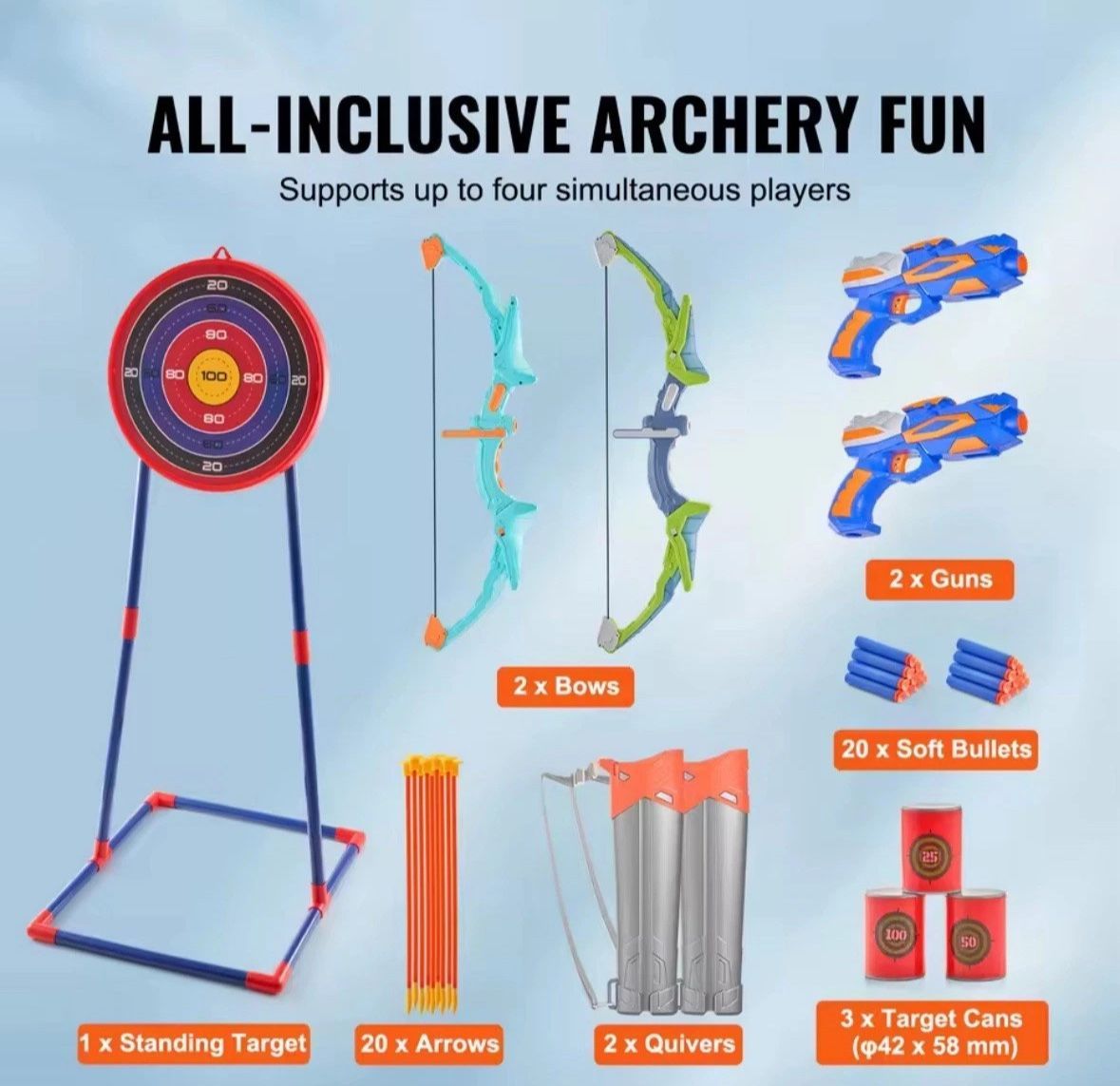 Pfeil & Bogen 2er-Set für Kinder – mit LED-Licht & 20 Saugnapf-Pfeilen Das perfekte Spielzeug für kleine Bogenschützen ab 6 Jahren – ideal für Garten, Terrasse oder Park. Details: 2 komplette Bögen mit LED-Leuchten für besonderen Spielspaß 20 weiche Pfeile mit Saugnapf – si