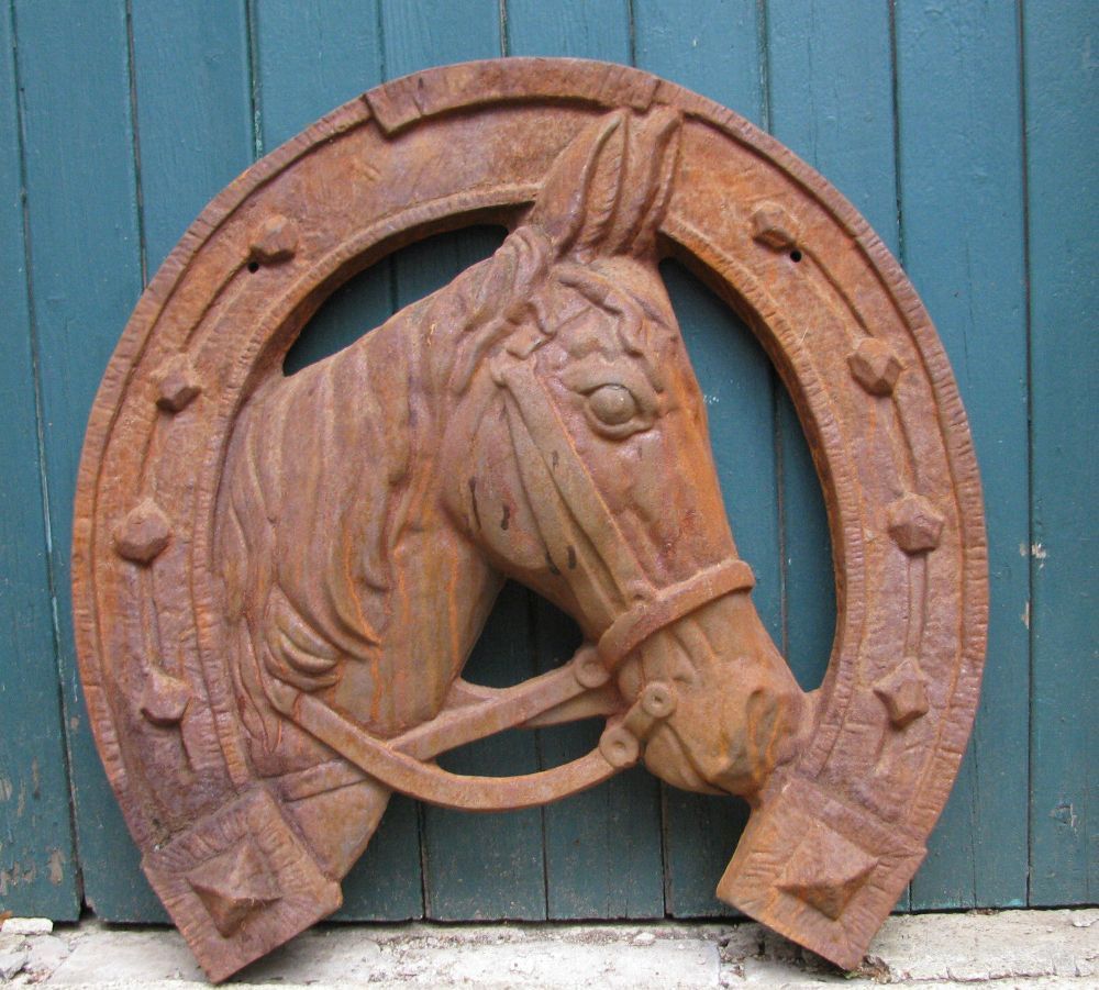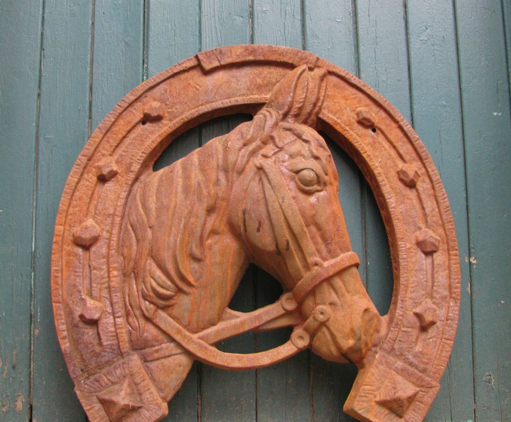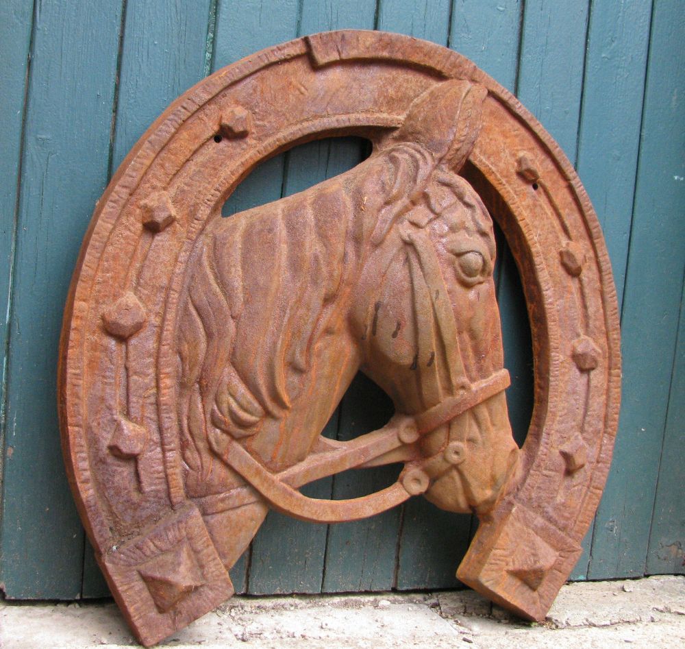 Lebensgroß Gusseisener Pferdekopf im Hufeisen!! Pferd Wir bieten an: ein Hufeisen mit eingearbeitetem Pferdekopf in XXL die höhe beträgt ca.65cm, tiefe 12cm und die breite beträgt ca.60cm das Gewicht beträgt ca.30kg. Das Hufeisen gibt es in Eisen Natur, das bedeutet das das Eisen unbehandelt und ros