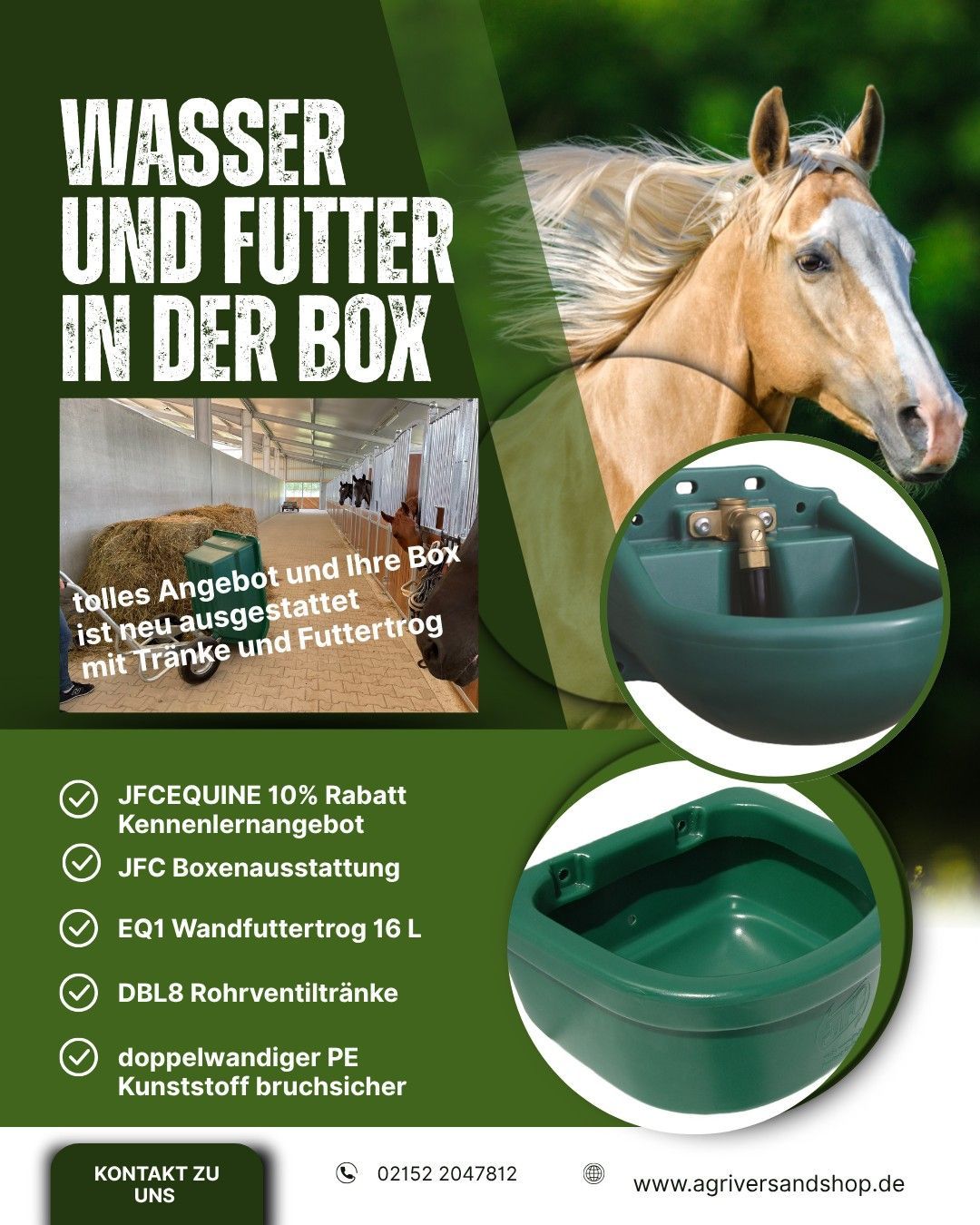 Komplett-Set für den Pferde Stall: Tränke + Futtertrog ? JFC EQUINE DBL8 Tränke – extrem robust, doppelwandig, für Pferde & Rinder geeignet, optional beheizbar (DBL8-H für Frostschutz) ? 15L Futtertrog aus Polyethylen – zur Wand- oder Eckmontage, mit Reinigungsablauf und verstärkten Kanten ? Jetzt Bundle sichern und Tiere das ganze Jahr zuverlässig mit Wasser & Futter versorgen – wartungsarm, stabil und hygienisch! ? Gleich bestellen – solange verfügbar!