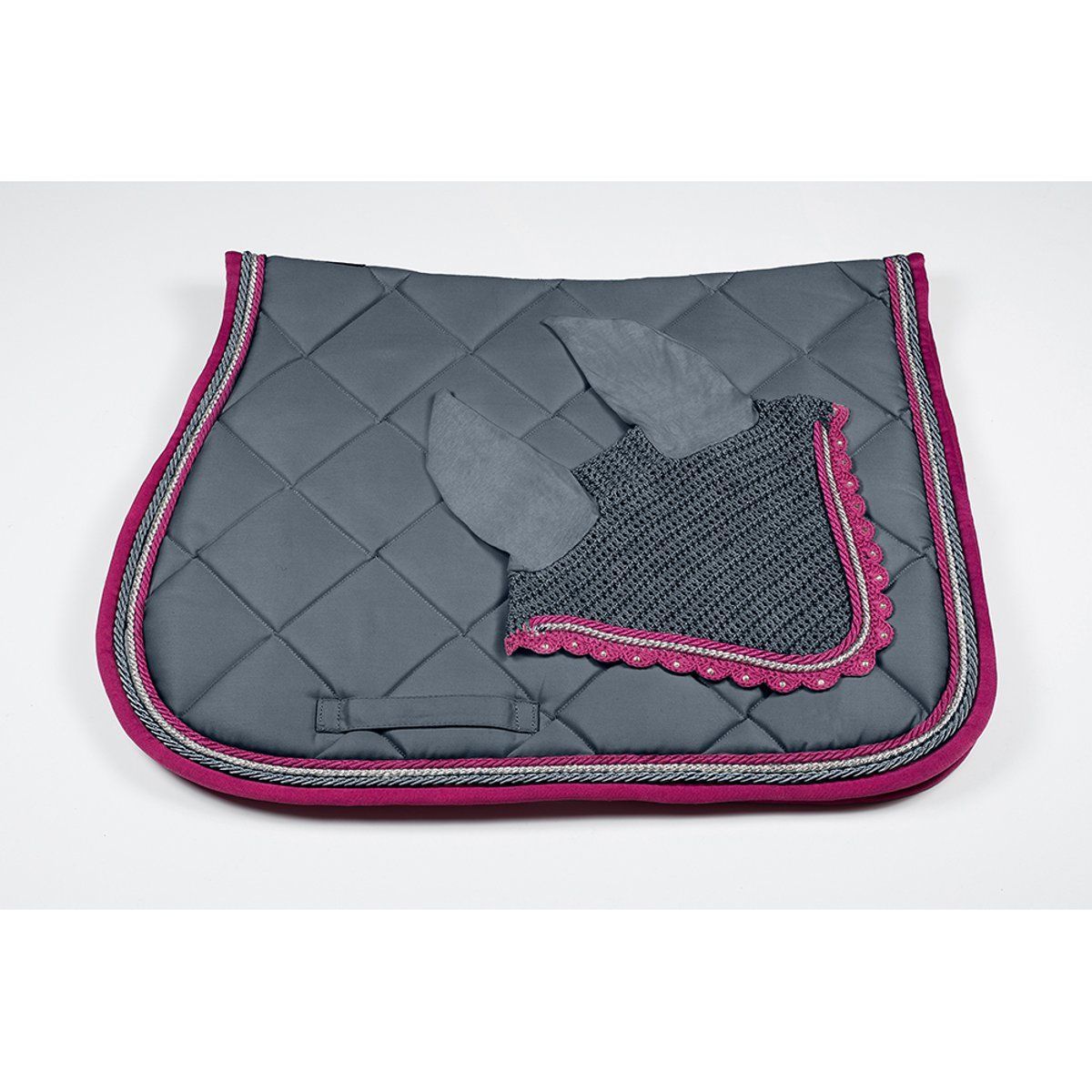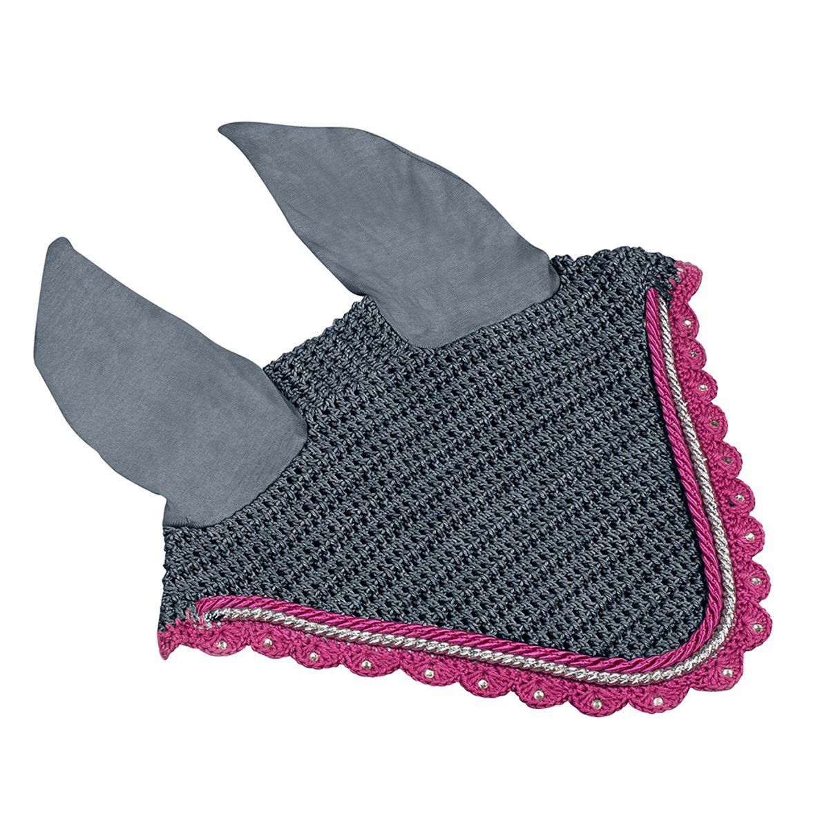Pfiff PFIFF Fliegenhaube mit Zierkordeln - Warmblut - grau/pink