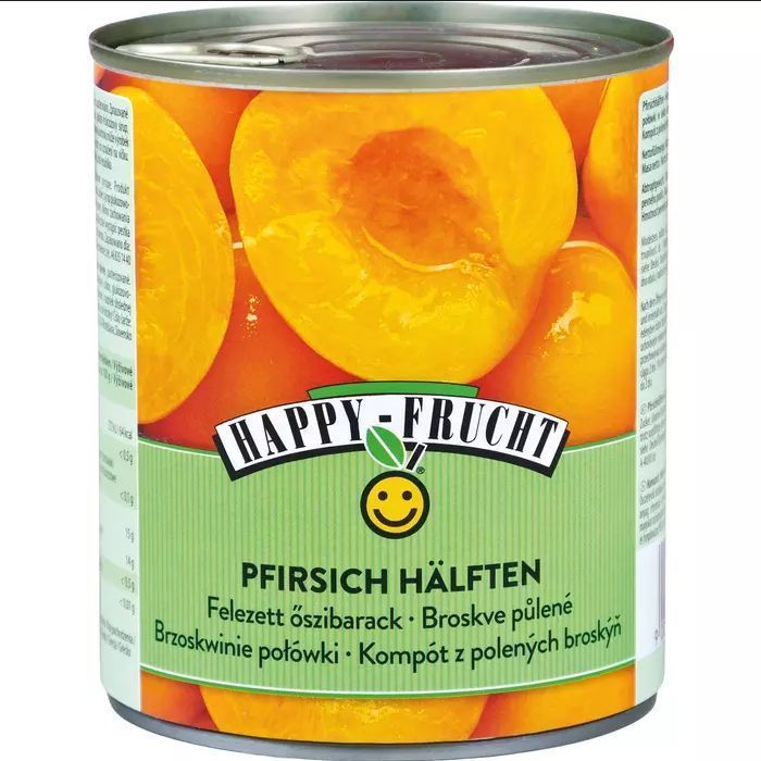 Happy Frucht Pfirsichhälften eingelegt in Wasser und Zucker 820g - 3 Varianten Stückzahl Zutaten: Pfirsiche, Wasser, Zucker, Säuerungsmittel: Citronensäure. Brennwert [KJ] 265 kj Brennwert [kcal] 63 kcal Kohlenhydrate gesamt 15 g Kohlenhydrate, davon Zucker 13 g Fett gesamt [g] < 0,5 g Fett, davo