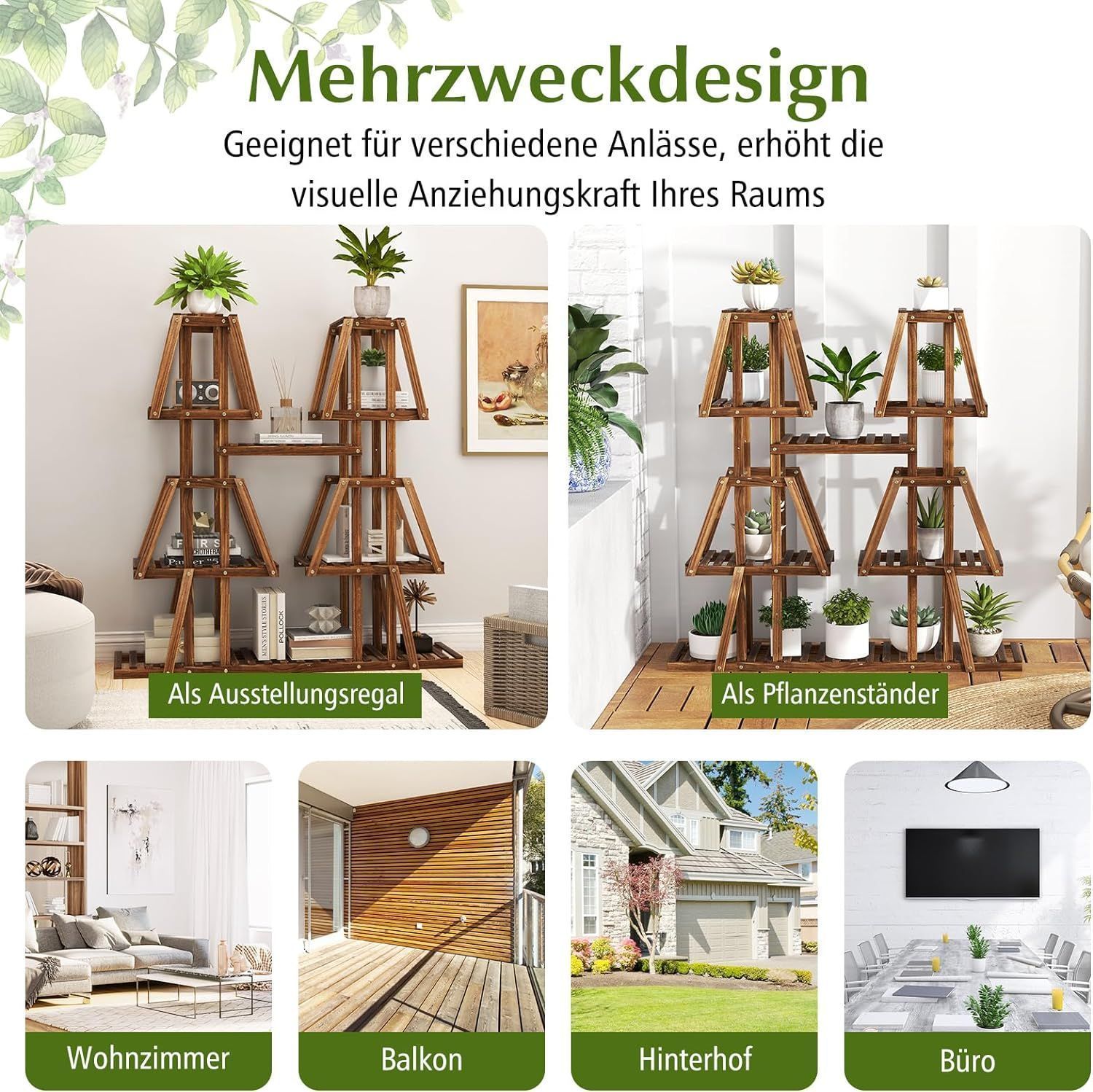 Unser 5-stöckiger Pflanzenständer aus Holz misst 113 x 27 x 114 cm (L x B x H) und verfügt über 10 Regale für Topfpflanzen mit einer Hoch-Tief-Struktur, die ausreichend Platz für das Pflanzenwachstum bietet und für volles Sonnenlicht sorgt, das allen Pflanzen zugute kommt. Darüber hinaus schafft der Pflanzenständer mit seinem einzigartigen und ansprechenden symmetrischen Trapezdesign auch eine einladende Atmosphäre in Ihrem Wohnraum.