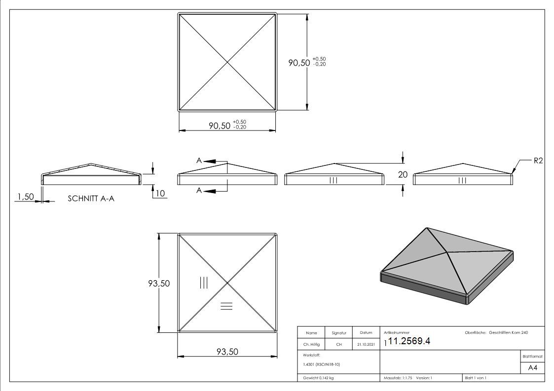 Pfostenkappe Edelstahl für Vierkantrohr: 90x90 mm geschliffen V2A