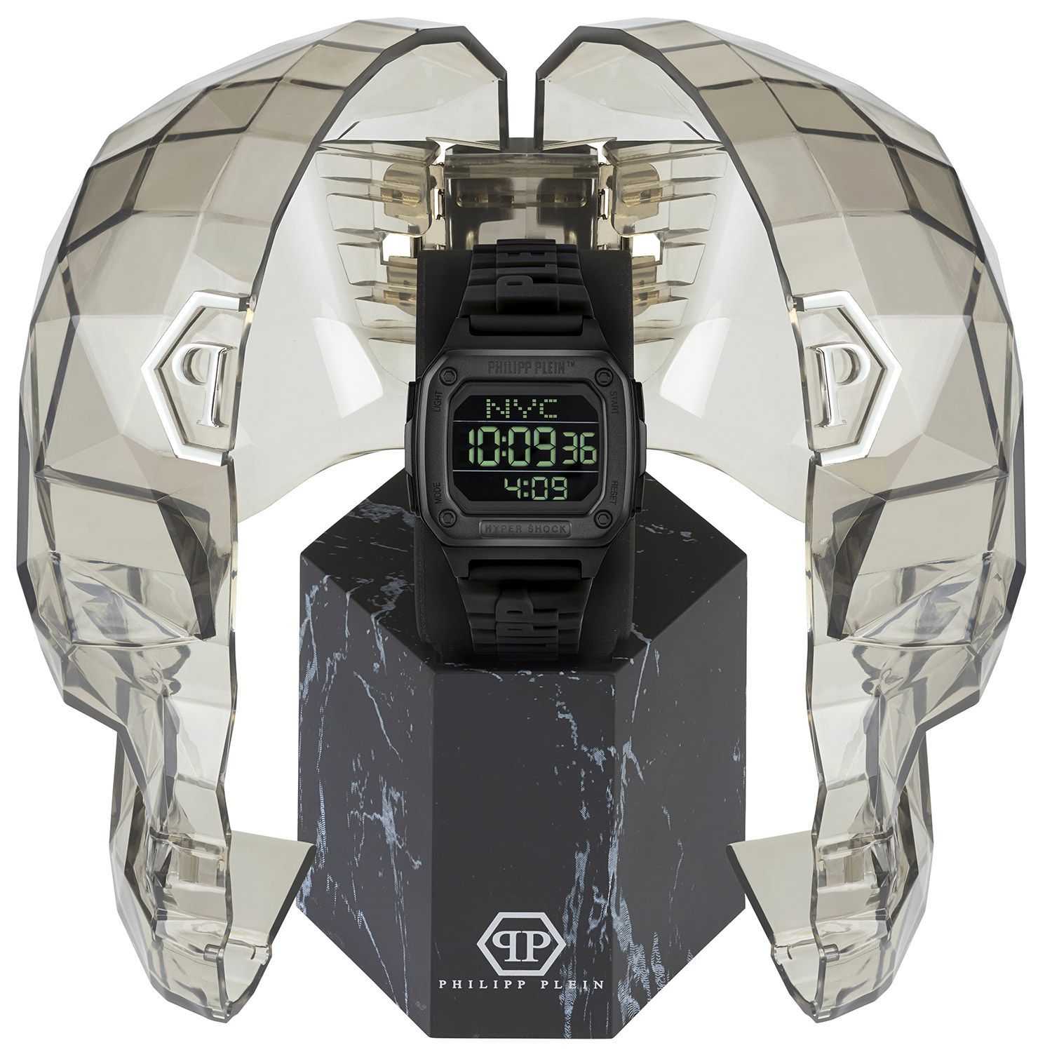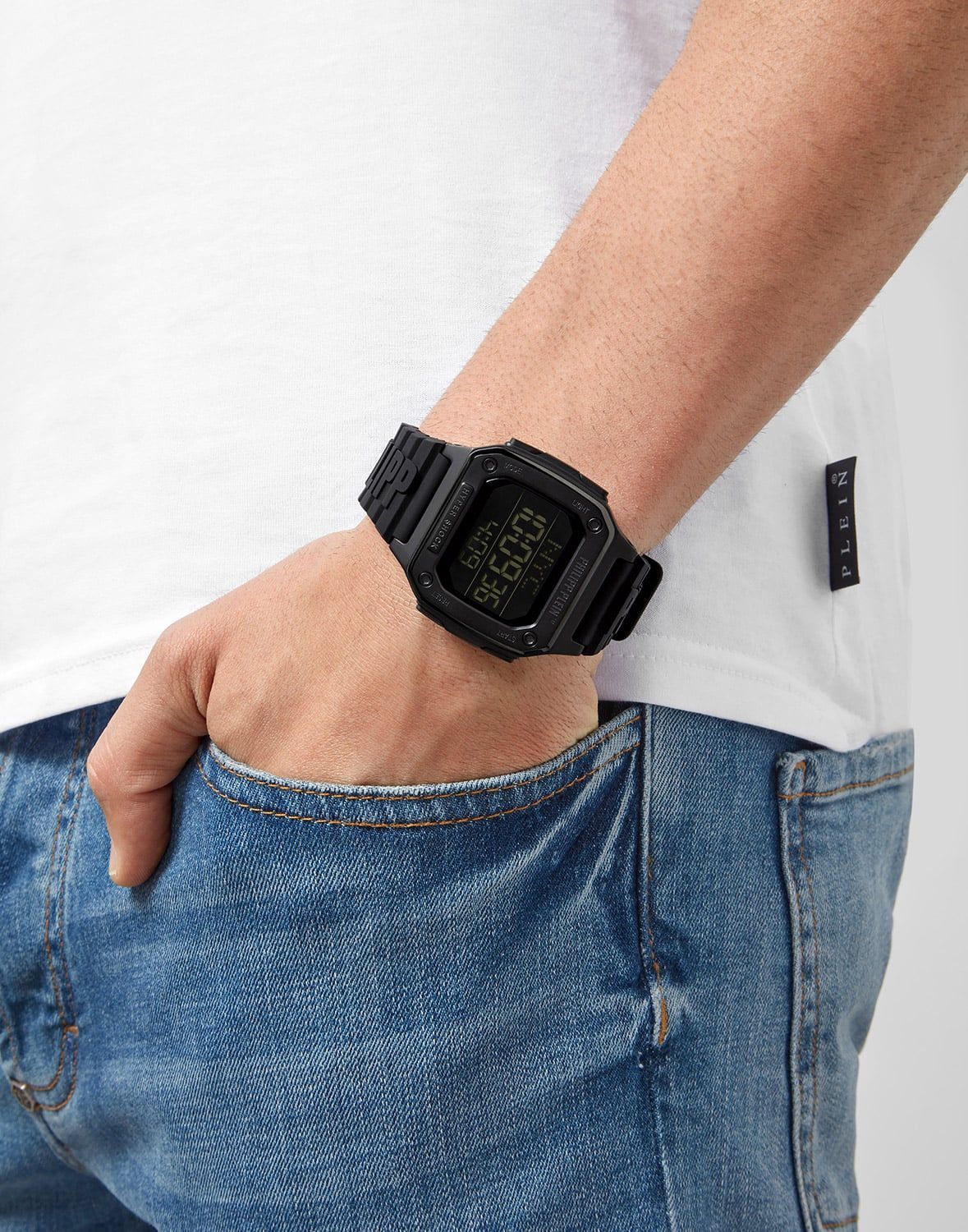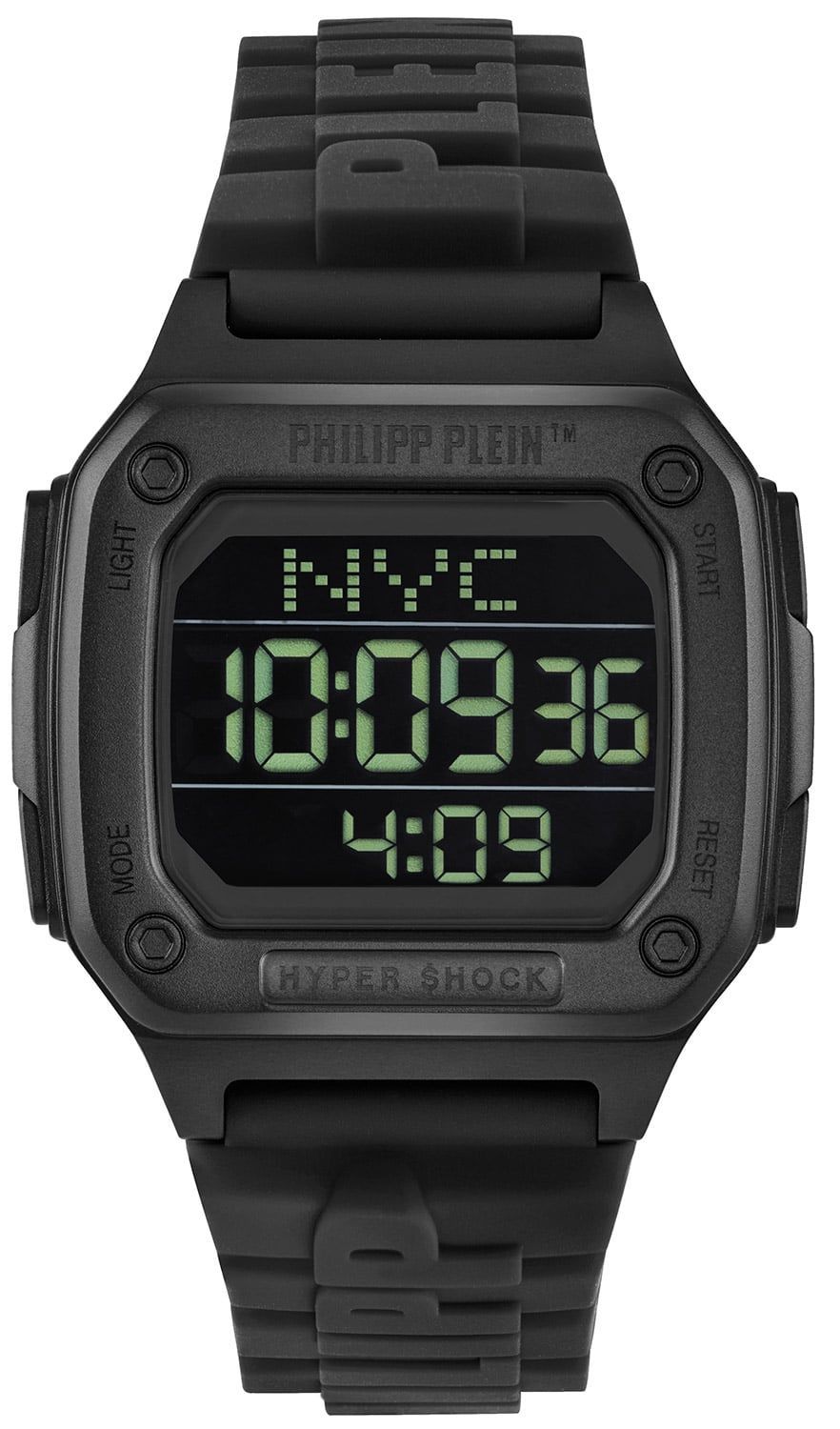 coole Armbanduhr in Unisexgröße, präzises Quarzwerk, digitale Anzeige von Uhrzeit, Datum und Wochentag, Stopp- und Timerfunktion, 3 Alarme einstellbar, Hintergrundbeleuchtung, mattiertes, schwarz ionen-plattiertes Edelstahl-Gehäuse, polierte Kanten, Lünette verziert mit Logogravur, geschraubter Gehäuseboden, kratzunempfindliches Mineralglas, Armband aus schwarzem Silikon, akzentuiert durch einen erhabenen Logo-Schriftzug, matte Dornschließe mit Logo, wasserdicht bis 5 bar, Breite 47 mm, Höhe 12