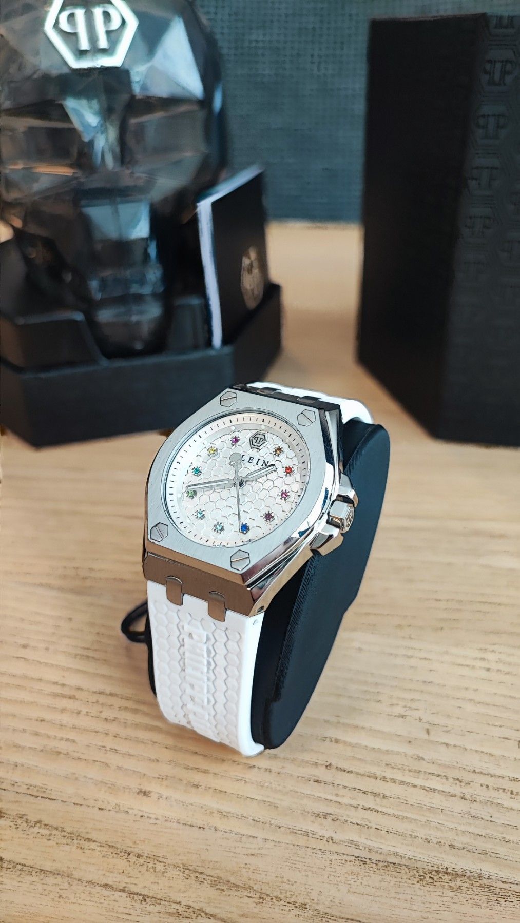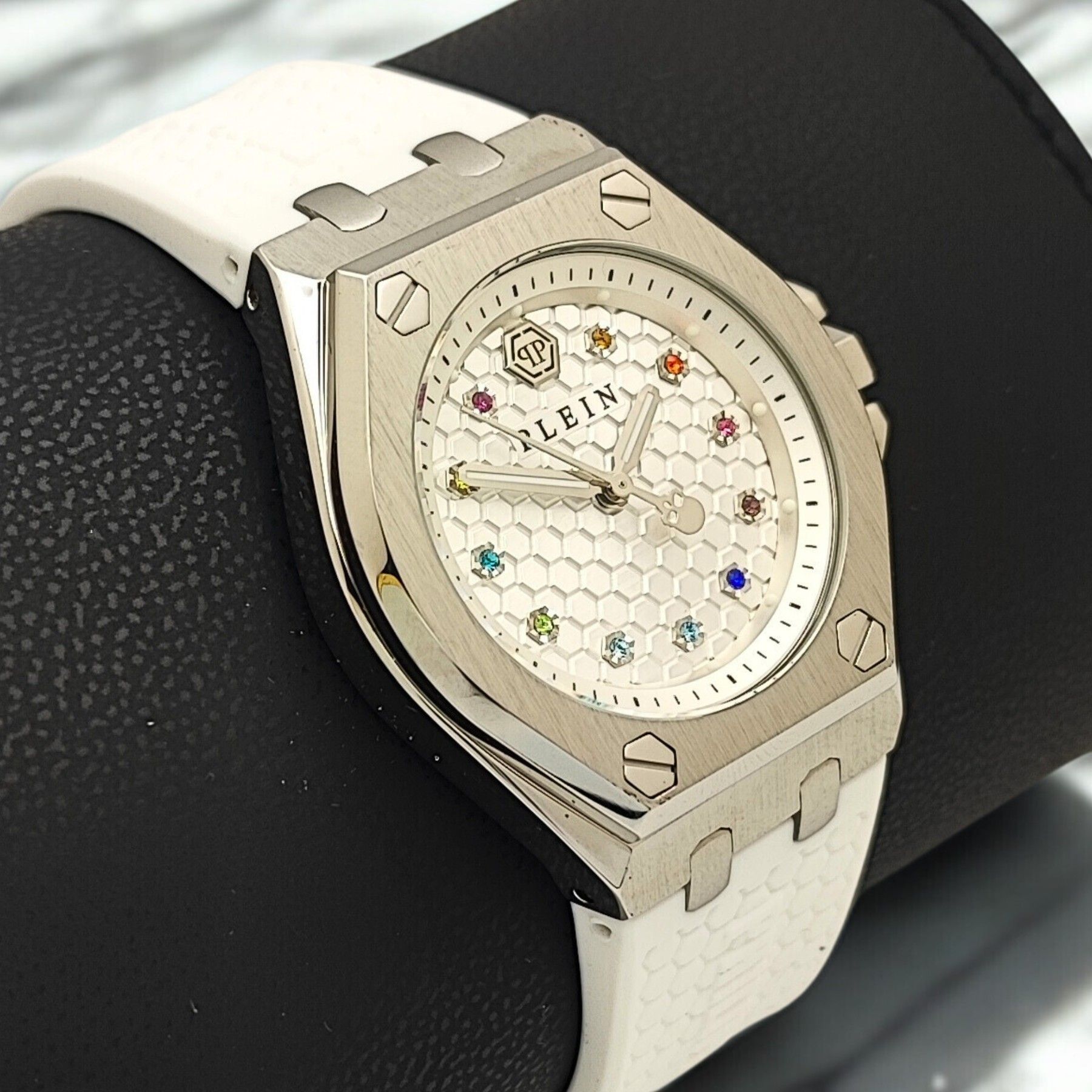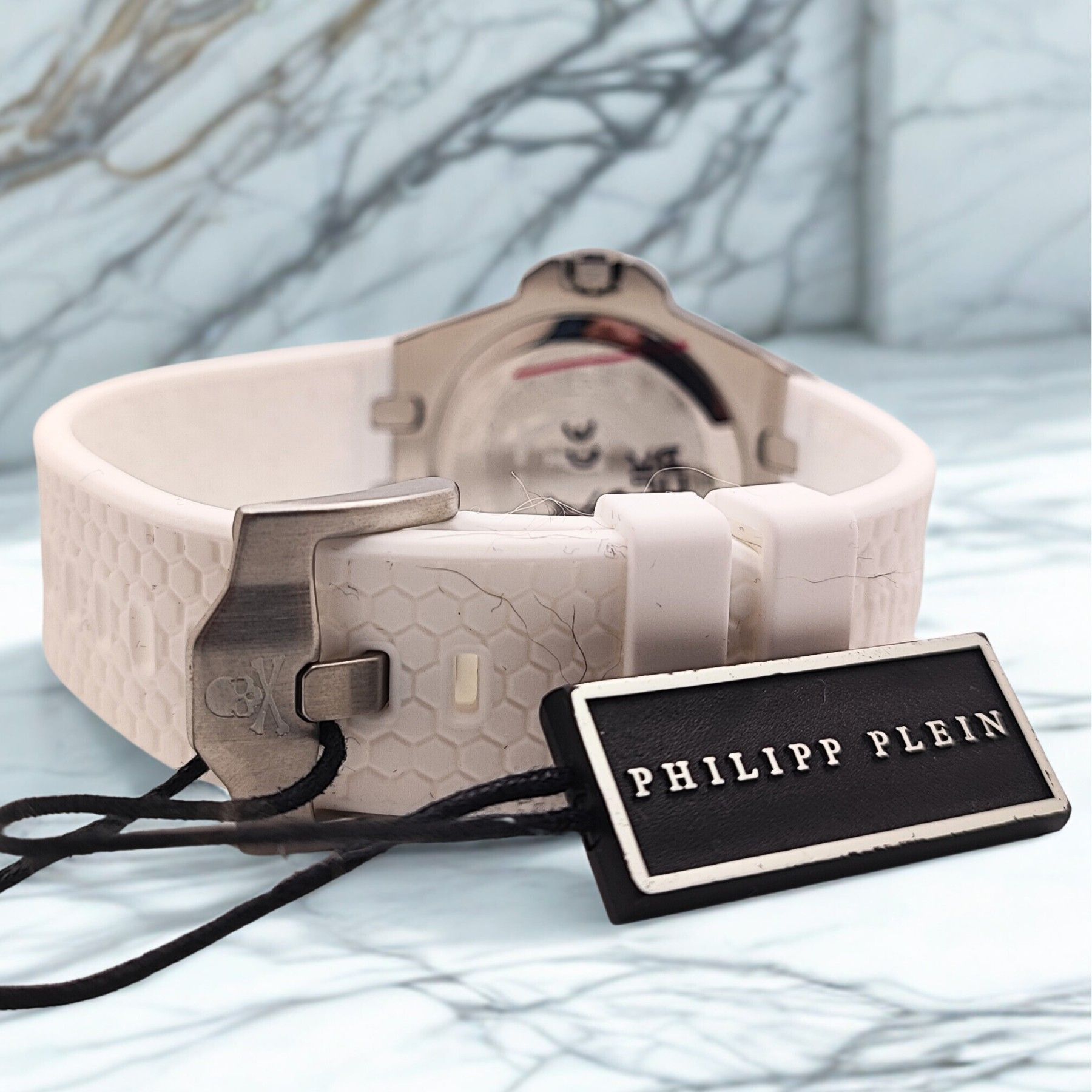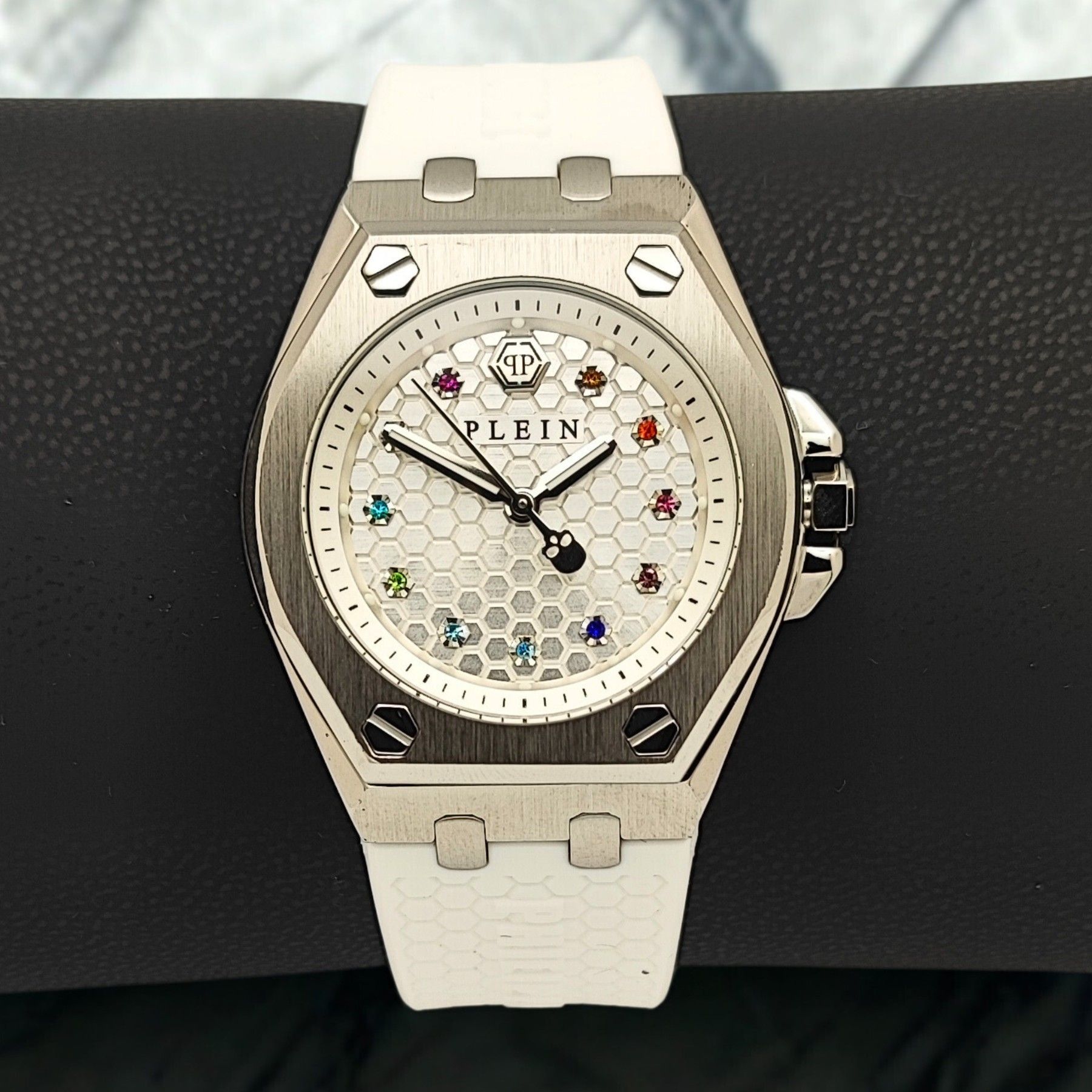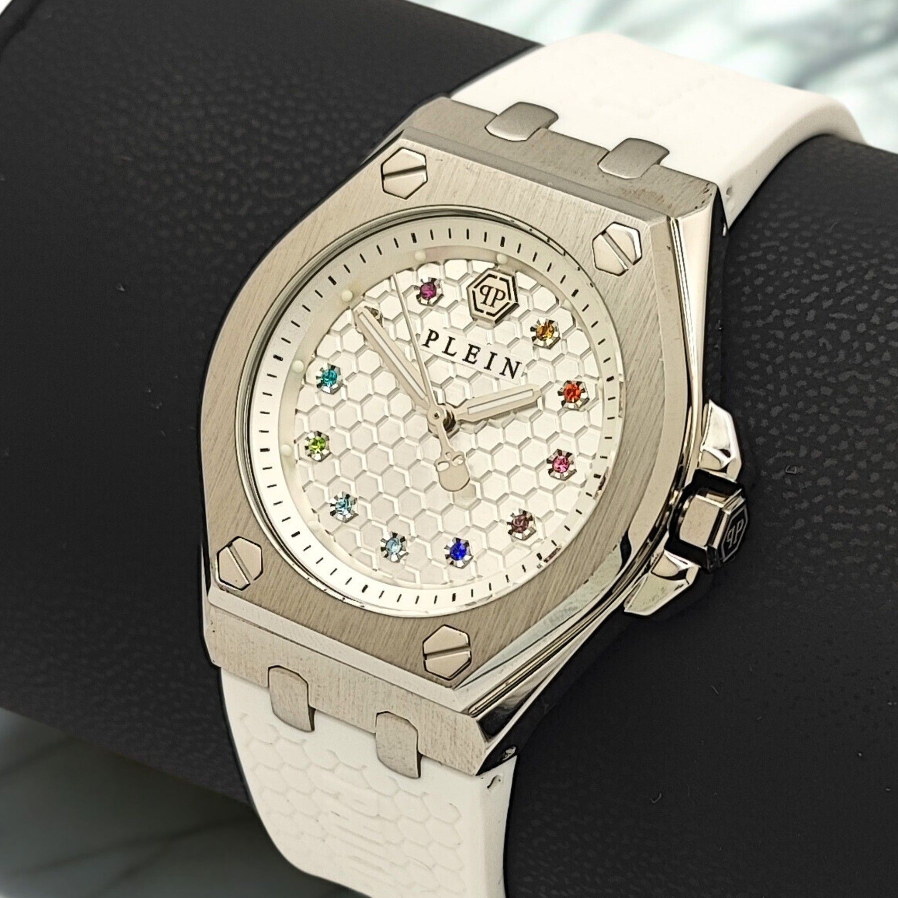 PWJAA0122 - Philipp Plein - Plein Extreme Lady - Damenuhr Beschreibung: Die Philipp Plein Plein Extreme Lady ist eine moderne Damenuhr, die mit ihrem silbernen Edelstahlgehäuse und dem weißen Kautschukband einen sportlich-eleganten Look vereint. Das Zifferblatt wird durch funkelnde Edelsteine aufgew
