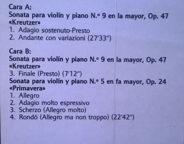 Condition Vinyl Near Mint (NM or M-) Condition Sleeve Near Mint (NM or M-) Tracks included: Sonata Para Violín Y Piano N.º 9 En La Mayor, Op. 47 "Kreutzer" I 1. > 1. Adagio Sostenuto - Presto 2. > 2. Andante Con Varazoni II 1. > 3. Finale (Presto) Sonata Para Viol&iacu