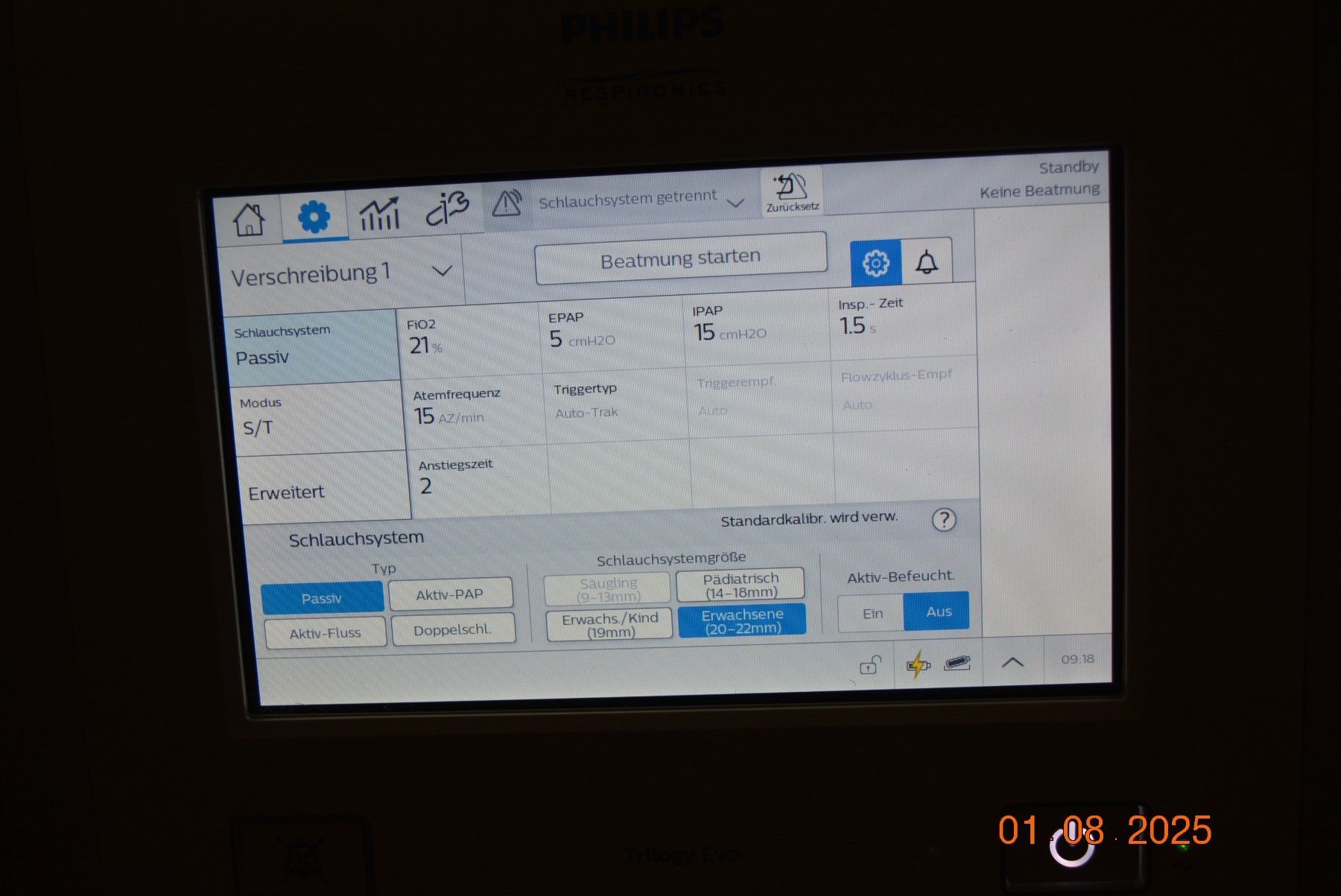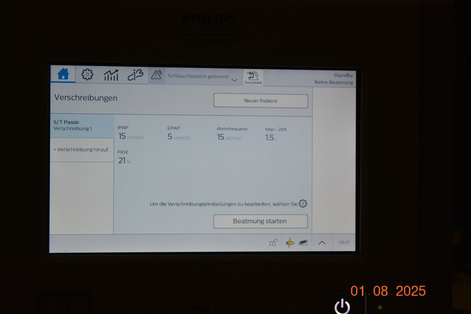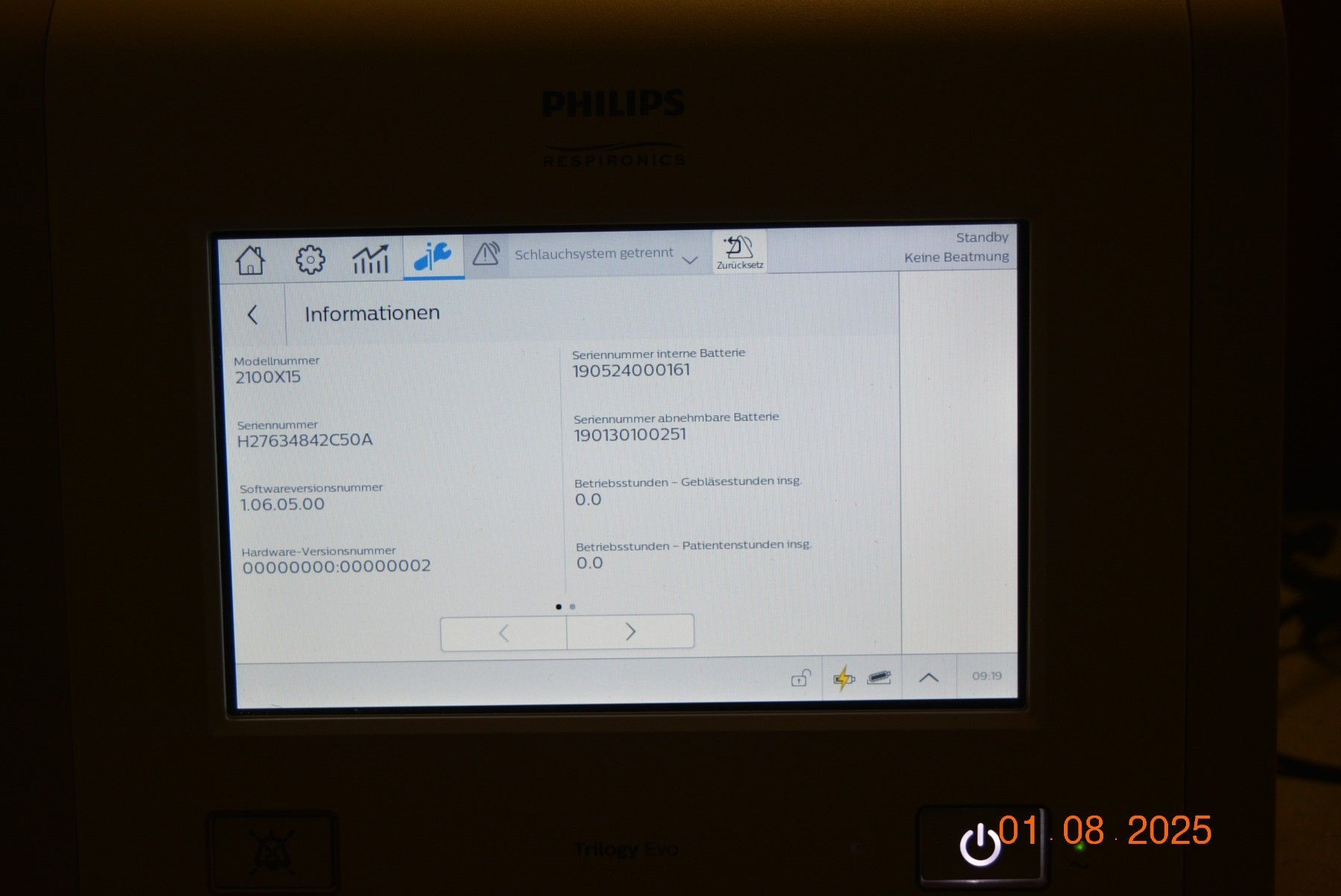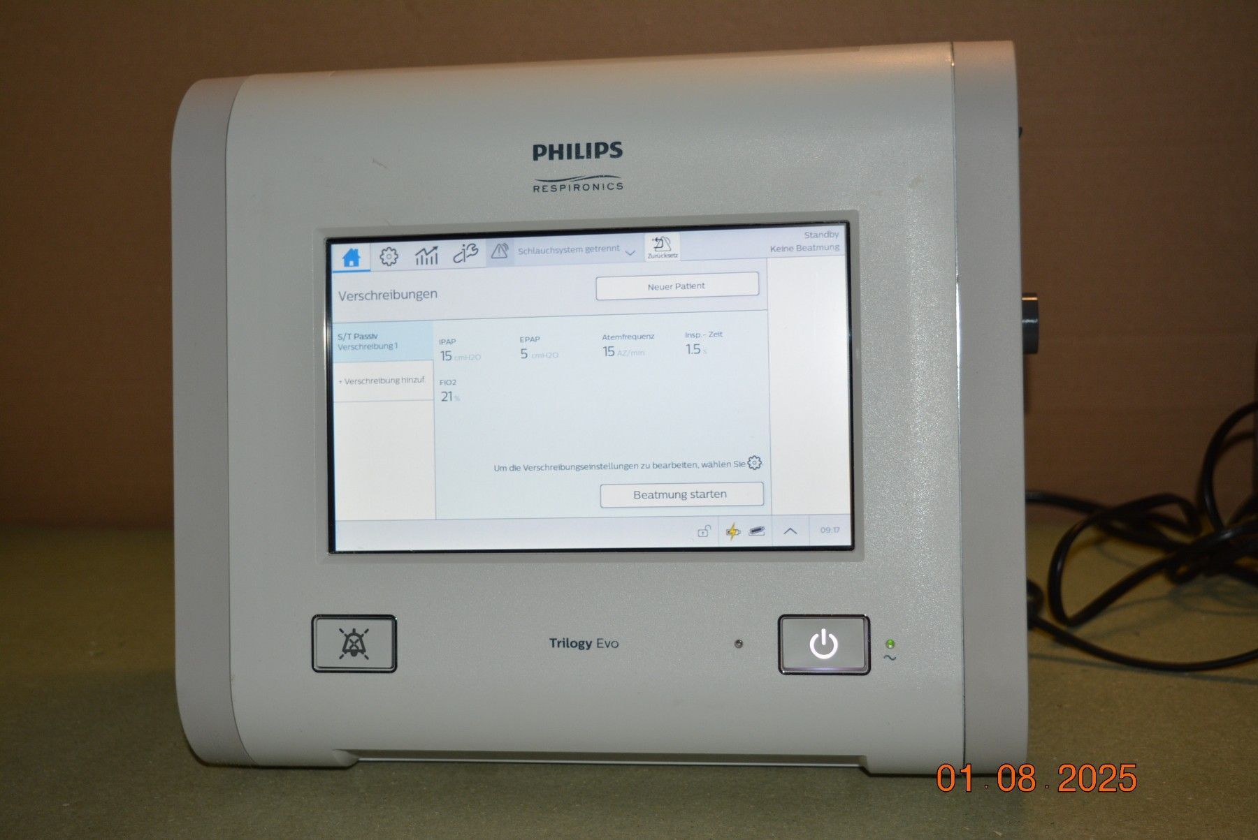 Philips Respironics Trilogy Evo - Mobil (200) DK gebraucht in neuwertigen Zustand kaum Betriebsstunden voll funktionsfähig gereinigt und desinfiziert mit Netzkabel oder Netzteil ist im Originalzustand, CE geprüft geliefert wie auf den Fotos zu sehen ist, kein weiteres Zubehör soweit es Fehler oder D