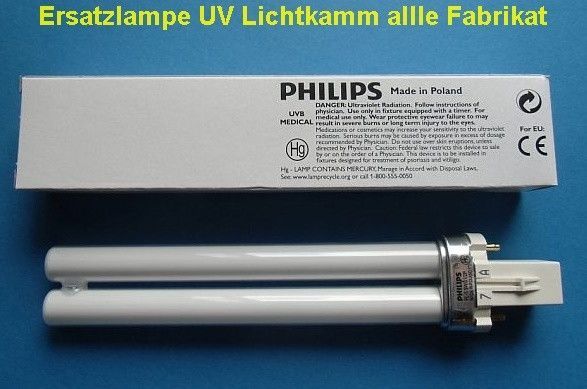• Die UV-Therapielampe PHILIPS PL01 ist für die Schmalband-UVB-Therapie z.B. bei Psoriasis, Ekzemen, urämischem Pruritus, atopischer Dermatitis, Vitiligo u.a. geeignet. In allen UVB-Kämmen anwendbar.