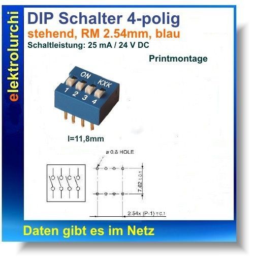 Sie bieten hier auf folgenden Artikel 3 Stück Piano DIP-Schalter 4-polig , DIL, Mäuseklavier, Raster 2,54 x 7,62mm, KXK Polzahl: 4 Rastermaß: 2,54 x 7,62 mm Belastungsgrenze: Belastungsgrenze Spezifikation:Kontakte einzeln schaltbar Farbe: blau Anschluss: Printmontage Höhe: 11,7 x 9,8 x 5,4mm Lebens