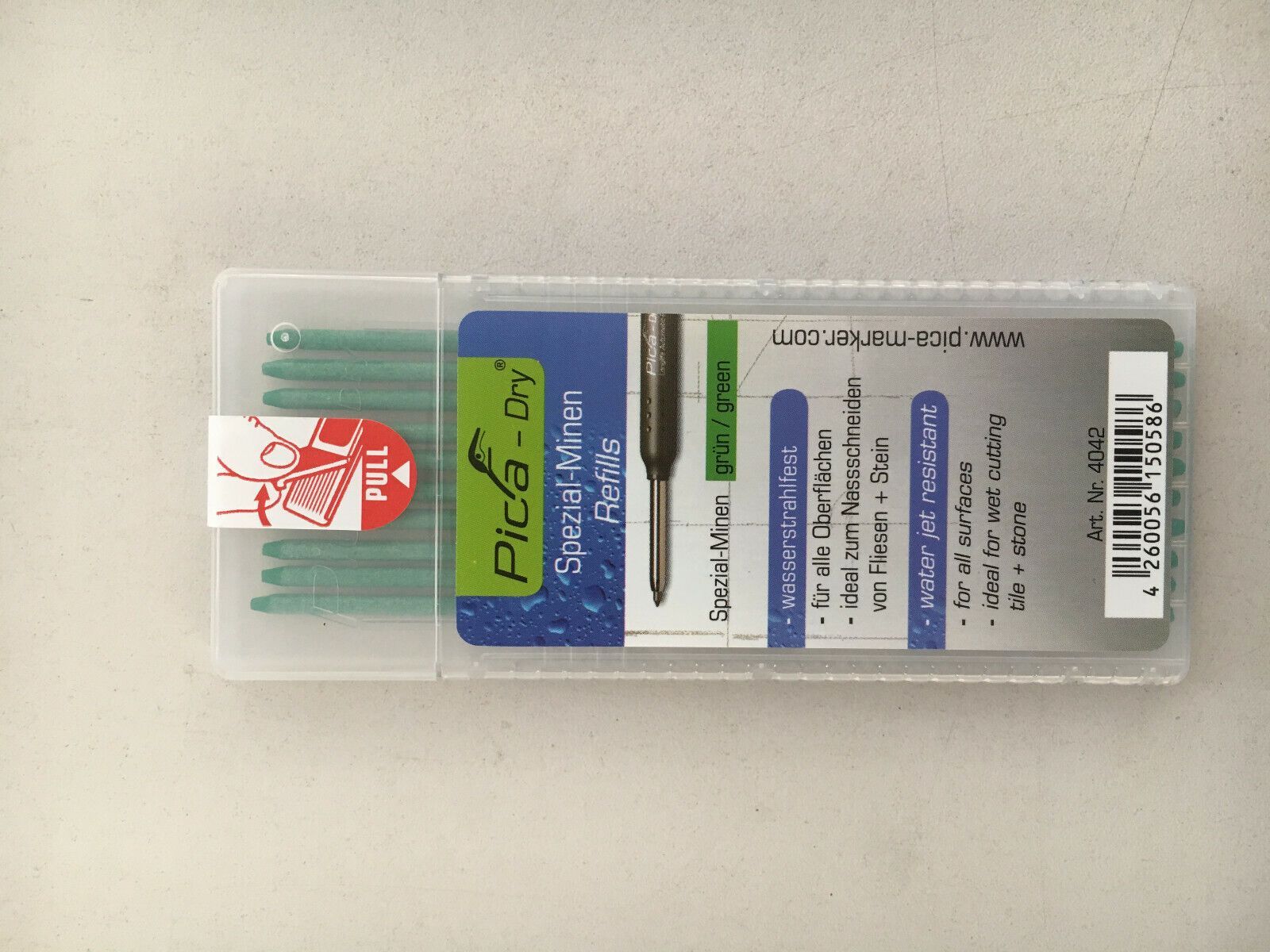 Pica-Dry Ersatz-Minen Inhalt: Etui mit 10x Minen grün passend für Pica-Dry Longlife Automatic Pen (ebenfalls in unserem Shop erhältlich) Wasserstrahlfest, permanent Für fast alle Oberflächen Ideal zum Nass-Schneiden von Fliesen und Stein Chlorid-frei, Minen bereits angespitzt In einer praktischen un