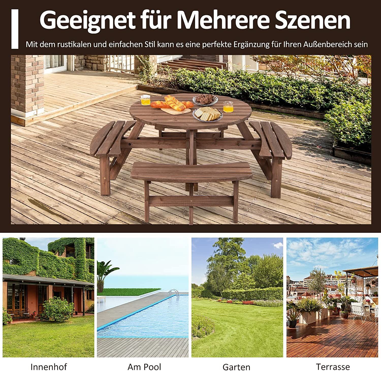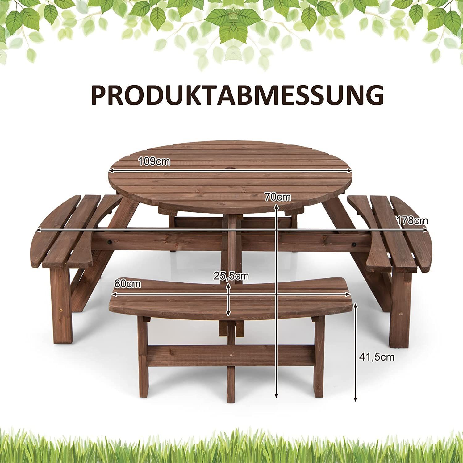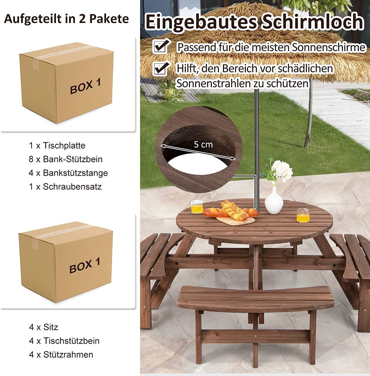 Picknicktisch Set Holz für 8 Personen, Gartentisch mit Schirmloch & 4 Bänken