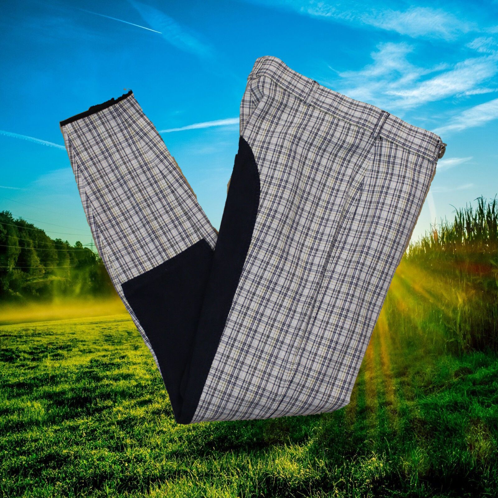 PIKEUR Kinder u. Jugendreithose LUGANA Karo weiß-blau-gelb · 3 4 Vollbesatz-Reithose · perfekte Passform · Reißverschlusstasche vorne · Beinabschluss mit Klett · Mikrocotton-Stoffqualität · atmungsaktiv · dauerelastisch · strapazierfähig &middo