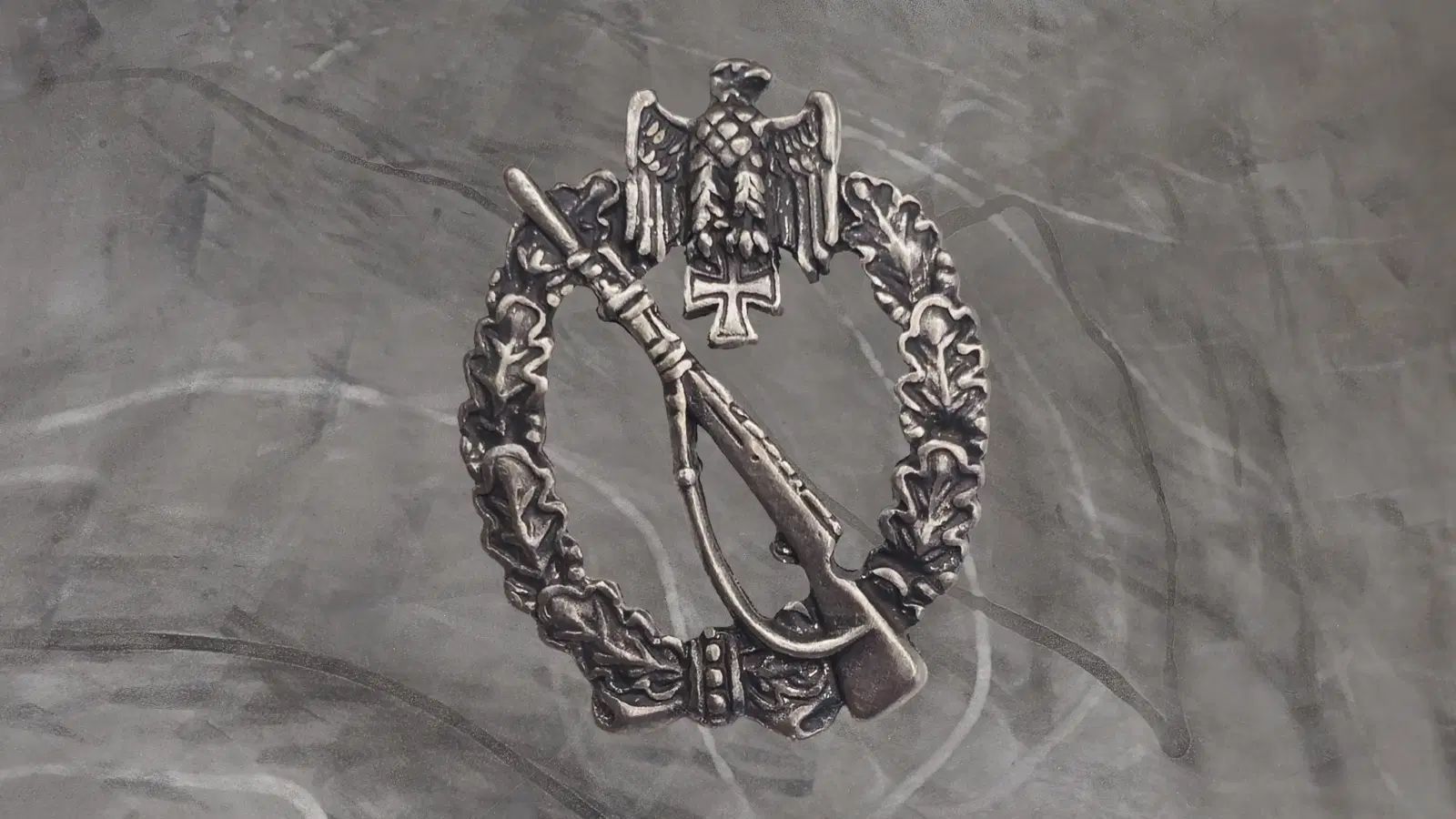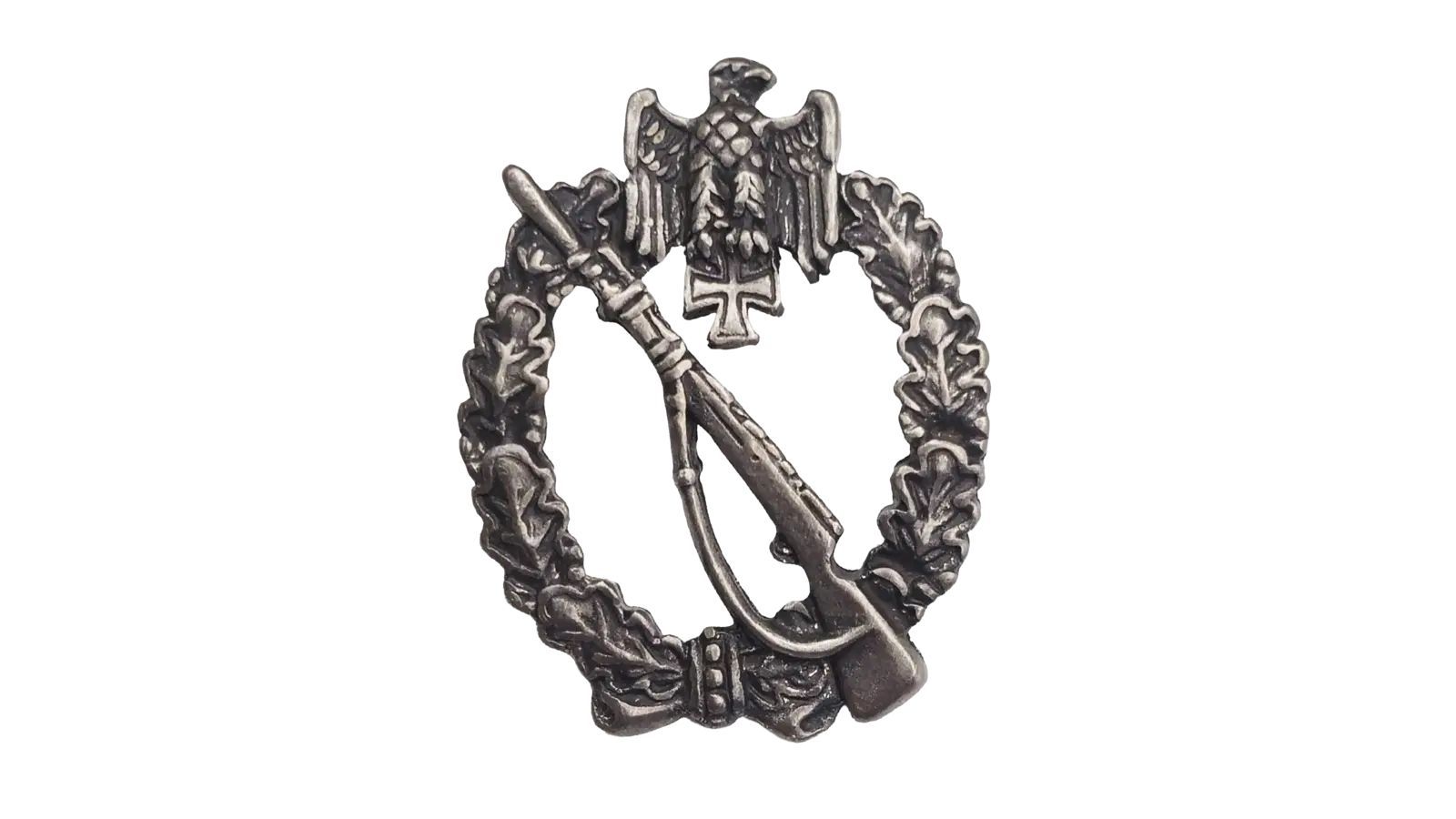 Beschreibung Artikel Details Pin Infanterie Sturmabzeichen - 2,5 x 3 cm Dieser Ansteckpin zeigt das Infanterie Sturmabzeichen in einem kompakten Design von ca. 2,5 x 3 cm. Das Abzeichen besteht aus einem ovalen Eichenlaubkranz mit einem Reichsadler oben, der ein Eisernes Kreuz hält. Quer über das Ab