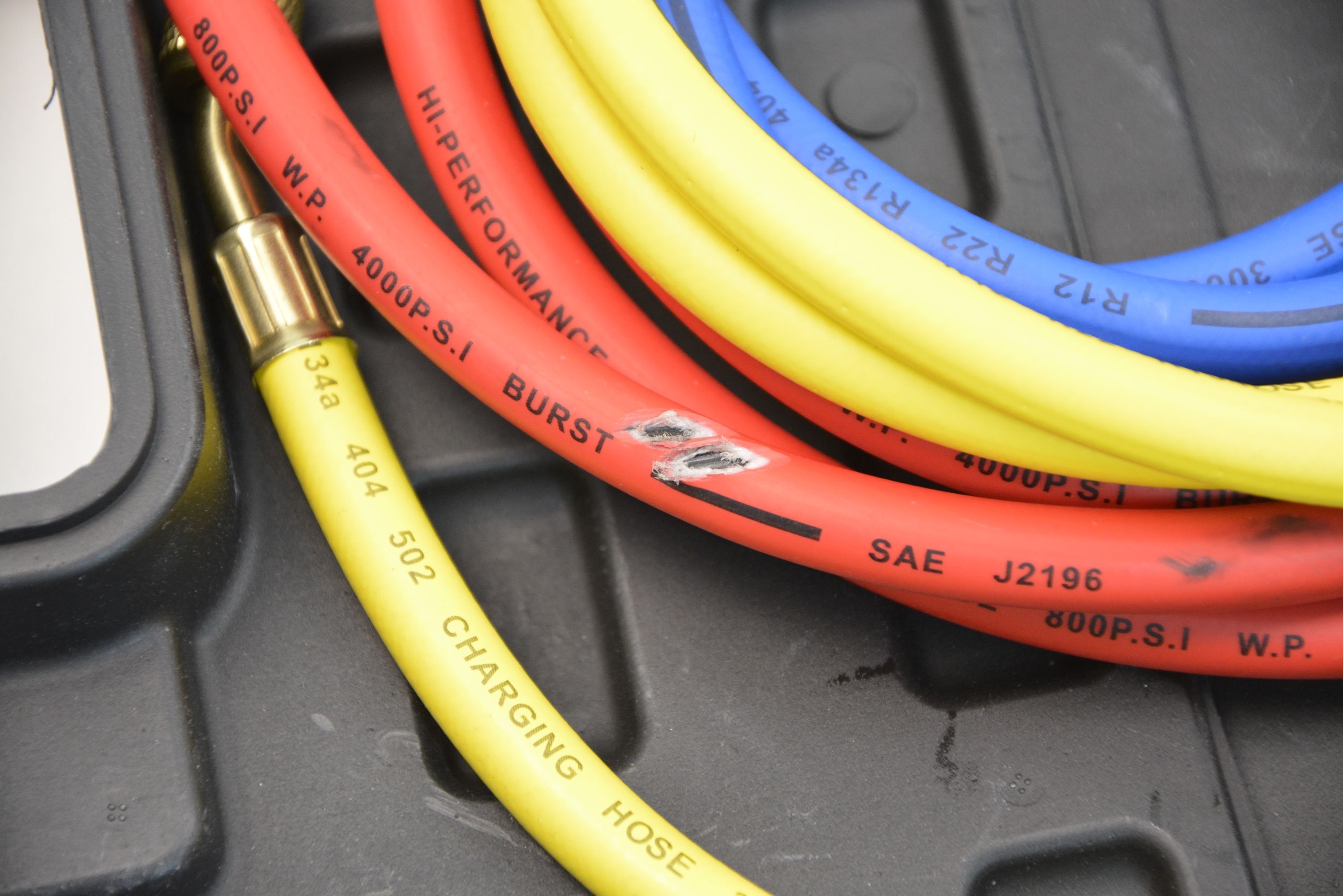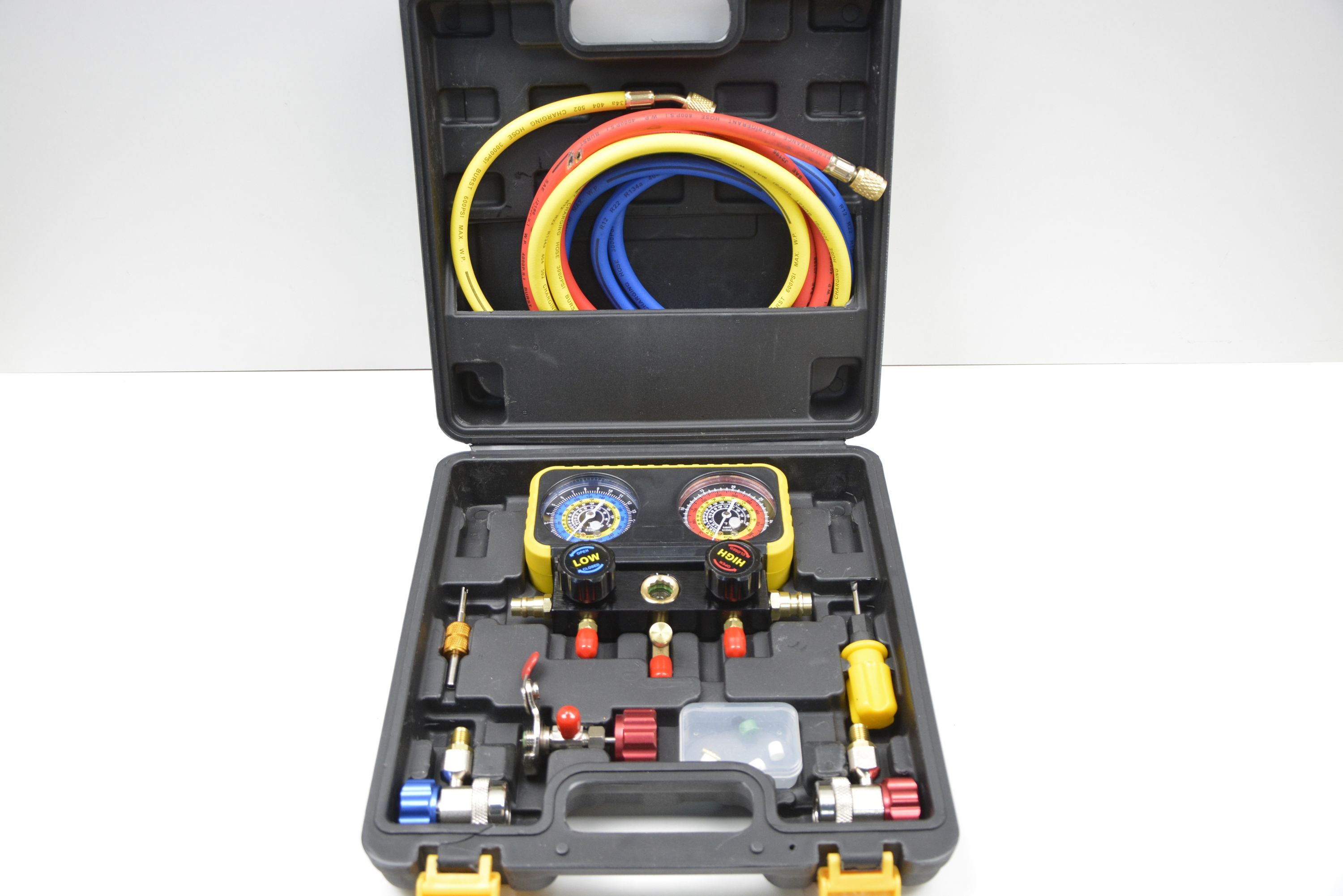Zustand: Gebraucht gut Manometer Set zum Messen von Hoch und Niederdruck in Kfz Klimaanlagen und Kühlsystemen für R1234YF, R134A und R404A Messbereiche: Niederdruck -30 bis 260 PSI, Hochdruck -30 bis 550 PSI 3 farbcodierte Füllschläuche je 1,5 m für übersichtliches Anschlie�en Messgerät aus Messing mit gut ablesbaren, farbcodierten Skalen Zustandshinweis: Ein Schlauch ist durchgescheuert