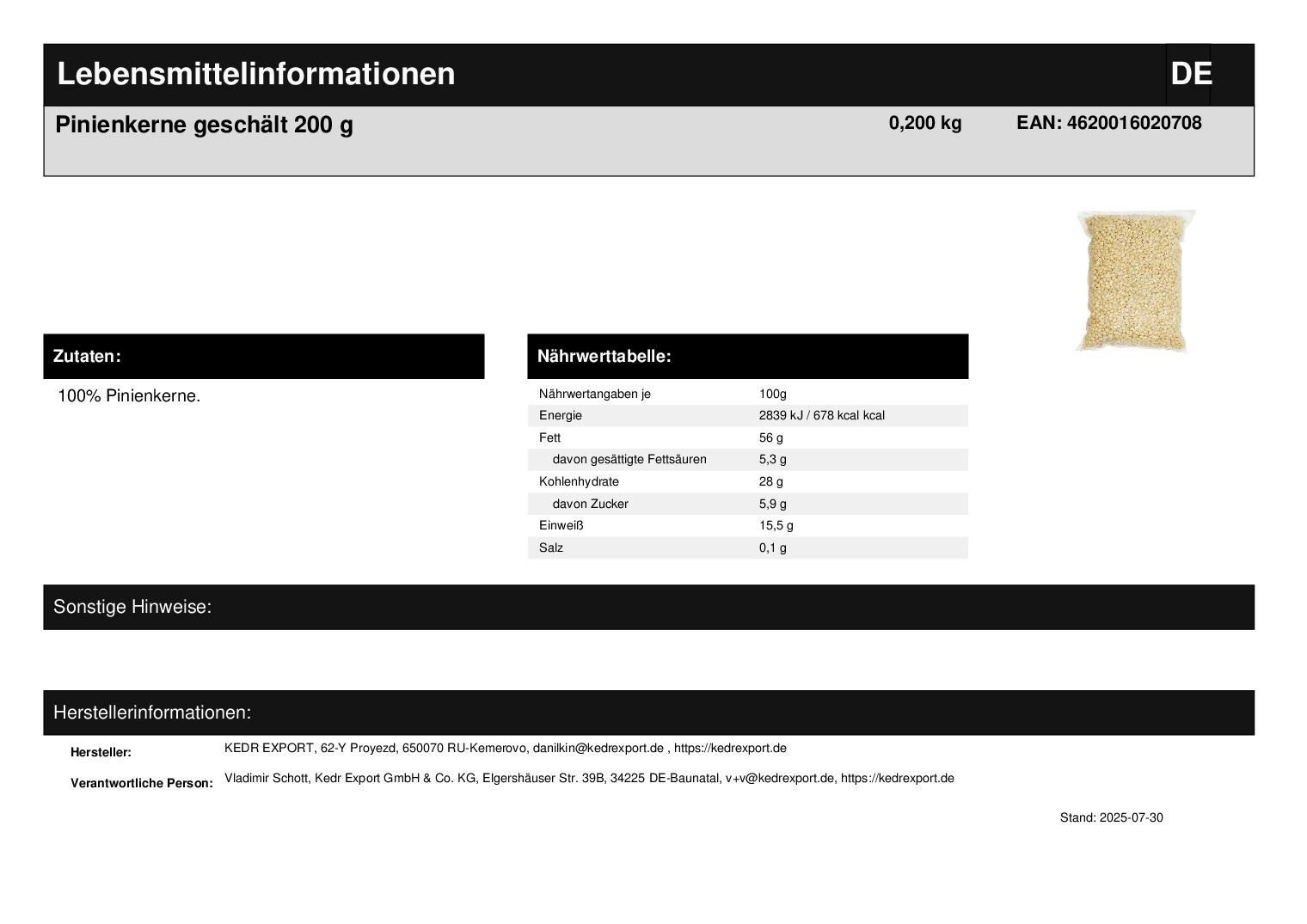 Pinienkerne geschält Zedernkerne aus Russland Pine Nuts Zeder Kiefer 200 g