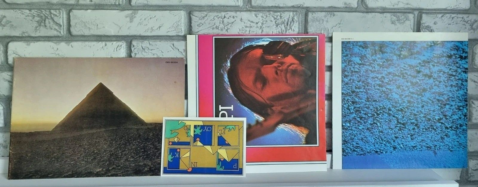 Harvest – EOP-80778, Gatefold Sleeve - late 1973 1st Toshiba-EMI issue with solid blue triangle. Although Toshiba Musical Industries changed their company name to Toshiba-EMI the text around the bottom of the label that starts at 10 o'clock still says: Mfd. by Toshiba Musical Industries Ltd. in Japa
