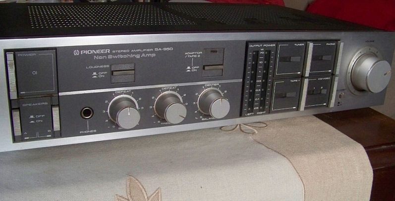 Pioneer Verstärker SA-950 (silber schwarz)so um 1980 gebaut, Ausgangsleistung bei 2x87 W an 8ohm,20-20000 hz - schweres Netzteil mit zusätzlich 3 switched Netzausgängen (=Steckdosen) an der Rückseite für drei weitere Geräte mit zusammen 80 W Stromaufnahme (z.B.Tape,2 Tapes oder Equalizer plus Tuner)