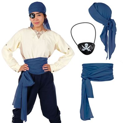 • Piraten Kostüm Set mit Kopftuch, Piratenschärpe & Augenklappe | Blau oder Braun